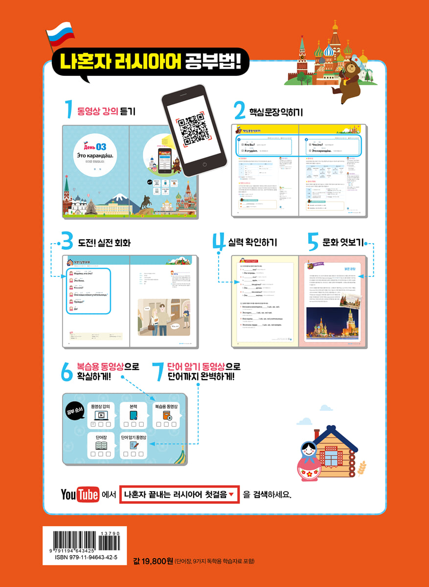 『나혼자 끝내는 독학 러시아어 첫걸음』의 특징 1. 왕초보 독학 학습자를 위한 맞춤형 구성! 16일 만에 러시아어 기초 과정을 완성할 수 있도록 쉽고 알차게 구성했습니다. 러시아어에 한층 흥미가 생기도록 러시아 문화의 재미있는 모습도 함께 살펴볼 수 있습니다. 책 속의 학습 플래너를 활용해 보세요! 2. 풍부한 독학용 학습자료로 발음부터 단어까지! 본책 권말에는 필기체 노트가 수록되어 있어 알파벳부터 단어, 문장까지 필기체를 연습해 볼 수 있습니다. 또한 부록으로 도우미 단어장, 왕초보 그림 단어장이 포함되어 있습니다. 발음 특훈 동영상, 복습용 동영상, 단어 암기 동영상 등 다양한 학습자료도 제공하고 있어 발음을 익히고 단어를 암기할 수 있습니다. 3. 온라인 무료 학습자료 제공! 스마트폰, 넥서스 홈페이지, 유튜브 등에서 원어민 MP3 및 저자 직강 동영상 강의 등을 무료로 제공합니다. (www.nexusbook.com) |