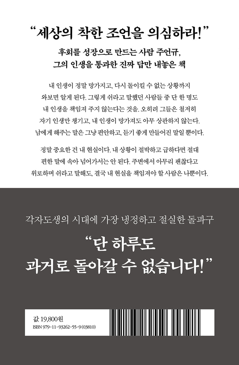 --- p.17 실패했을 때, 가장 먼저 해야 할 일은 ‘누구의 도움을 받을까’가 아니라 ‘내가 지금 가진 것 중에 뭘 지킬 수 있을까’를 생각하는 것이다. 돈과 건강. 이 두 가지는 실패 속에서도 내가 다시 시작할 수 있는 유일한 자산이다. --- p.67 버티는 것은 중요하지만, 아무 근거 없이 무작정 버티는 것은 위험하다. 지표가 있으면 99도가 아니라 30도라고 하더라도 불안하지 않다. 100도까지 가는 길이 분명해지고, 결국 물은 반드시 끓게 된다. --- p.121 사람들은 월급이 들어올 때마다 자신이 ‘한 달 동안 고생해서 번 돈’이라고 생각하지만, 사실 그 월급은 당신의 고생뿐 아니라, 당신의 ‘삶’ 그 자체와 교환한 것이다. 월급을 아무렇지 않게 소비한다는 건, 내 한 달의 삶을 허투루 쓴다는 뜻이다. --- p.182 |