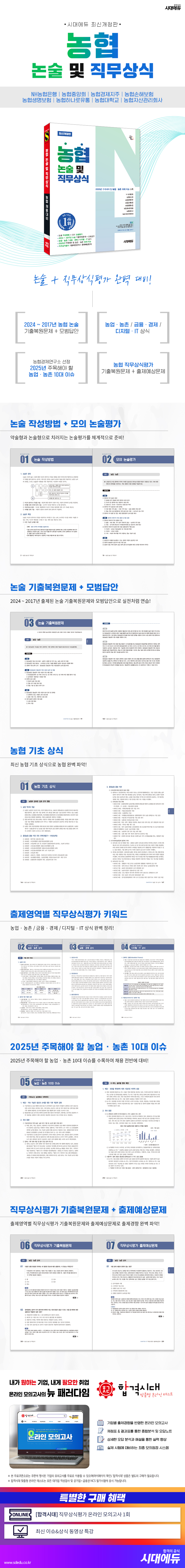 2024 ~ 2017년 논술 기출복원문제를 수록하여 최근 출제경향을 한눈에 파악할 수 있도록 하였으며, 논술 작성방법 및 모의 논술평가를 통해 체계적인 학습이 가능하도록 하였다. 또한 직무상식평가 출제영역인 농협 기초 상식과 농업·농촌 / 금융·경제 / 디지털·IT 상식뿐 아니라 농촌경제연구소 선정 ‘2025년 주목해야 할 농업·농촌 10대 이슈’를 수록하였으며, 직무상식평가 기출복원문제 및 출제예상문제 또한 수록하여 직무상식평가에 완벽하게 대비할 수 있도록 하였다. |