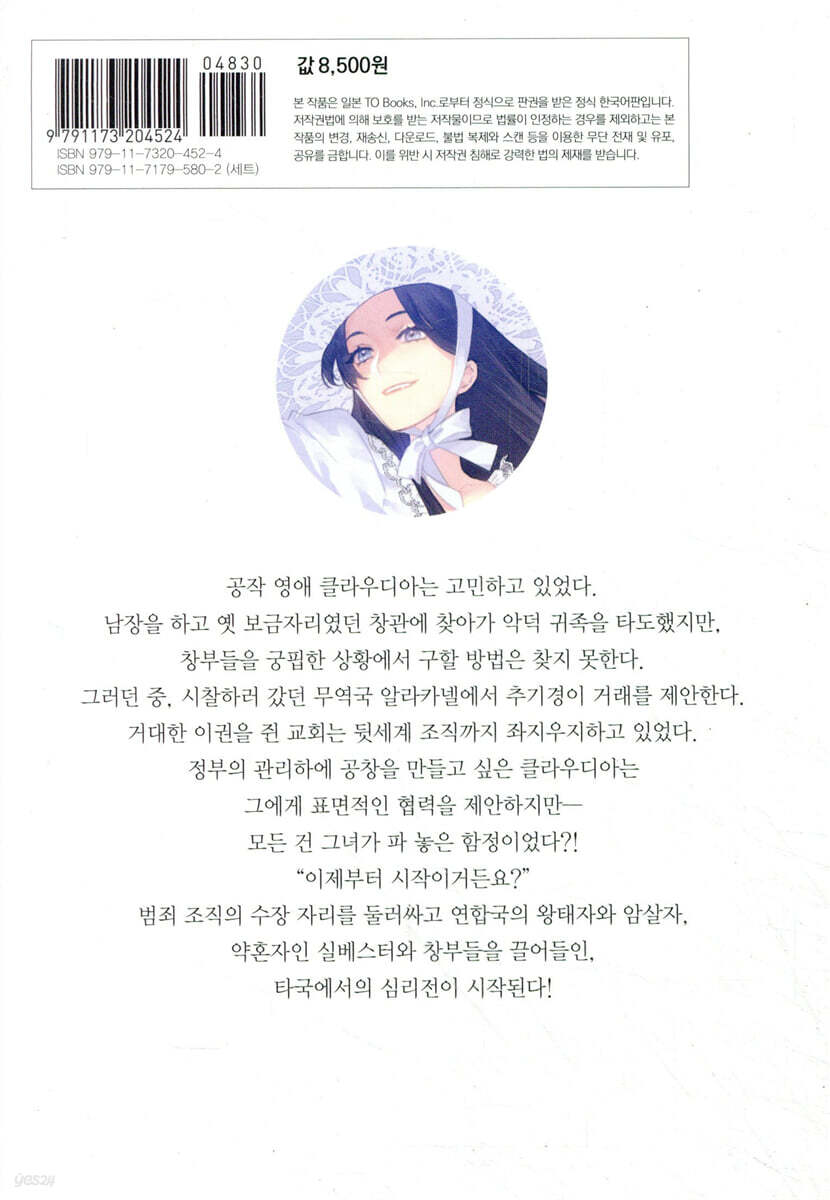프롤로그 악역 영애는 연합 왕국 왕자와 대면한다 연합 왕국 왕자는 손님을 맞이한다 악역 영애는 의분에 휩싸인다 악역 영애는 왕태자 전하와 대면한다 악역 영애는 상인인 남작 영식을 만난다 악역 영애는 연합 왕국에 간다 악역 영애는 연합 왕국 왕자의 의도를 깨닫는다 악역 영애는 추기경을 만난다 악역 영애는 엇갈린다 왕태자 전하는 고민한다 악역 영애는 연합 왕국 왕자에게 상담한다 넘버원 창부는 구원받는다 악역 영애는 상관(商館)을 방문한다 추기경은 생각에 잠긴다 악역 영애는 달린다 암살자는 아픔과 맞바꿔 광명을 찾는다 연합 왕국 왕자는 전우를 바란다 악역 영애는 왕태자 전하와 화해한다 왕태자 전하는 거친 열기에 몸부림친다 악역 영애는 왕태자 전하의 선언을 듣는다 악역 영애는 씁쓸함과 희망을 얻는다 에필로그 연합 왕국 왕자는 동생에게 걷어차인다 추기경은 조용히 웃는다 왕제 전하는 공작 영식과 술잔을 나눈다 암살자는 친형을 만난다 왕태자 전하는 기사단장 영식과 독서에 힘쓴다 |