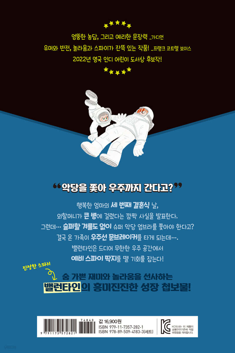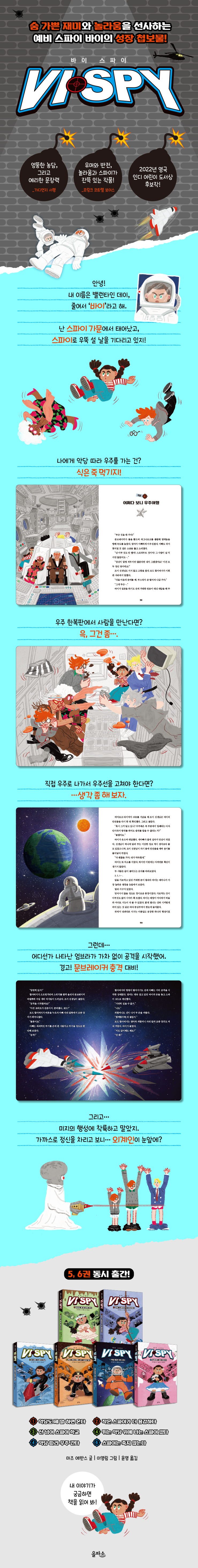 어쩌다 보니 우주여행 스파이 집안에서 태어난 주인공 밸런타인 데이(줄여서 바이). 스파이였던 엄마 이스터 데이와 바이의 담임 선생님 조지 스프라우트의 두 번째 결혼식 날, 외할머니가 불치병에 걸렸다는 사실을 발표합니다. 슬퍼하는 이스터 데이와 바이와 달리 외할머니는 어쩐지 여유가 넘쳐 보입니다. 아픈 할머니가 쉬어야 할 로드 할아버지 집은 북새통을 이루었습니다. 로드 할아버지의 라그나로크에는 나이더스로 향하는 슈퍼 악당 엄브라를 추격할 수 있는 우주선 문브레이커가 있으니까요! 모두 로드 할아버지의 문브레이커를 구경하다가 그만 발사 카운트다운이 시작되고 마는데… 바이의 온 가족이 황당한 우주여행을 시작하게 되는데요? 과연 광활한 우주에서는 어떤 일이 벌어질까요? 엄브라가 뉴로트롤 사용하지 못하게 막을 수 있을까요? 스파이와 악당 들이 선사하는 완벽한 웃음과 반전! 13살 예비(?) 스파이 밸런타인 주위에는 스파이와 악당, 또 괴짜 들이 넘쳐납니다. 이로 인해 여러 가지 문제가 연달아 터지지만, 영국에서 큰 반향을 일으켰던 베스트셀러 시리즈의 작가 마즈 에반스는 오히려 속도감 넘치는 유머로 이야기를 풀어나갑니다. 대를 이어온 스파이 가문에서 태어나 뛰어난 활약을 펼쳤던 스파이 출신의 의심 많은 엄마, 온갖 범죄를 저질렀던 과거를 버리고 이제는 새로운 삶을 살겠다고 선언하며 바이 앞에 모습을 드러낸 친아빠, 그리고 엉뚱한 잡학 선생님 새아빠, 로봇 마니아지만 친엄마와의 사이는 계속 틀어지기만 하는 의붓남매 러셀, 어딘지 수상한 동료 스파이들과 착해지려는 악당까지…. 주변을 둘러싼 개성 넘치는 인물들과 얽히고설킨 관계 속에서 바이는 성장하는 모습을 보여줍니다. 〈바이 스파이〉 시리즈는 엄마 아빠의 이혼과 새 가족의 출현, 그리고 순탄치 않은 학교생활 같은 일상 속 문제와 함께 전 세계적인 범죄 조직의 위협에 맞서 싸우는 예비 스파이 바이의 활약도 담고 있습니다. 가끔은 스파이 엄마처럼, 또 가끔은 악당 아빠처럼, 자신만의 방식으로 고민을 해결해 가는 바이, 그리고 그 곁에 있는 특별하지만 평범한 사람들과 쌓아 가고, 변화하는 관계를 통해 어린이 독자들도 자신만의 장점을 찾고 용기를 얻게 될 것입니다. |