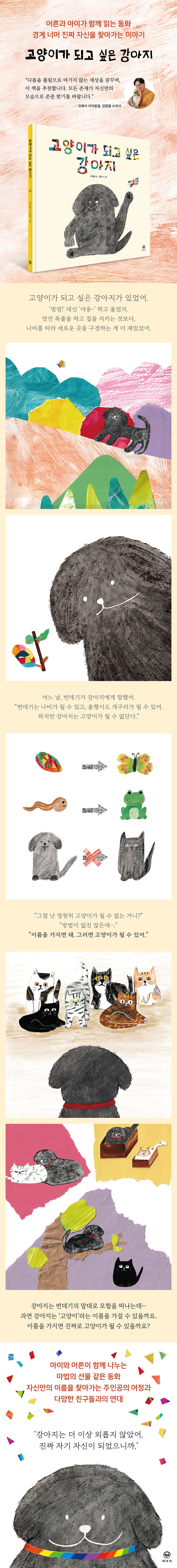 책 속 주인공은 강아지로 태어났지만 고양이가 되고 싶어 합니다. 하지만 세상은 강아지에게 고양이가 될 수 없다고 말합니다. 그러던 어느 날, 주인공은 번데기에게 비밀을 듣게 됩니다. “이름을 가지면 돼. 그러면 너도 고양이가 될 수 있어.” 주인공은 ‘고양이’라는 이름을 얻기 위해 모험을 떠납니다. 그리고 편의점 아저씨, 소년, 소년의 친구들, 호랑나비, 길고양이 등 다양한 친구들을 만나 우여곡절 끝에 결국 자신의 진짜 이름을 찾게 됩니다. 이 책은 세상이 붙여준 이름이 아닌 진짜 자신의 이름으로 살아가고자 하는 존재들을 위한 응원의 메시지입니다. 나는 누구인지, 어디에 있어야 행복한지를 고민하는 이들에게 작은 불빛이 되길 바랍니다. |