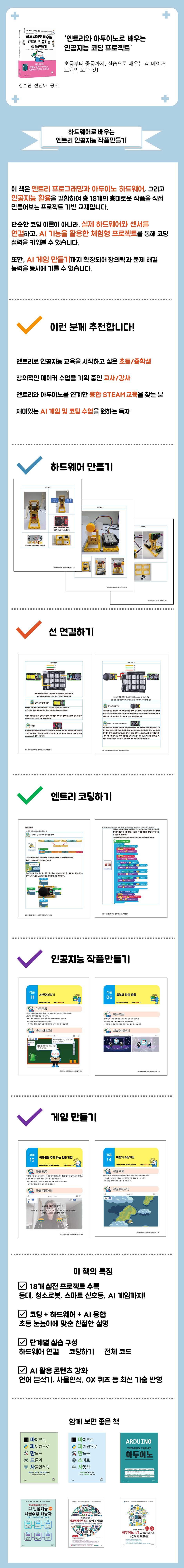 1. 엔트리란? 15 2. 아두이노 토리Kit 모듈이 궁금해요? 39 3. 엔트리로 아두이노 제어하기 43 4. 아두이노로 만들 수 있는 프로젝트 44 5. 엔트리와 아두이노는 왜 배우면 좋을까요? 45 6. 엔트리와 아두이노를 활용한 수업 설계 46 챕터2. 하드웨어로 엔트리 인공지능 작품만들기 작품1. 빛을 만드는 마법 등대 49 하드웨어 연결하기 50 코딩하기 56 전체 코드 60 작품2. 바람소리로 불 끄기 62 하드웨어 연결하기 63 코딩하기 69 전체 코드 73 작품3. 캐릭터 가면 만들기 75 하드웨어 연결하기 76 코딩하기 82 전체 코드 86 작품4. CooL한 운동시스템 89 하드웨어 연결하기 90 코딩하기 96 전체 코드 99 작품5. AI 청소로봇 101 하드웨어 연결하기 102 코딩하기 108 전체 코드 110 작품6. 로봇과 함께 춤을 111 하드웨어 연결하기 112 코딩하기 118 전체 코드 122 작품7. 축구 연습 중계 124 하드웨어 연결하기 125 코딩하기 132 전체 코드 138 작품8. 쓰레기수거로봇 141 하드웨어 연결하기 142 코딩하기 148 전체 코드 152 작품9. 마을 안전 보안시스템 154 하드웨어 연결하기 155 코딩하기 162 전체 코드 167 작품10. 똑똑한 신호등 169 하드웨어 연결하기 170 코딩하기 178 전체 코드 183 작품11. AI언어분석기 185 하드웨어 연결하기 186 코딩하기 196 전체 코드 201 작품12. 사물인식으로 경주하기 203 하드웨어 연결하기 204 코딩하기 210 전체 코드 212 챕터3. 하드웨어로 엔트리 인공지능 게임만들기 작품13. 어깨춤을 추게 하는 핑퐁 게임 215 하드웨어 연결하기 216 코딩하기 223 전체 코드 227 작품14. 비행기 슈팅게임 229 하드웨어 연결하기 230 코딩하기 238 전체 코드 244 작품15. 소방차출동 미로게임 247 하드웨어 연결하기 248 코딩하기 254 전체 코드 258 작품16. 유령 핑퐁게임 260 하드웨어 연결하기 261 코딩하기 268 전체 코드 272 작품17. 연산왕게임 274 하드웨어 연결하기 275 코딩하기 283 전체 코드 286 작품18. 태극기를 찾아라 ox퀴즈 288 하드웨어 연결하기 289 코딩하기 297 전체 코드 300 |
