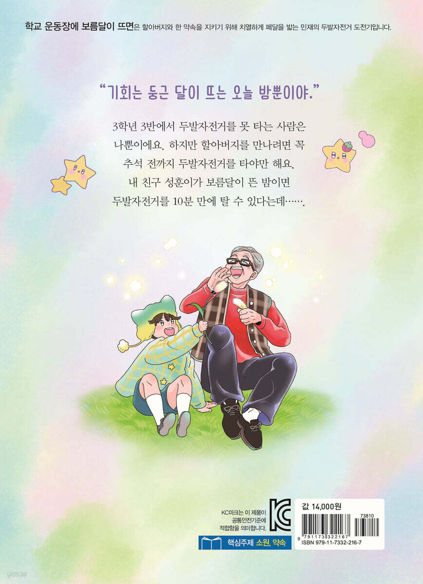 3학년 3반에서 두발자전거를 탈 줄 모르는 사람은 민재밖에 없을 거다. 엄마는 크면서 천천히 배우면 된다고 말지만, 민재에겐 그럴 시간이 없다. 추석에 꼭 두발자전거를 타고 찾아가야 할 곳이 있기 때문이다. 하지만 두발자전거를 타려 하면 꼭 몸이 부들부들 떨리고 힘이 쭉 빠진다. 그런 민재한테 친구 성훈이가 솔깃한 말을 한다. 바로 보름달이 뜨는 밤이면 10분 만에 두발자전거를 탈 수 있다고 하는데……. 둥근 달이 환하게 비추는 밤, 다시 두발자전거 타기에 도전한 민재는 과연 이번엔 성공할 수 있을까?