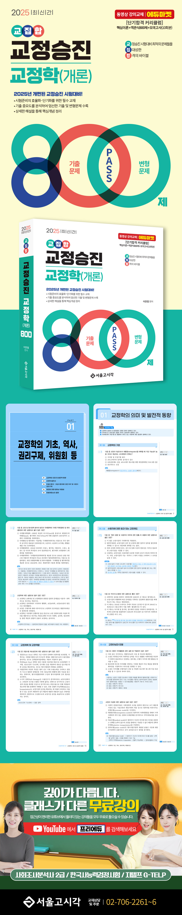 PART 02 형집행법령상 수용 및 이송 등 PART 03 형집행법령상 금품관리 및 물품지급, 의료 등 PART 04 형집행 관련 법령상 의사소통 PART 05 형집행 관련 법령상 교도소 질서, 교정장비, 징벌 등 PART 06 형집행 관련 법령상 과학적 처우(분류심사 등) PART 07 수용자에 대한 교도작업, 교육 등 PART 08 수용자에 대한 가석방(석방), 귀휴, 특별 교도행정 등 PART 09 종합문제 |
