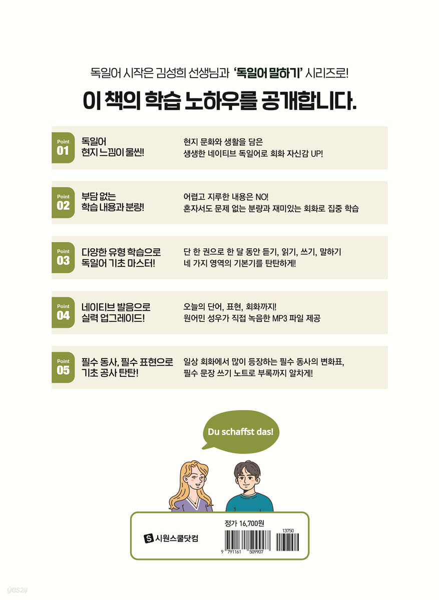 ㆍ 이 책의 구성과 특징 ㆍ 파닉스 01 독일어 알파벳 ㆍ 파닉스 02 독일어 복자음 ㆍ 파닉스 03 독일어 복모음 ㆍ 파닉스 04 독일어 강세 ㆍ 준비하기 01 정관사 ㆍ 준비하기 02 부정관사 ㆍ 준비하기 03 소유관사 ㆍ 준비하기 04 명사의 성과 복수형 ㆍ 준비하기 05 인칭대명사 Lektion 01 Ich lerne Deutsch! 나 독일어 배워! Lektion 02 Ich heiße Seonghee. 나는 성희라고 해. Lektion 03 Arbeitest du jetzt? 너는 지금 일해? Lektion 04 Schlafst du jetzt? 너는 지금 자니? Lektion 05 Spricht er Deutsch? 걔 독일어 해? Lektion 06 Was empfehlt ihr? 너희는 무엇을 추천해 줄래? Lektion 07 Wiederholung 1~6강 복습 Lektion 08 Wir sind glucklich. 우리는 행복해. Lektion 09 Was ist das? 이게 뭐야? Lektion 10 Ich finde den Mann schon. 나는 그 남자를 멋지다고 생각해. Lektion 11 Sie sind Studentinnen. 그들은 여대생이야. Lektion 12 Wiederholung 8~11강 복습 Lektion 13 Sie liebt ihn. 그녀는 그를 사랑해. Lektion 14 Wie geht es dir? 어떻게 지내? Lektion 15 Die Freundin des Lehrers ist Deutsche. 그 선생님의 여자친구는 독일인이야. Lektion 16 Ich helfe den Kindern. 난 그 아이들에게 도움을 줘. Lektion 17 Was ist dein Hobby? 너의 취미는 뭐니? Lektion 18 Ich mag meinen Beruf. 나는 나의 일을 좋아해. Lektion 19 Wiederholung 13~18강 복습 Lektion 20 Was sind Sie von Beruf? 당신의 직업은 무엇입니까? Lektion 21 Ich mochte bestellen. 주문하고 싶어요. Lektion 22 Darf ich mal sehen? 한번 봐도 될까요? Lektion 23 Konnen Sie bitte langsamer sprechen? 조금 더 천천히 말씀해 주실 수 있나요? Lektion 24 Wollen wir Musik horen? 우리 음악 들을래? Lektion 25 Wiederholung 20~24강 복습 Lektion 26 Ich muss Deutsch lernen. 나 독일어 공부해야 돼. Lektion 27 Ich soll die Medikamente nehmen. 나 이 약을 먹어야 한대. Lektion 28 Das ist kein Laptop. 이것은 노트북이 아니다. Lektion 29 Ich weiß es nicht. 잘 모르겠어요. Lektion 30 Wiederholung 26~29강 복습 ㆍ 정답 |