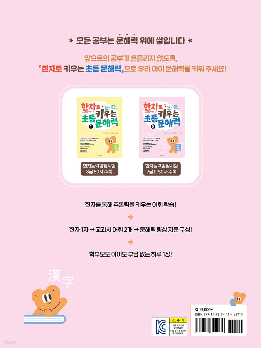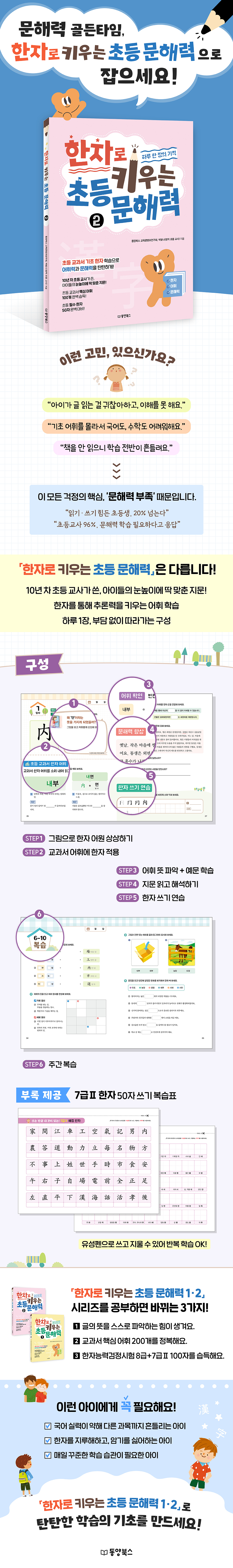 ▶아이가 글 읽는 걸 귀찮아하고, 이해가 안 된다고 해요. 어떻게 도와줘야 할까요? ▶책을 좋아하지 않고, 잘 읽지 않으니 기본 단어조차 모르는 게 많아 걱정이에요. ▶학교에서는 읽기도 잘해야 하고, 쓰는 것도 일정한 속도로 잘해야 하니, 부담이 많아요. ▶저희 아이는 2학년 올라가는데 아직도 국어 시간이 자신 없대요. ▶국어는 그나마 수준이 낮은 편인데, 영어나 수학에서 요구하는 국어 수준이 높아서 걱정이에요. → 이 모든 고민, 어휘력 · 문해력이 부족하기 때문입니다! 실제로 최근 뉴스에 따르면, 다음과 같은 내용을 확인할 수 있습니다. ‘읽기, 쓰기 힘든 초등생 20% 넘어’ ‘초등교사 96%, 초등학생 문해력 학습 필요하다’ ‘초등 저학년, 문해력 발달 골든 타임’ 우리말 어휘의 70%가 한자 어휘이기 때문에, 한자로 어휘의 토대를 단단히 쌓아야 앞으로의 공부가 흔들리지 않습니다. 『한자로 키우는 초등 문해력』 시리즈는 한자를 통해 어휘력ㆍ문해력을 키워 줍니다. 『한자로 키우는 초등 문해력 1, 2』를 공부하면 바뀌는 3가지! ① 글의 뜻을 스스로 파악하는 힘이 생깁니다. ② 초등 교과서 핵심 어휘 200개를 완벽하게 익힐 수 있습니다. ③ 한자능력검정시험 8급+7급Ⅱ 100자를 완벽하게 익힐 수 있습니다. 〈본문 구성 미리보기〉 학습 계획 이번 단원에서 만날 5개의 한자를 미리 확인하고, 한 주간의 학습 계획을 세웁니다. 1단계, 어원 확인 한자 어원이 표현된 그림을 보고, 한자가 만들어진 배경을 자유롭게 상상해 봅니다. 2단계, 초등 교과서 한자 어휘 앞에서 배운 한자의 뜻이 교과서 어휘에 어떻게 들어 있는지 확인합니다. 3단계, 어휘 확인 교과서 어휘와 예문을 연결하며 의미를 정확히 파악합니다. 4단계, 문해력 향상 지문과 문제를 통해 글을 읽고 해석하는 힘을 기릅니다. 5단계, 한자 쓰기 연습 오늘 배운 한자를 획순에 따라 써 봅니다. 6단계, 복습 문제 한 주의 학습이 끝나면, 재미있는 복습 문제를 풀면서 그동안 학습한 어휘를 되짚어 봅니다. [부록] 쓰는 만큼 내 것이 되는! 8급 배정 한자 1권에서 배운 한자 50자를 따로 정리한 표를 제공합니다. 유성펜을 사용해 쓰고 지울 수 있어 여러 번 복습할 수 있고, 부족한 부분을 쉽게 체크할 수 있습니다. |