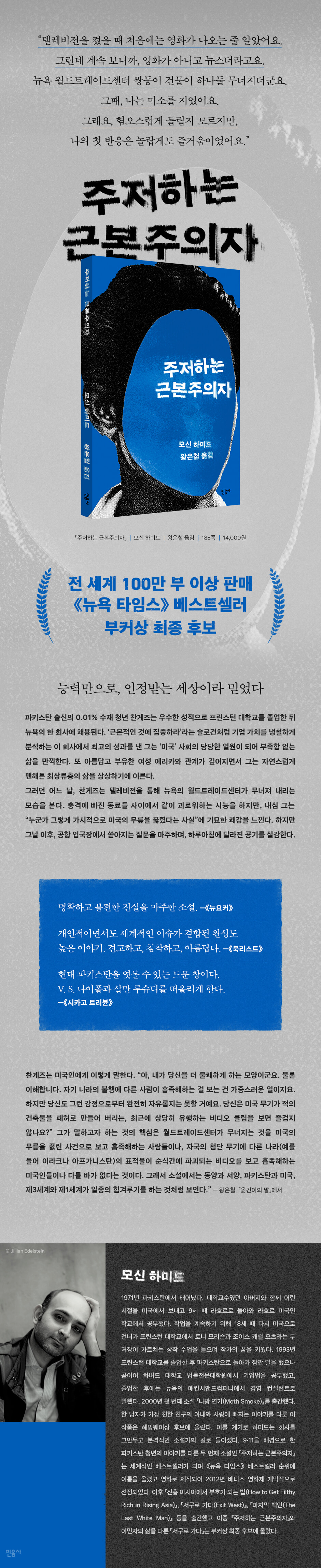 --- p.10 나는 그녀가 이런 식으로 나한테 속마음을 털어놓는다는 사실이 영광스럽고 기뻤어요. 나는 그녀의 눈을 쳐다보았어요. 나는 처음으로 그 뒤에 뭔가 부서진 것이 있는 걸 보았어요. 확대경을 통해 봐야 보이는 다이아몬드의 작은 금처럼 말이죠. 보통 때는 보석의 휘황찬란함에 가려져 있죠. 나는 그것이 무엇인지, 무엇이 그녀로 하여금 그녀가 얘기했던 보석을 만들게 했는지 알고 싶었어요. 하지만 그런 걸 물어보는 건 주제넘은 짓이라고 생각했어요. 그런 것들은 상대가 시간과 대상을 골라 스스로 밝히는 법이니까요. 그래서 나는 그녀를 이해하고 싶은 내 마음을 표정을 통해서 전달할 수밖에 없었어요. 나는 더 이상 아무 말도 하지 않았어요. --- p.54 그런데 얘기 도중에 화가 났던 게 떠오르는군요. 에리카의 아버지가 나한테 우리나라 상황이 어떠냐고 묻더군요. 그래서 나는 상당히 괜찮은 편이라며 관심을 가져 주셔서 고맙다고 말했어요. 그랬더니 그가 이렇게 말하더군요. “경제가 나빠지는 건 아닌가요? 부패에 독재까지 겹치고, 다른 사람들은 고통당하는 데 부자들은 왕자들처럼 살잖아요. 실속 있는 사람들이죠. 내 말 오해하지 말아요. 나는 파키스탄인들을 좋아해요. 하지만 엘리트 계층이 그곳을 제대로 능욕한 건 사실 아닌가요? 그리고 근본주의도 그렇고요. 당신네들은 근본주의 때문에 심각한 문제를 겪잖아요.” --- pp.56-57 다음 날 저녁은 우리가 마닐라에서 보내는 마지막 밤이 될 예정이었어요. 나는 방에서 짐을 싸고 있었어요. 텔레비전을 켰을 때 처음에는 영화가 나오는 줄 알았어요. 그런데 계속 보니까, 영화가 아니고 뉴스더라고요. 뉴욕 월드트레이드센터 쌍둥이 건물이 하나둘 무너지더군요. 그때, 나는 미소를 지었어요. 그래요, 혐오스럽게 들릴지 모르지만, 나의 첫 반응은 놀랍게도 즐거움이었어요. --- p.73 하지만 그 순간, 나는 그 공격의 희생자들을 생각한 게 아니에요. 텔레비전에 나오는 죽음은 그것이 허구적일 때 내 마음을 가장 많이 움직이죠. 여러 일화를 통해 내게 친숙해진 인물이 죽으니까 그런 거죠. 그런데 그 순간은 그게 아니었어요. 나는 그 모든 것의 상징성에 빠져들었던 거죠. 누군가가 그렇게 가시적으로 미국의 무릎을 꿇렸다는 사실에 그랬던 거죠. 아, 내가 당신을 더 불쾌하게 하는 모양이군요. 물론 이해합니다. 자기 나라의 불행에 다른 사람이 흡족해하는 걸 보는 건 가증스러운 일이지요. 하지만 당신도 그런 감정으로부터 완전히 자유롭지는 못할 거예요. 당신은 미국 무기가 적의 건축물을 폐허로 만들어 버리는, 최근에 상당히 유행하는 비디오 클립을 보면 즐겁지 않나요? --- p.74 *“예니체리에 대해 들어 본 적 있나요?” “없습니다.” 그가 설명했어요. “예니체리는 오스만 제국에 사로잡혀 당시에 세계에서 가장 강력한 군대였던 이슬람 군대에서 군사 훈련을 받은 기독교 소년들이었어요. 그들은 사나웠고 대단히 충성스러웠죠. 그들은 그들 자신의 문명을 없애려고 싸웠죠. 그들에겐 돌아설 곳이 달리 없었어요.” --- p.145 *나는 근대적인 예니체리였어요. 미국이 나와 같은 혈족인 나라를 침략하고 또 내 나라가 전쟁 위협에 직면하도록 공모하는 상황에서, 미국이라는 제국의 하인 노릇을 하고 있었으니까요. 물론 나는 몸부림쳤죠! 물론 마음이 찢긴 상태였고요! 나는 언더우드샘슨 사람들, 제국 관리들과 함께 내 운명을 함께하면서도, 후안바우티스타와 같은 사람들에게 동정심을 느꼈죠. 제국이 그 자신의 이익을 위해서라면 아무 생각 없이 삶을 뒤집어엎는 그런 사람들에게 말이죠. --- p.146 |