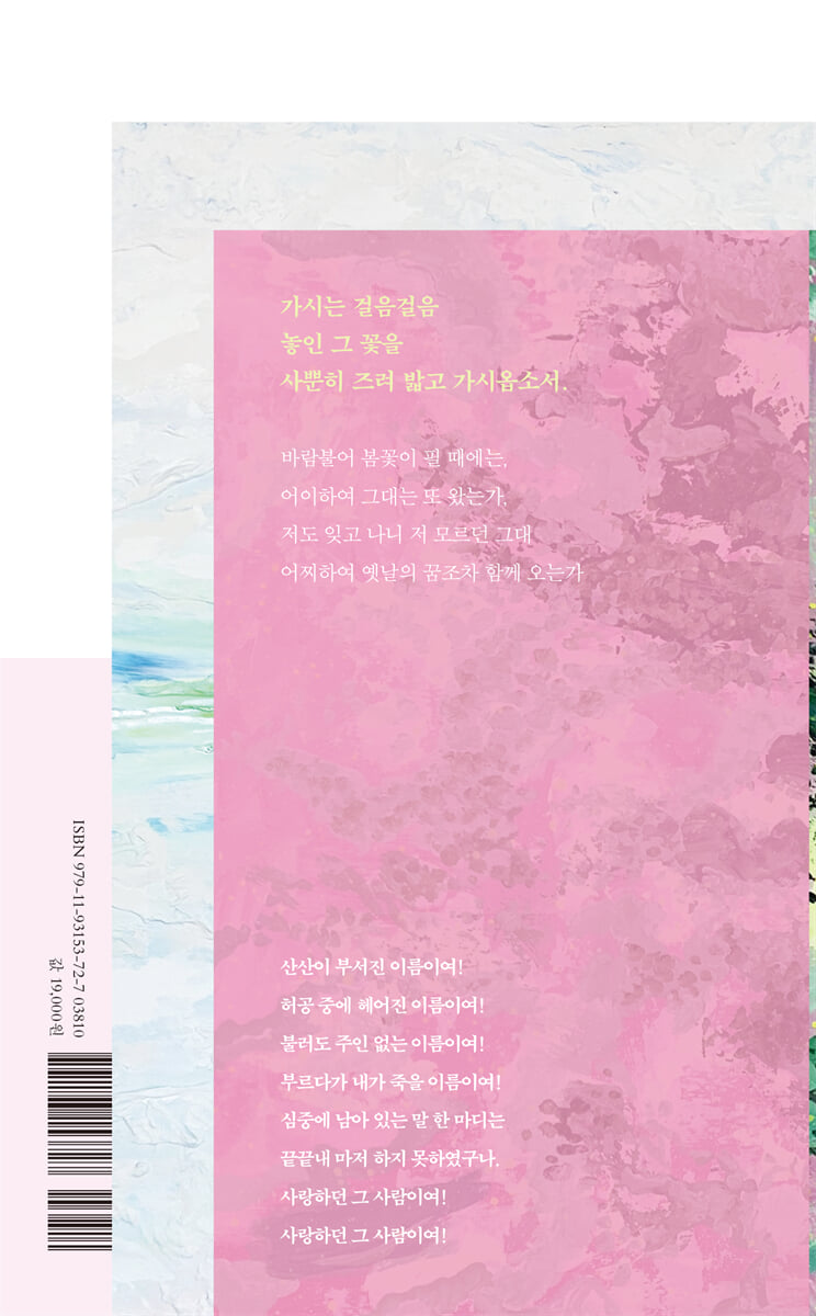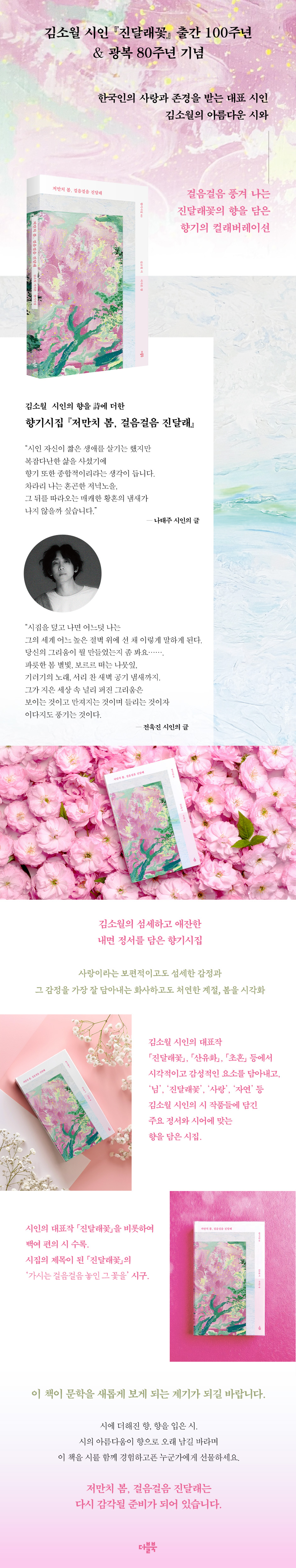 사랑하던 그 사람이여!” 김소월의 섬세하고도 애잔한 정서를 담은 향기시집 김소월 시인의『진달래꽃』시집 출간 100주년이자 광복 80주년을 기념하는 향기시집《저만치 봄, 걸음걸음 진달래》에는 시인의 대표작 「진달래꽃」을 비롯하여 백여 편의 시들이 담겼다. 특히 「진달래꽃」의 ‘가시는 걸음걸음 놓인 그 꽃을’ 시구에서 이번 시집의 제목이 비롯되었다. 이 시집은 시인의 많은 작품에서 대할 수 있는 섬세하고도 애잔한 내면 정서가 스파이시 머스크 우드 향으로 강조되었다. 《저만치 봄, 걸음걸음 진달래》는 김소월 시인을 깊이 깃든 사랑과 슬픔이라는 개인적 정서에 시대적 애환을 절절히 반영하여 더욱 보편적 감정이 생생하게 드러나는 시인으로 조명했다. 시인의 많은 작품에서 드러나는 여성 화자와 대상에 대한 절절한 애정과 동경을 ‘화사하고도 애잔한 봄’의 이미지로 시각화한 것이 이번 시집의 콘셉트다. '1부 샛보얀 그리움, 2부 거뭇한 설움, 3부 송글한 아림, 4부 나릿한 머묾'까지 각각 ‘그리움, 설움, 고향을 떠올리며 느끼는 아리는 정서, 대상을 갈구하며 대상에 머물고자 하는 정서’라는 주제를 아로새긴 시인의 작품들로 사랑이라는 보편적이고도 섬세한 감정과 그 감정을 가장 잘 담아내는 화사하고도 처연한 계절, 봄의 정서를 독자에게 전한다. 나태주 시인과 전욱진 시인이 전하는 김소월 시인의 향기(추천사) 매캐한 황혼의 냄새 윤동주 선생의 시집은 샘물처럼 깨끗하고 새벽처럼 푸르른 향기였으면 좋겠다는 생각을 했습니다. 그렇다면 김소월 선생의 향기시집은 어떤 향기가 나면 좋을까요? 언뜻 진달래꽃 향기. 은은하고 부드럽고 사랑스런 향기. 하지만 김소월 선생에게서 나는 향기는 그렇게 단일의 향기만은 아닌 것 같습니다. 출판사의 스스로 평가와 설명은 그렇습니다. ‘봄의 싱그러움과 달콤함을 은은하게 표현했습니다.’ 글쎄요. 김소월 선생의 향기는 그렇게 단순하기만 할까요? 시인 자신이 짧은 생애를 살기는 했지만 복잡다난한 삶을 사셨기에 향기 또한 종합적이리라는 생각이 듭니다. 차라리 나는 혼곤한 저녁노을, 그 뒤를 따라오는 매캐한 황혼의 냄새가 나지 않을까 싶습니다. 어쨌든 좋습니다. 출판사의 의도나 조향사는 비록 그런 의도로 향기를 제공했다지만 시집을 펼쳐 향기를 맡는 독자들은 한 가지의 향기만이 아니라 여러 가지의 향기를 더불어 맡아주었으면 하는 것이 나의 소망이며 나의 숨겨진 은근한 소감입니다. 윤동주 선생의 향기시집에 이어 김소월 선생의 향기시집까지 만날 수 있게 되어 내 일처럼 기쁘고 반갑습니다. 향기시집 안에서 우리 만나서 서로 웃고 느끼고 행복했으면 합니다. 당신의 그리움이 뭘 만들었는지 좀 봐요 시詩는 말하지 않음으로써 말한다. 그러나 말해야만 하는 것을 전부 ‘말해내는’ 것이기도 하다. 소월의 시가 꼭 그렇다. 백 년 전에 나타난 이 시인은 종이 위에 가감 없이 그리고 아름답게 토로했다. 만남과 헤어짐이 끊임없이 교차하는 삶의 방식을 이해했으며 그 과정에서 “도적같이 달려드는 슬픔”(「바닷가의 밤」)을 응시했고, 자신의 “깊이 믿던 심성”(「깊이 믿던 심성」)을 탓하지 않았다. 그리하여 백 년이 지난 오늘날 보아도 갓 지어진 세계를, 소월은 완성했다. 시집을 덮고 나면 어느덧 나는 그의 세계 어느 높은 절벽 위에 선 채 이렇게 말하게 된다. 당신의 그리움이 뭘 만들었는지 좀 봐요……. 파릇한 봄 별빛, 보르르 떠는 나뭇잎, 기러기의 노래, 서리 찬 새벽 공기 냄새까지. 그가 지은 세상 속 널리 퍼진 그리움은 보이는 것이고 만져지는 것이며 들리는 것이자 이다지도 풍기는 것이다. 나는 소월의 세계 앞에서 나 홀로 지녔다고 여긴 희부연 그리움이 결코 혼자만의 것이 아님을, “이 나의 맘에 속에 속 모를 곳에/ 늘 있는”(「맘에 속의 사람」) 무연한 정서가 실은 백 년 전의 시인이 개여울에 던지던 꽃부리였음을 깨닫는다. 그렇게 이 세계가 언제나 내가 다시 돌아올 세계임을 느끼면서, 그러니까 온몸으로 감각하면서 “석양 손에/ 고요히 조으는 한때”(「추회追悔」)가 마치 일곱 번째 날처럼 먼 옛날 그에게 주어졌기를 그리고 다가올 미래의 나에게도 주어지기를 기대한다. 지금은 다른 세상이 된 이들과 우리가 집이라고 부르던 모든 순간을 “맘이 물이라/ 저절로 차츰 잊고”(「흘러가는 물이라 맘이 물이면」). 그렇게 흘러오는 백 년 전의 꽃잎을 주워 보면 문득 내 손안에 조약돌로 쥐어져 있다. 나는 우리가 언어라고 일컫는 이 예쁜 돌들을 가지고 탑을 쌓는 중이다. 이것이 백 년 후 누군가에게 새 눈이 새 빛이 새 바람이 새 꿈이 그리고 새 시가 되기를, 기도하는 마음으로. |