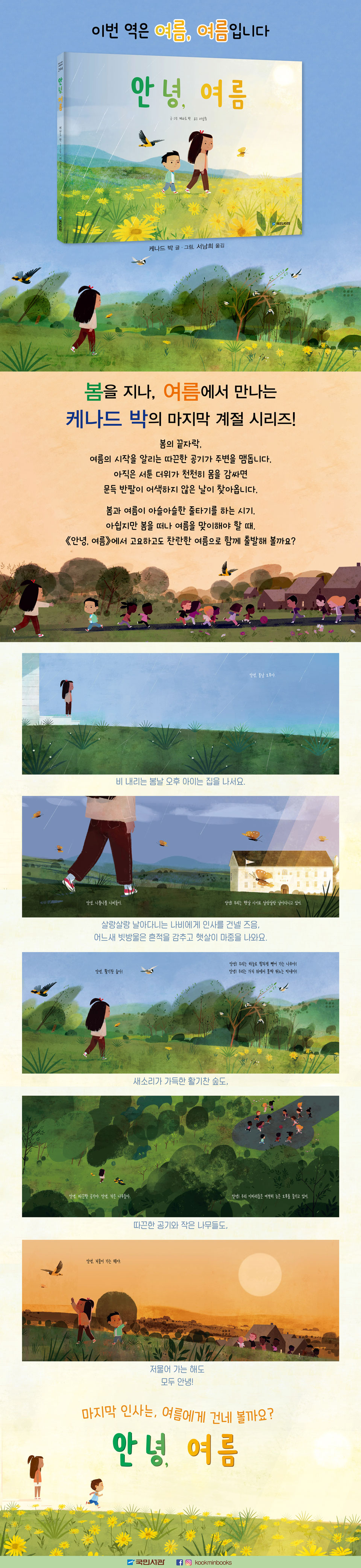일 년을 주기로 순환하는 자연의 아름다움과 경이로움은 매년 겪어도 놀랍습니다. 특히 우리나라처럼 사계절이 뚜렷한 곳에서는 더욱 그렇지요. 이파리가 진한 초록색 옷을 입고, 내리쬐는 햇살에 그늘은 소중해지고, 붉은색 황혼이 길어지면 우리는 봄이 지나고 여름이 오고 있다는 것을 느낍니다. 《안녕, 여름》은 아이의 눈높이에서 여름이 오면 자연에 어떤 변화들이 일어나는지 포착한 그림책입니다. 아이의 발길을 따라가다 보면 이리저리 자라난 초록 풀들, 자유롭게 날아다니는 나비와 새들, 늦은 오후 햇살 아래 뛰노는 아이들 등 여러 모습으로 우리를 찾아온 여름을 만날 수 있습니다. 《안녕, 여름》으로 완성된 사계절의 순환 드림웍스와 월트디즈니 출신의 한인 애니메이터 케나드 박의 첫 그림책인 《안녕, 가을》은 출간 직후 아마존 계절그림책 분야 1위에 오르며 미국 출판계의 주목을 받았습니다. 한적한 시골 풍경과 자연, 새를 주로 그리는 그는 디지털 그림 안에 따뜻함을 담아 자신만의 독특한 그림체를 완성시켰습니다. 여기에 “안녕” 하며 인사를 주고받는 반복적이면서 리드미컬한 대화는 몰입도 높은 이야기를 더해 줍니다. 간결하면서도 정확한 묘사, 온화한 그림으로 그려 낸 ‘여름’ 풍경은 어떤 모습일까요? 사람들은 자연의 순환과 반복 안에서 살아갑니다. 계절에 따라 자연이 어떻게 변하는지 안다면 자연과 더불어 조화롭게 사는 법을 알 수 있겠지요. 봄, 여름, 가을, 겨울 사계절은 모두 아름답지만 여름은 그중 가장 활기찬 계절입니다. 따끈해진 공기 속 매미 울음이 파도처럼 밀려오고, 타오르는 태양 아래 이마를 타고 흐르는 땀방울이 목덜미를 간지럽히지요. 봄에게 작별 인사를 하고, 가벼워진 옷차림으로 여름에게 반갑게 인사해 주세요. “안녕, 여름!” 하고 말이에요. |