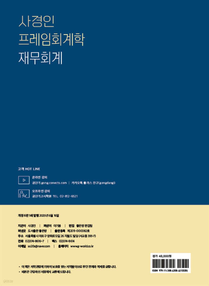저자 사경인 교수는 공단기 대표 회계학 교수로서 오랜 실무와 강의 경험을 토대로 기존 수험서의 문제점을 날카롭게 지적하고, 이를 보완하기 위해 2년간 공들여 이 책을 집필했습니다. 특히 원문의 딱딱하고 난해한 문장을 친절하고 실생활의 사례를 곁들인 문장으로 풀어내 수험생의 이해도를 획기적으로 높였습니다. 이 책은 모든 내용을 일관된 ‘프레임(Frame)’으로 구성해 학습의 방향성과 체계를 잡아주는 것이 큰 특징입니다. 회계학은 프레임의 학문이라 불립니다. 수많은 계정과목의 복잡한 회계처리를 개별적으로 외우기보다는 몇 개의 일관된 원칙과 구조만 익히면 실전문제에서 당황하지 않고 풀이가 가능하다는 점에서, 이 책의 프레임 중심 구성은 수험생에게 강력한 무기가 될 것입니다. 복습을 돕는 구성도 탁월합니다. 강의에서 사용되는 설명과 예시를 최대한 교재에 반영해 강의를 들으며 이해했던 내용이 언제든 책만 펴도 떠오를 수 있도록 구성했습니다. 강의가 없어도 책만으로도 충분히 학습과 복습이 가능하며, 요약과 단권화는 별도의 『빈칸노트』로 보완하여 기본서에서는 내용의 이해에 집중하도록 설계했습니다. 또한 최근 K-IFRS 도입 이후 변화한 공무원 회계학 시험 출제경향과 유형에 맞춰 최신 개정 기준을 반영했으며, 기출문제 연도 및 출제횟수, OX 예상지문, 인출과제, 주요 기출문제와 연습문제, 심화/보론 코너 등을 배치해 단계적 학습이 가능하도록 구성했습니다. 그 결과, 이 책은 회계학 입문자부터 고득점 전략 수험생까지 모두 만족할 수 있는 균형 잡힌 수험서로 자리매김할 것입니다. 홍보하지 않아도 수험생이 스스로 알아볼 것이라는 저자의 자신감처럼, 회계학 수험서의 새로운 기준이 될 『2026 사경인 프레임회계학 재무회계 기본서』는 반드시 수험생 여러분의 책상 위에 있어야 할 필독서가 될 것입니다. |
