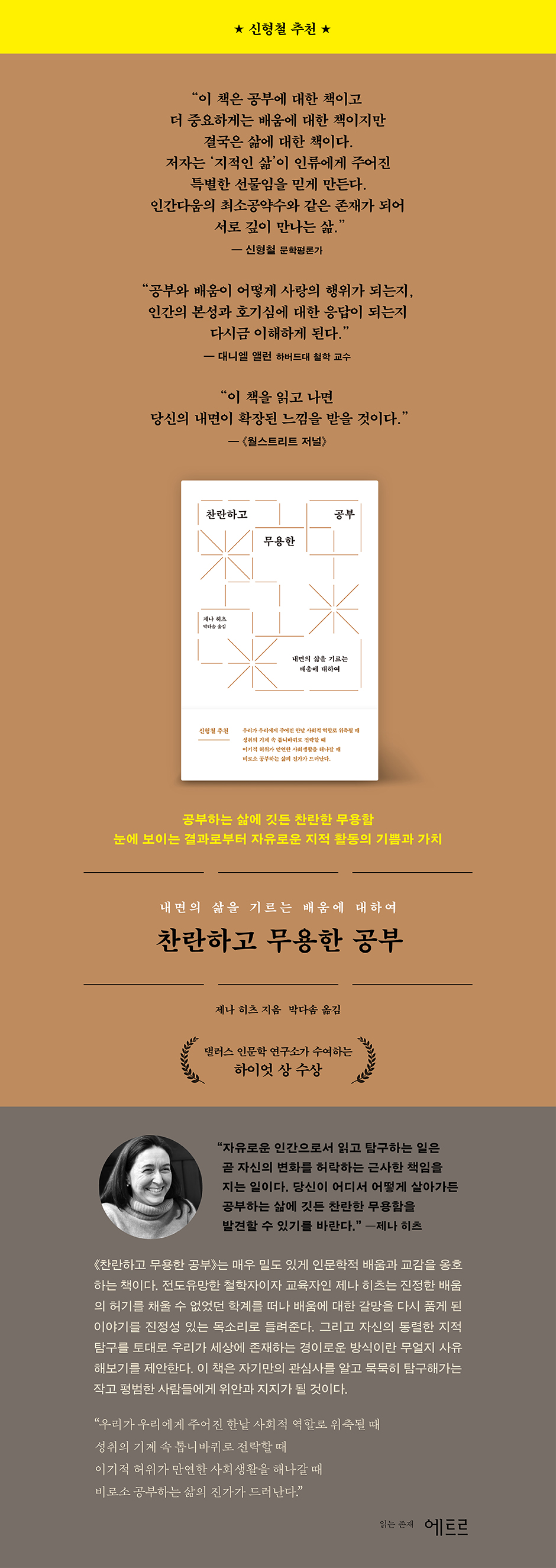 “우리 안의 무언가는 ‘배움을 위한 배움’을 원한다” “명성과 위신, 부, 사회적 쓸모와 같은 과시적 요소를 모두 걷어내고 나면 배움은 어떤 모습을 하고 있을까? 다시 말해, 배움이 그로써 생겨나는 외적 결과가 아니라 배우는 사람에게 미치는 영향으로 인해 그 자체로 미덕이 되는 건 어째서일까? (…) 인간에게 그 자체로 가치 있는 것이 무엇인지에 관한 질문은 인간이 어떤 존재이며 무엇이 우리의 궁극적 가치인지와 관련이 있다.”(p.54-56) 내면의 삶을 기르는 배움에는 하나의 단서가 붙는다. 세상으로부터 물러나 “숨겨져 있으며, 경제적 사회적 정치적 결과를 생산해야 한다는 압박에서 자유로워야 한다”(p.45)는 것. 이를 실천하기란 어렵지만 그럼에도 이에 근접하려고 노력해야 진정한 배움에 이를 수 있고, 그럴 때에야 ‘찬란한 무용함’을 발견할 수 있다는 것. 인간은 참된 것을 보지 못하게 방해하는 ‘세상으로부터 물러나’ 자기 안으로 침잠해 들어가 무언가의 본질을 ‘깊이 사유하는’ 과정, 즉 ‘관조’를 통해서만 이 찬란한 무용함에 이를 수 있다. 고대 그리스철학을 오랜 세월 공부한 저자는 내면의 삶을 기르는 배움을 이야기하기 위해 플라톤과 아리스토텔레스의 사상을 본받아 ‘여가’와 ‘관조’의 의미를 현대적으로 해석해낸다. 저자에 따르면, 여가는 인간의 모든 노력이 귀결되는 내면의 공간이고, 여가는 오로지 관조하는 것, 즉 세상을 있는 그대로 보고 이해하고 음미하는 데서 구현된다. 관조는 한 사람의 삶에서 매우 핵심적인 부분이다. 저자는 여가와 관조를 비롯해 배움에 대한 사랑을 실천하려는 욕구가 평범한 인간의 특징임을 강조한다. 이를 뒷받침하기 위해 ‘배움 자체를 위한 배움’을 추구하며 고유한 내면의 삶에 다다른 이들의 인상적인 사례를 풍요롭게 들려준다. 영화 〈고슴도치의 우아함〉의 주인공은 사람을 겉모습으로만 평가하는 세상으로부터 물러나 독서의 세계로 들어가 자신의 존엄을 지킨다. 학계에서 일자리를 찾는 데 실패한 아인슈타인은 7년간 특허사무소 직원으로 일하면서 남는 시간에 물리학계를 뒤집을 중대한 논문들을 썼다. 수학자 앙드레 베유와 정치사상가 안토니오 그람시는 교도소 수감 중에 탁월한 지적 성취를 이뤄냈다. 이 밖에도 부에 철저히 무관심한 채 철학적 논의에만 빠져 있는 소크라테스, 통렬한 자기 고백을 통해 내면의 성찰을 보여준 아우구스티누스, 책에서 길을 찾으며 가난한 자들 편에서 사회운동을 한 도러시 데이 등 세상을 관조함으로써(성찰함으로써) 헛된 기대와 환상에 휘둘리지 않고 자기만의 배움의 길을 묵묵히 걸어간 인물들이 등장한다. 또한 저자는 엘레나 페란테의 소설 ‘나폴리 4부작’을 심도 있게 읽어내는데, 예술적 창작으로 자기 초월에 이르는 등장인물을 통해 지적인 삶의 찬란한 무용함에 대한 이해를 돕는다. 자기만의 관심사를 발견하고 묵묵히 탐구해가는 작고 평범한 사람들에게 위안과 영감이 될 책 삶을 구하는 공부, 그로써 회복하는 인간성 “배움과 공부가 전문 지식인들의 전유물은 아니지만, 학자들이 배움과 공부의 공식 수호자인 것은 사실이다. 하지만 나는 이 책을 지적 관심사가 있는 비전문적인 대중이 읽기를, 그들 역시 이 책에서 자신의 모습을 발견할 수 있기를 바란다.”(p.86) 세파에 흔들리지 않는 단단하고 안전한 내면을 기르는 공부는 엘리트의 전유물이 아니라 인류 전체의 유산이다. “지적인 삶의 주인은 다른 누구도 아닌 평범한 사람이다.”(p.316) 퇴근 후 책 속 무한의 세계로 빠지는 겸허한 독서광, 휴일에 숲으로 새를 만나러 가는 아마추어 탐조가, 한평생 나무만을 그리는 화가, 인생의 의미를 찾아 온 세상을 여행하는 방랑자, 갑자기 수학의 재미에 눈을 떠 숫자의 비밀이 알고 싶어진 십대 아이 등 우리 주변에서 만날 수 있는 작고 평범한 사람들이 ‘지적인 삶’의 주인이다. 자기만의 관심사를 발견하고 묵묵히 탐구해가는 중에 세상으로부터 잠시 물러나 자기만의 내면으로 몰입하는 순간의 기쁨을 경험한 적 있는 사람에게 이 책은 든든한 위안과 영감이 될 것이다. 어떤 사람들은 자신이 특별히 지적 활동을 하고 있다고 의식하거나 그에 대해 특별한 자부심을 느끼지 않을 수도 있다. 그러나 자신이 ‘좋은 삶’을 추구하는 사람이면 누구든지 넓고 깊은 배움의 곁에 가까이 다가가 있음을 알아차리게 될 것이다. 사유를 즐기는 평범한 사람이라면 가능한 일이다. 현재 우리가 살아가는 세상에서는 거의 모든 것이 유용성이라는 잣대로 평가받는다. 유용하지 않으면 무용한 것이다. 무용함은 경쟁력이 없는 것이고, 경쟁력이 없으면 사회에서 도태되기 십상이다. 인간은 언제나 경쟁의 사다리에서 떨어지지 않으려 안간힘을 쓰며 타인을 밟고서라도 위로 올라가려고 애쓴다. 이러한 사회에서는 공동체의 가치가 훼손되는 것은 물론이고, 인간성 상실은 시간문제다. 저자는 유용성이 경제적 가치로만 환원되는 고통 가득한 세상에서 가시적 결과를 낳지 못하는 공부가 왜 중요하고, 우리 공동체의 망가진 부분을 수선하고 밀려오는 파국을 막아내는 