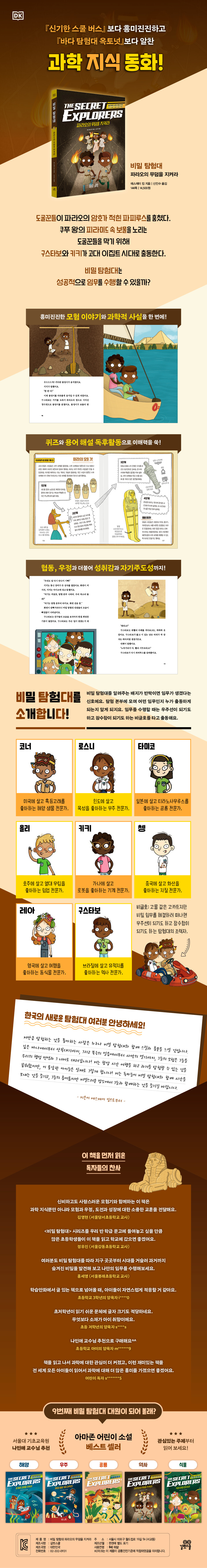 아마존 어린이 소설 베스트 셀러 『비밀 탐험대』 시리즈는 세계적인 지식 교양서 명가인 영국 DK 출판사에서 기획한 동화책으로, 영미권에서 50만 부가 판매되고 15개국으로 판권이 수출된 아마존 베스트셀러입니다. 국내에서는 영어 원서 읽기 챕터북로 이미 많은 독자가 이야기의 매력에 빠진 『비밀 탐험대』 시리즈가 한국에서 출간되었습니다. 나침반 배지가 반짝이면 탐험 본부로 모이는 비밀 탐험대를 따라 임무를 수행하기 위해 출동하고 임무를 수행하는 과정을 빠르게 전개되는 이야기 구조로 보여줍니다. 다양한 장면 변화와 흡입력 있는 이야기 전개는 한 권의 책을 집중해서 읽을 수 있도록 하고, 완독에 대한 자신감과 성취감을 얻을 수 있습니다. 협동과 우정의 중요함이 담긴 이야기 지식 정보와 퀴즈, 용어 해설로 풍부한 독서 경험 해양, 우주, 역사 등 흥미로운 주제를 다루고 있는 『비밀 탐험대』 시리즈는 이야기를 따라 읽다 보면 자연스럽게 다양한 지식까지 알 수 있는 지식 동화입니다. 책의 뒷부분에는 ‘탐험 대원이 적은 탐험 기록’을 통해 이야기의 배경이 된 과학, 역사 지식에 대한 정보를 알 수 있습니다. 또 이야기 내용을 한 번 더 생각해 볼 수 있는 ‘퀴즈’, 관련 용어를 설명해 주는 ‘용어 해설’을 통해 더욱 풍부한 독서를 경험할 수 있습니다. 2명씩 짝을 지어 임무를 수행하는 ‘비밀 탐험대’는 그 과정에서 서로 힘을 합쳐 어려움을 해결하기도 하고, 탐험 본부의 다른 대원들에게 도움을 청하기도 합니다. 다양한 관심사를 가진 탐험 대원들을 이해하고 존중하는 모습을 읽으며 우정에 대해서도 생각해 보게 됩니다. 고대 이집트 시대로 출동한 비밀 탐험대는 파라오의 무덤을 지킬 수 있을까? 『비밀 탐험대: 파라오의 무덤을 지켜라』에서 역사 전문가인 구스타보는 박물관에서 자원봉사를 하던 중 나침반 배지가 반짝이는 순간을 만나게 됩니다. 탐험 본부에 모인 비밀 탐험대 대원들은 임무를 기다렸고, 구스타보와 기계 전문가 키키가 뽑혔습니다. 구스타보와 키키는 유명한 탐험가이자 박물학자인 찰스 다윈이 탔던 배에서 이름을 딴 ‘비글호’를 타고 임무를 수행하기 위해 출동합니다. 강물 위 배로 변신한 비글호는 고대 이집트 시대에 도착합니다. 구스타보와 키키는 필경사가 되고 싶은 베크를 만나 고대 이집트의 글자인 히에로글리프와 파피루스에 대해 알 수 있었습니다. 파라오의 암호가 적힌 파피루스를 훔친 도굴꾼들은 쿠푸 왕의 피라미드 속 보물을 노리고 있었습니다. 구스타보와 키키는 피라미드 속 보물을 지키고 도굴꾼들을 막기 위해 위험한 계획을 세우게 됩니다. 구스타보와 키키는 도굴꾼들을 막고 파라오의 무덤을 지킬 수 있을까요? 직관적인 이야기와 간결한 삽화로 읽기 쉬운 형식의 올컬러 챕터북 『비밀 탐험대』 시리즈는 총 8개 장의 이야기로 구성된 챕터북 형식으로, 동화책 읽기가 낯선 어린이들에게도 1개 장씩 읽다 보면 동화책 읽기에 자신감도 얻고 완독의 보람도 선사합니다. 또한 페이지마다 들어간 생생한 컬러의 그림들과 함께 이야기를 읽으면 지식 정보도 자연스럽게 알게 되고 이야기의 흐름과 재미를 놓치지 않을 수 있습니다. [작가의 말] 한국의 새로운 탐험대 여러분 안녕하세요! 저만큼 탐험하는 것을 좋아하는 사람은 누구나 비밀 탐험대와 함께 스릴과 흥분을 느낄 것입니다. 깊은 바다에서부터 산꼭대기까지, 그리고 북극의 얼음에서부터 사막의 열기까지, 그들의 모험은 그들을 우리의 행성 전역과 그 너머로 데려갑니다! 저는 항상 시간 여행을 하고 과거를 탐험할 수 있는 것을 꿈꿔왔지만, 이 용감한 아이들은 실제로 그렇게 합니다! 저는 독자들이 비밀 탐험대와 함께 시간을 보내는 것을 즐기고, 그들의 흥미롭지만 비밀스러운 장소에서 그들과 함께하는 것을 즐기길 바랍니다. - 지은이 에스제이 킹으로부터 - |