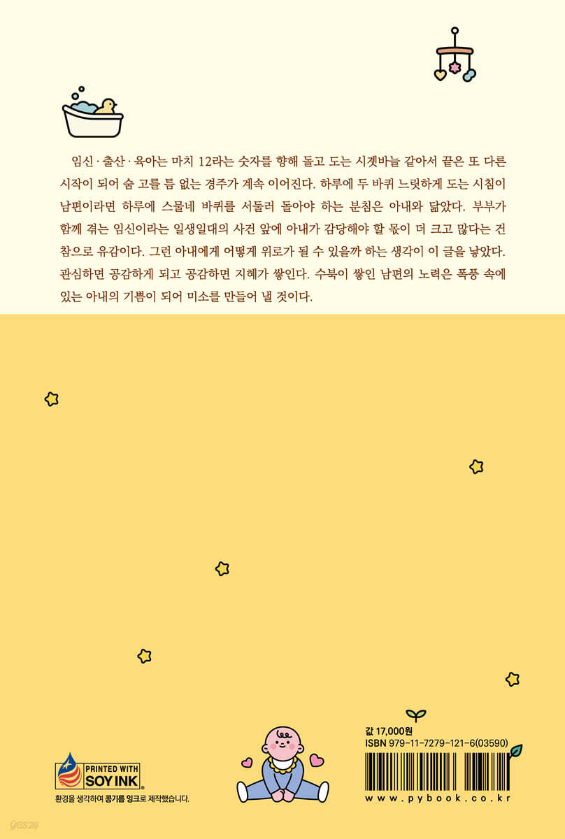 전반전 임신 초기 0-11주 / 1-3개월 · 임신이라고? 경주의 시작 4 · 빈손은 절대 안 돼 꽃과 손편지 7 · 피검사 첫 산 10 · 처음 뵙겠습니다 첫 초음파와 임신준비를 위한 간단 꿀팁_ 임신 4주 차 12 · 너의 이름은 태명 15 · 혼자가 아냐 남자라서 미안해_ 임신 4주 차 17 · 눈에 힘 좀 빼세요 하혈_ 임신 5주 차 19 · 미션의 시작 입덧_ 임신 5주 차 23 · 초음파 넘어 초음파 심장소리_ 임신 6주 차 28 · 임신 중 부부싸움 온전히 보호받아야 할 대상 33 · 임신한 아내의 생일에는 태아의 욕구는 엄마가 채우고 엄마의 욕구는 남편이 채운다. 36 · 커피와의 전쟁 참지 말고 지혜롭게 38 · 엄마는 강하다 아파도 좋다고?_ 임신 7주 차 42 · 몸도 마음도 트지 않게 튼살 크림 마사지는 아내의 마음까지 만진다_ 임신 7주 차 45 · 걱정하는 일의 90%는 일어나지 않는다 다중인체_ 임신 8주 차 50 · 숨겨진 세상 임신_ 임신 8주 차 53 · 나만 편하지 않으려는 몸부림으로 슬기로운 남편 생활_ 임신 8주 차 56 · 임신이 힘든 거야 당신 때문에 힘든 게 아니고_ 임신 9주 차 59 · 쿠바드 증후군 착각은 자유_ 임신 9주 차 63 · 물먹는 임산부 양수 이야기_ 임신 9주 차 66 · 불안 불안의 형태로 표출되는 모성애_ 임신 9주 차 71 · 안정기 대체 임신 안정기는 언제인가요?_ 임신 10주 차 74 · 생명체를 넘어 인격체로 존재 그 이상의 의미_ 임신 10주 차 77 · 아내의 치료자 남편_ 임신 11주 차 81 · 태교 마음의 방을 밝히기_ 임신 11주 차 84 하프타임 임신 중기 12-27주 / 4-7개월 · 반가운 말 한마디 1차 기형아 검사와 입체초음파_ 임신 12주 차 90 · 애초에 다 내 일이었다 집안 일 96 · 하루도 같은 날이 없다 세상에서 가장 아름다운 변화_ 임신 13주 차 101 · 배 속에서 시작된 육아 예비가 아니라 이미_ 임신 13주 차 105 · 임신부가 날 것을 먹어도 될까? 초밥 도전기 108 · 돌봄의 연속성 위대한 순환 111 · 우리 아내가 달라졌어요 동맹_ 임신 14주 차 114 · 내가 물 박사가 된 이유 좋은 양수를 위하여 120 · 받아들이셔야 합니다 아들딸 구별 말고_ 임신 14주 차 127 · 선한 누설자 임신은 비밀의 발견이다 132 · 좋은 말만 해주세요 제발 2차 기형아 검사와 피고임_ 임신 16주 차 136 · 인간 망각의 동물 142 · 역사가 될 글 남편의 임신 일기는 아내를 향한 편지다 144 · 배 크기 성장하는 아기_ 임신 17주 차 148 · 꼬르륵에서 툭툭으로 태동_ 임신 17주 차 151 · 임신 18주의 순간들 힘내! 155 · 보통의 기적 지금 159 · 치열한 쉼 임신 중기에도 안정기가 아니었다_ 임신 19주 차 161 · 삶이 멈춰버린 것 같아 꽃은 멈춤의 힘으로 피어난다_ 임신 20주 차 167 · 밀당의 고수 태동 느끼기_ 임신 21주 차 171 · 위대한 변화 정밀초음파와 몸의 변화_ 임신 22주 차 174 · 소름 네가 엄마라니, 내가 아빠라니_ 임신 23주 차 179 · 안녕과 안녕 헤어짐과 동시에 다시 만나는 사건임신과 출산 _ 임신 24주 차 183 · 합격임당 임신성 당뇨 검사_ 임신 25주 차 187 · 나를 칭하던 모든 이름이 없어진다 해도 D-100 192 · 마음까지 뒤흔드는 태동 태동이 줄었을 때_ 임신 26주 차 195 · 부지런한 꿀벌도 남편의 할 일이 줄었다_ 임신 27주 차 199 후반전 임신 후기 28-39주 / 8-10개월 · 너의 어떠함과는 상관없이 입체초음파와 단백뇨 검사_ 임신 28주 차 206 · 베이비 샤워(baby shower) 주인공 212 · 남는 건 사진이다 만삭촬영_ 임신 29주 차 219 · 손이 닿질 않으니 꿀벌이 다시 비행할 때_ 임신 30주 차 225 · 꿈이 말한다 임신 중 악몽과 불안, 그리고 출산에 대해 228 · 31 그 어떤 때보다 아름다워_ 임신 31주 차 231 · 귀인이 나타났다 육아용품 235 · 자나 깨나 배 조심 만삭_ 임신 32주 차 239 · Super Dad 건강한 남편 243 · 태동검사와 초음파 우리가 두려워하는 것_ 임신 33주 차 246 · 백일해 주사 과연 맞아야 하는가? 253 · 얼마 남지 않았다 출산 준비하기_ 임신 34주 차 256 · 가두어 놓는 새장이 아니라 생존을 넘어 기쁨의 공존으로_ 임신 35주 차 262 · 공감 난관 지금 태어나면 땡큐죠_ 임신 36주 차 266 · 자연분만을 위하여 임신 생활의 역설_ 임신 37주 차 269 · 몸으로 때우던 시기는 지났다 살면서 똑똑할 수 있는 시간이 단며칠이라도 주어진다면 _ 임신 37주 차 272 · 고마워 미안해_ 임신 38주 차 276 · 출산, 그 이후를 준비하라 해결된 봄을 향해_ 임신 39주 차 279 · 예정일은 예정일일 뿐이었다 D-1 282 · 아픔을 기대하고 기다린다고? 모순 아닌 모순_ 임신 40주 차 286 · 선불과 후불 건강만 하여라_ 임신 41주 차 289 · 그날의 감정들 출산 292 · 출산 후기 모든 게 우연은 아닐 거야 296 · 출산 후엔 꼭 302 · 끝 수고하셨습니다. 305 연장전 육아 - 평생 · 아빠의 육아 150일 리얼 후기 308 · 엄마의 육아 150일 리얼 후기 312 |