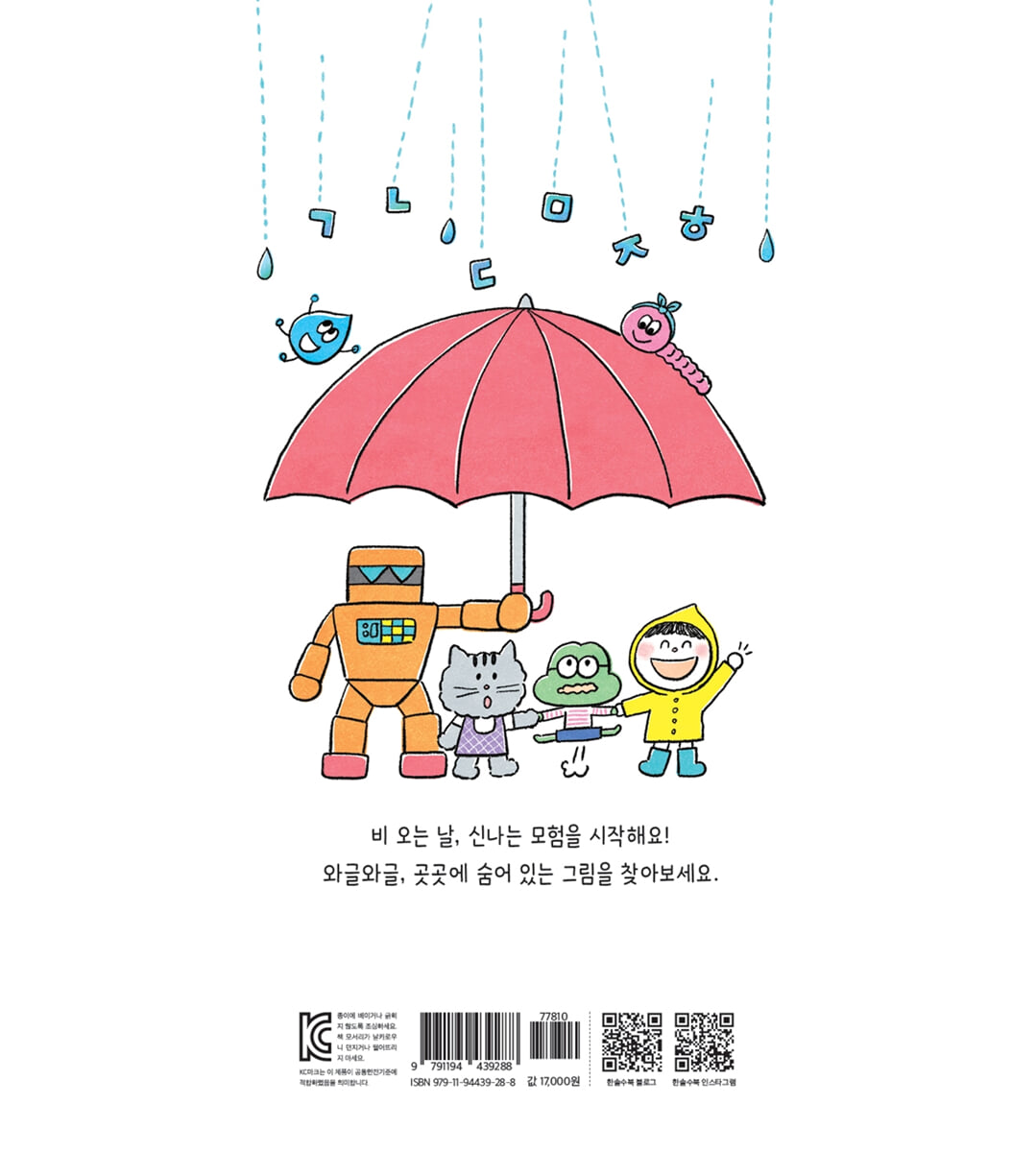 비 오는 날, 놀이터에서 놀던 친구들이 모두 집으로 돌아가 버리자, 비옷 입은 소년은 다른 친구들을 불러내요. 그리고 고양이와 개구리, 지렁이와 로봇 친구 등과 함께 신나는 모험을 떠난답니다. ‘뭉게뭉게 아이스크림 가게’에도 가고 아기자기한 땅속 마을, 공룡이 사는 숲속도 탐험을 해요. 어둠 속에서 길을 잃지만 친구들과 함께라면 우주와 깊은 바닷속도, 커다란 파도와 사나운 태풍도 두렵지 않답니다. 비옷 소년의 신나는 모험과 숨은그림찾기 미션을 통해 재미와 학습, 두 가지를 모두 잡을 수 있어요. 또한 어린 시절 신문이나 잡지에서 ‘숨은그림찾기’를 즐겨 했던 엄마 아빠와 디지털 게임에만 익숙한 우리 아이들이 함께 머리를 맞대고 즐겁게 놀 수 있는 그림책입니다. 초등교과 연계 국어 1-1 1. 글자를 만들어요 2. 받침이 있는 글자를 읽어요 3. 낱말과 친해져요 4. 여러 가지 낱말을 익혀요 국어 2-1 2. 말의 재미가 솔솔 |