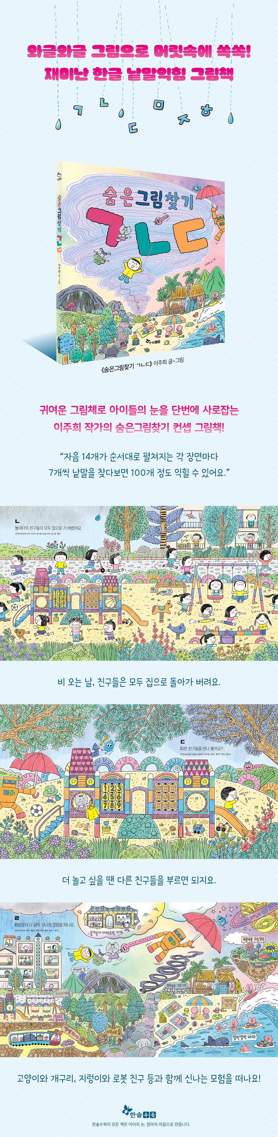이 책은 단순히 한글만 익히는 그림책이 아니라 각 장면마다 재미있는 이야기도 담겨 있어요. 그래서 이야기를 통해 더 선명하게 한글을 기억하는 효과가 있기도 해요. 재미 요소가 기억력을 극대화시켜 주는 것이지요.