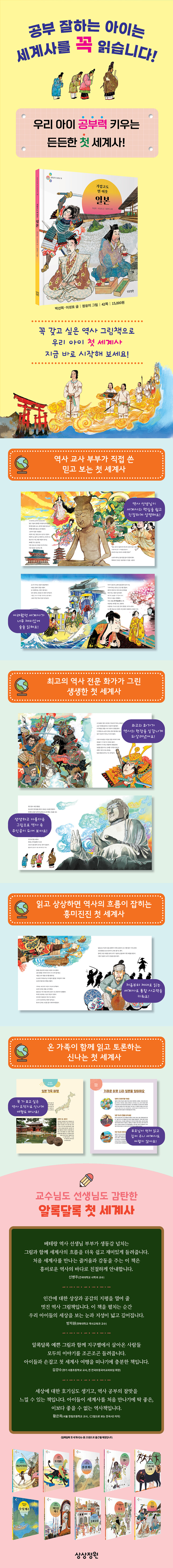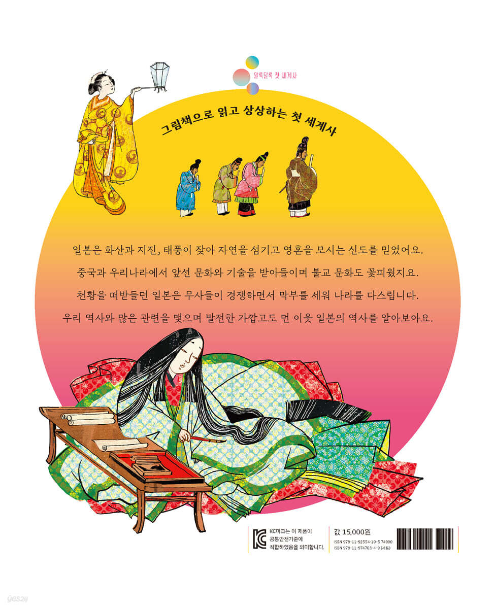 30년 가까이 중학교에서 역사를 가르치는 역사 선생님 부부가 쓴 첫 세계사 그림책입니다. 전국역사교사모임 전 회장이자 어린이 청소년 역사 교양서 베스트셀러 저자인 이성호(「살아있는 세계사 교과서」, 「나의 첫 세계사 여행」), 박선희(「제대로 한국사」) 선생님이 쓰고, 최고의 화가들이 그린 첫 세계사 그림책입니다. 너무 어려워서 선뜻 들려줄 수 없었던 세계사를 곁에서 이야기를 나누듯 조곤조곤 들려줍니다. 세계사의 주요 핵심 내용, 역사적 사건의 인과 관계와 의의를 짧고 쉬운 문장, 시처럼 아름다운 글로 탄탄하게 담아냈습니다. 최고의 역사 전문 화가들은 낯설고 어려운 세계사를 친근하고 아름답게 그려 냈습니다. 아름다운 그림으로 되살아난 역사의 장면들은 아이들에게 시간을 넘어 시대를 상상할 수 있게 하고, 역사를 입체적으로 그려 볼 수 있는 지적 호기심을 불러일으킵니다. 아름다운 그림과 글로 구성된 《알록달록 첫 세계사》를 읽으며 아이들은 나와는 다른 방식으로 살고 있는 사람들을 이해하고 그들과 어울려 평화롭게 살아가는 태도도 배울 수 있습니다. 평등한 세상, 평화로운 세상을 만들어 가기 위해 끊임없이 노력해 온 인류의 역사를 이해하고 따뜻한 눈으로 사람들을 바라보고 정의로운 마음으로 세상을 살아갈 힘을 키워 주는 역사책입니다. ● 가깝고도 먼 이웃 일본을 만나다 10권은 섬나라 일본의 역사를 다루고 있습니다. 일본은 화산과 지진, 태풍이 잦아 자연을 섬기고 영혼을 모시는 신도가 발달한 나라입니다. 구석기, 신석기 시대부터 야마토국을 지나 에도 시대로 이어지는 일본의 긴 역사 이야기가 생생하게 펼쳐집니다. 일본 최초 통일 국가인 야마토국은 중국과 우리나라에서 앞선 문화와 기술을 받아들이며 불교 문화를 발전시킵니다. ‘일본’으로 나라 이름을 바꾼 후에는 ‘천황’을 떠받들던 일본은 무사들이 경쟁하면서 막부를 세워 나라를 다스리지요. 귀족의 힘이 커지면서 천황의 힘이 약해지고 막부 정권이 세워지는 과정과 무사들이 서로 싸우는 혼란의 전국 시대를 살펴봅니다. 도요토미 히데요시가 전국을 통일하고 왜 임진왜란을 일으켰는지 그 과정을 따라가 보고, 우리 역사와 연관지어 살펴봅니다. 도시가 성장하고 상업이 발달하면서 가부키, 우키요에 등 서민 문화가 발달한 에도 시대의 문화를 경험하며 일본 문화를 이해해 봅니다. 고립된 자연환경을 극복하며 발전해 가는 일본, 우리 역사와 많은 관련을 맺으며 발전한 가깝고도 먼 이웃 나라 일본의 역사와 문화를 만나 볼 수 있는 책입니다. ● 온 가족이 함께 읽고 시작하는 북토킹, 우리 가족 교양까지 높이는 첫 세계사 《알록달록 첫 세계사》는 엄마 아빠가 아이와 함께 읽으며 세계사 지식도 쌓고, 통합 사고력을 키울 수 있는 책입니다. 부모님과 아이가 함께 책을 읽고, 토론할 수 있도록 「부모님 가이드」 코너를 마련했습니다. 부모님이 먼저 읽고 주요 핵심 내용과 흐름을 파악할 수 있어 아이의 질문에도 당황하지 않고 자신 있게 답하며 토론할 수 있습니다. 아이들과 함께 나누면 좋을 주제와 방향도 일러주고 있어 우리 가족의 첫 토론책, 첫 인문교양서로 활용할 수 있습니다. 꼭 알아야 할 소중한 문화유산을 만나고, 꼭 가 보고 싶은 역사 유적지로 떠나 볼 수 있는 「가보자 만나 보자!」 정보 코너도 준비했습니다. 인류가 남긴 위대한 유물 유적이 주는 감동은 아이들에게 체험하는 역사, 살아 숨 쉬는 역사와 만날 수 있도록 안내합니다. 우리 아이 첫 세계사, 《알록달록 첫 세계사》로 시작하면 충분합니다. 말랑말랑한 흥미 위주의 만화 학습서, 에피소드만 나열하며 단편적인 역사 지식 정보만을 전달하는 책으로는 역사적 상상력, 사고력, 문해력을 키울 수 없기 때문입니다. 현장 역사 교사의 충분한 고민이 담긴, 아름다운 그림에 시대를 담고 쓴 《알록달록 첫 세계사》는 우리 아이 공부력을 키울 수 있는 첫 세계사 그림책입니다. |