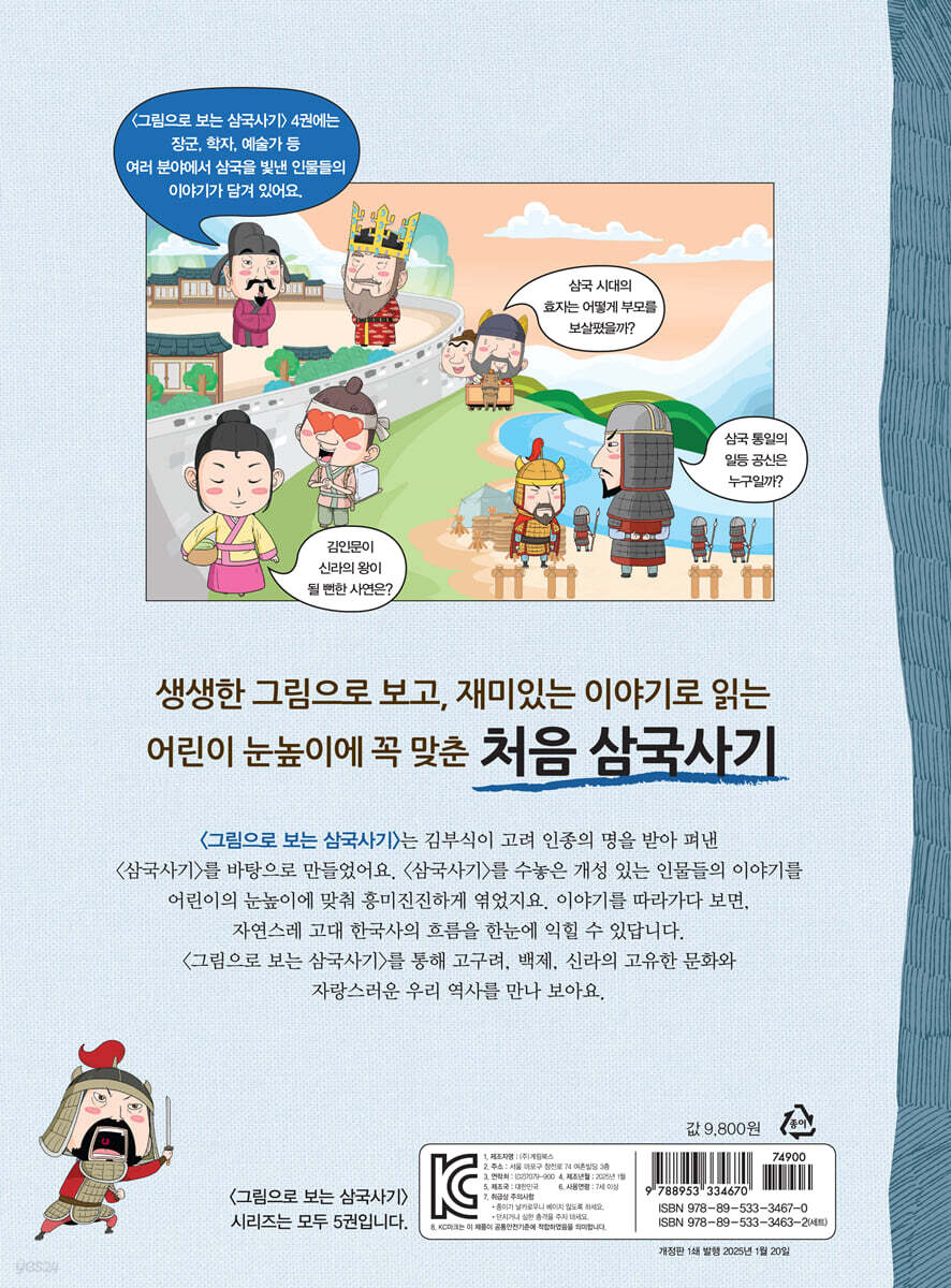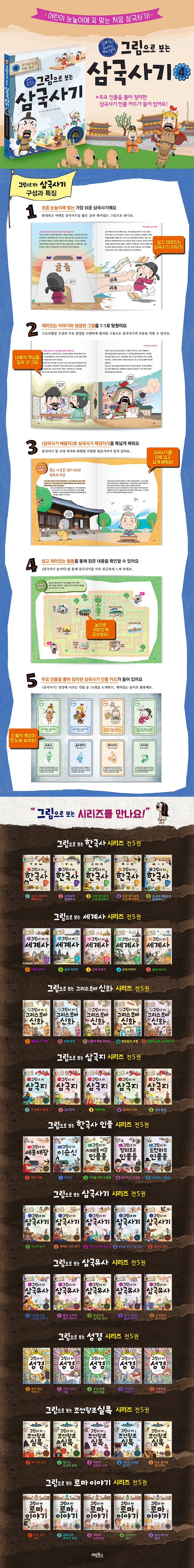 어린이부터 어른까지 왜 읽어야 할까요? 1. 우리 역사의 뿌리와 마주하는 가장 오래된 책이에요 〈삼국사기〉는 고대 국가의 수립부터 삼국의 정치·외교·경제·예술·학문·지리·제도·법률·종교 등의 방대한 내용이 체계적으로 담겨 있어요. 특히 각 인물들의 삶을 찬찬히 따라가다 보면 자연스레 역사의 큰 흐름을 살필 수 있는 눈을 키우게 되지요. 이처럼 〈삼국사기〉는 우리나라 고대사를 살펴볼 때 반드시 읽어야 할 고전이에요. 〈그림으로 보는 삼국사기〉에서는 어렵게 여길 수 있는 〈삼국사기〉를 원문에 충실하면서도 어린이들이 꼭 알아야 할 내용을 선별해 담아냈어요. 삼국이 어떻게 세워지고, 어떤 과정을 거쳐 나라의 기틀을 마련하고 발전해 갔는지, 그리고 어떤 이유로 역사 속에서 자취를 감추게 되었는지 알 수 있지요. 국가의 흥망뿐만 아니라 탄생 설화와 삼국의 풍속 등에 관한 다양한 내용들을 살피며 옛사람들의 생활상과 우리 전통문화를 보다 폭넓게 이해할 수 있는 계기가 될 거예요. 2. 고대 세계사까지 두루 살피며 올바른 역사관을 가져요 〈삼국사기〉는 우리 고대사를 중심으로 기록하지만 당시 주변국이었던 중국의 여러 왕조와 왜, 거란, 말갈 등과의 얽히고설킨 고대 세계사까지 아우르지요. 그래서 끊임없이 역사 왜곡을 주장하는 중국과 일본의 주장에 대응할 수 있는 유의미한 기록도 남아 있어요. 신라 본기에 기록된 제22대 임금인 “지증왕 13년 여름에, 우산국이 귀복하여 해마다 토산물을 공물로 바치기로 하였다.”라는 내용과 열전에 기록된 “512년 이사부가 하슬라주의 군주가 되어 우산국을 점령하였다.”라는 과거의 역사 기록이 오늘날 일본과의 독도 영유권 분쟁을 해결할 수 있는 실마리가 될 수 있는 셈이지요. 외국의 학문을 받아들일 때 우리나라 역사에 대해 잘 알고 있어야 균형 감각을 가질 수 있음을 강조한 김부식의 말처럼, 우리도 올바른 역사관을 기르기 위해서는 우리 고대사에 지속적인 관심을 갖고 알아가는 태도가 필요해요. 3. 다양한 인간상을 만나며 삶의 지혜를 배워요 〈삼국사기〉에서는 나라를 세우고 다스린 115명의 왕과 삼국의 역사에서 중요한 장군, 충신, 문장가, 효녀 등 80여 명의 삶이 녹아 있어요. 삼국 통일을 이룬 뒤 세금과 부역을 줄이고, 죽어서도 백성과 나라를 지키려 동해 바다에 묻힌 문무왕의 ‘리더십’과 얼마 남지 않은 군사들을 독려하면서 목숨 바쳐 국경을 지킨 충신 필부의 ‘애국심’, 왜의 사신에게 한 말실수로 전쟁이 일어나자 목숨 걸고 책임 진 석우로의 ‘책임감’, 가야를 정벌하는 데 큰 공을 세웠으나 가장 친한 친구인 무관과의 약속을 지킨 사다함의 ‘우정’, 자신의 살을 베어 병든 어머니를 모신 향덕의 ‘효’ 등 살아가는 데 필요한 삶의 지혜를 만날 수 있지요. 또 〈삼국사기〉에 나오는 수많은 인물이 보여 주는 다양한 인간관계를 통해 소통하고 공감하는 능력 또한 자연스레 커질 거예요. 4. 흥미진진한 이야기를 통해 역사적 상상력을 길러요 〈삼국사기〉는 신화와 전설 같은 확실하지 않은 이야기들은 최대한 배제하고 정확한 자료를 바탕으로 쓴 책이에요. 하지만 천 년의 역사를 아우르다 보니 삼국에서 벌어지는 다채로운 이야기들이 주는 재미가 쏠쏠하지요. 눈을 뗄 수 없을 정도로 긴장감 넘치는 전투 장면에서부터 나라를 배신하고 사랑을 택한 애절한 사랑 이야기까지 인간의 희로애락을 담아냈어요. 또한 판타지 소설 속에서나 볼 수 있는 개성 강한 인물들과 흥미진진한 이야기가 역사적 상상력을 샘솟게 하지요. 역사적 상상력을 바탕으로 옛사람들의 생활 모습을 그려 보고, 사회가 어떻게 발전해 왔는지 생각해 봐요. ◎ 〈그림으로 보는 삼국사기〉 시리즈는 어떤 점이 특별할까요? 1. 어린이 눈높이에 맞춰 썼어요 〈그림으로 보는 삼국사기〉는 어린이가 쉽고 재미있게 〈삼국사기〉 내용을 이해하면서도 방대한 이야기의 맥락까지 잡을 수 있게 도와줘요. 짧은 글과 재미있는 그림으로 구성되어 더욱 쉽지요. 어렵고 딱딱한 단어와 문장을 말랑하게 풀고 그림은 재미있고 생생하게 그려 어린이의 흥미를 끌지요. 2. 재미있는 이야기와 생생한 그림을 일대일로 맞췄어요 어린이에게 〈삼국사기〉는 수많은 등장인물과 복잡한 이야기 때문에 어렵게 느껴질 수 있어요. 그래서 〈그림으로 보는 삼국사기〉는 어린이 눈높이에 맞춰 술술 읽히면서도 깊게 생각하고, 쉽게 이해할 수 있도록 스토리텔링 방식으로 구성했어요. 또 그림 비중을 확 늘려 매 페이지마다 주요 장면을 재치 있게 풀어내 생생한 느낌으로 책장을 넘길 수 있을 거예요. 3. 깊이 있고 재미있게 삼국사기를 공부하는 코너가 가득해요 본문 중간중간에 마련된 코너인 ‘삼국사기 배움터’에는 어린이가 흥미 있어 할 만한 삼국사기 및 고대 역사와 관련된 이야기로 가득해요. 게다가 각 장의 마지막에는 다시 한 번 앞의 내용을 더듬으며 기억하게 해 줄, 다른 그림 찾기, 십자말풀이, 숨은그림찾기 등의 재미있는 놀이 페이지가 등장해요. 놀이를 통해 〈삼국사기〉의 흐름과 내용을 잡아 보세요. 4. 주요 사건으로 정리