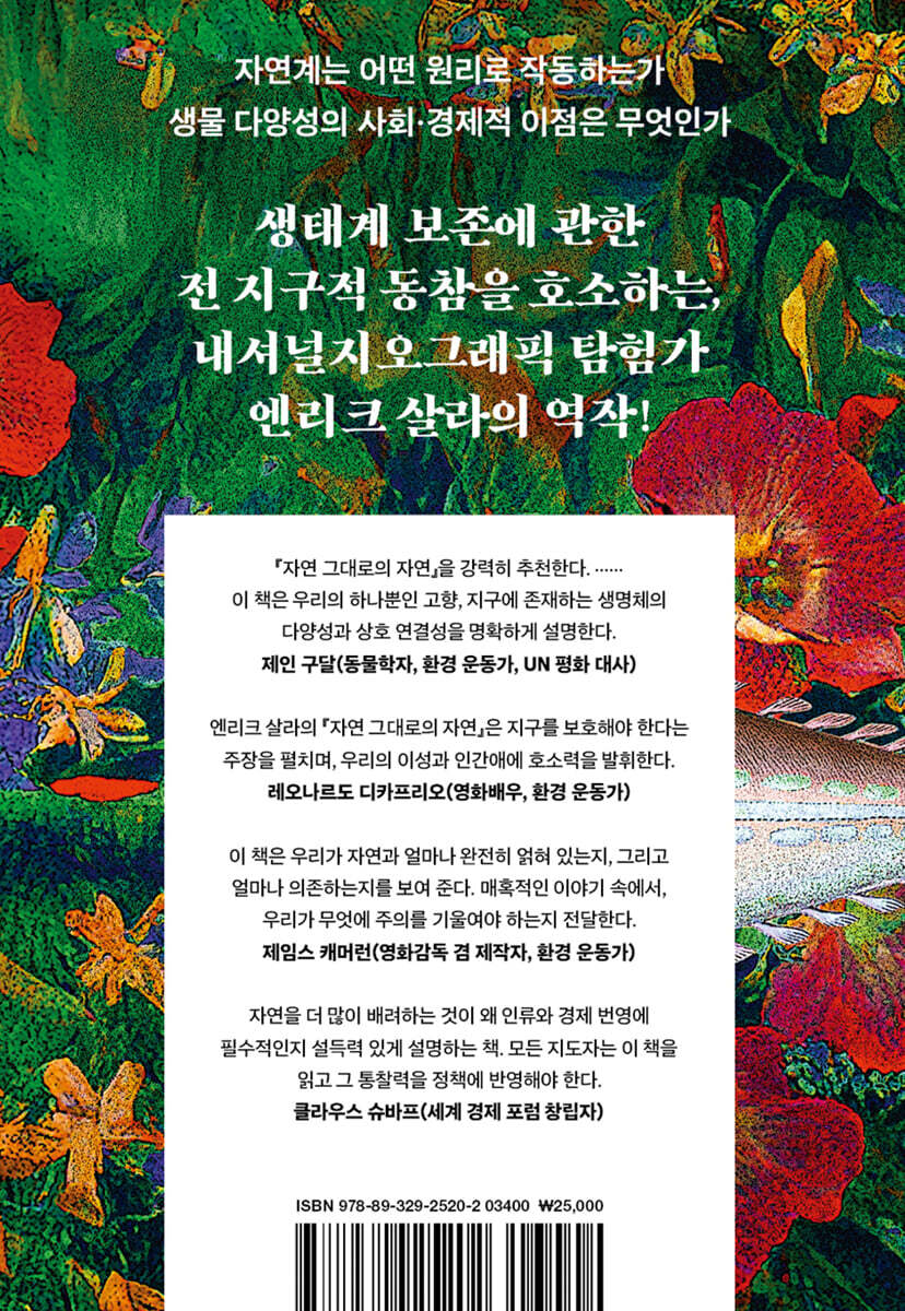 『자연 그대로의 자연』을 강력히 추천한다. 이 책은 우리의 하나뿐인 고향, 지구에 존재하는 생명체의 다양성과 상호 연결성을 명확하게 설명한다. - 제인 구달 (동물학자, 환경 운동가, UN 평화 대사)