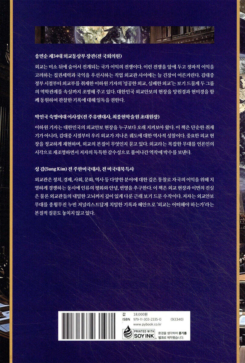 일러두기 iii Chapter 01 윤석열 · 박근혜 대통령 탄핵 사태 1 윤 대통령, 출근길 회견 폐지하며 민심과 멀어졌다 2 ‘윤석열 대통령 노벨 평화상’ 추천했는데… 캠벨 부장관, 계엄 선포에 배신감 9 조태열 외교장관, 탄핵 정국에서 “정치권은 깊은 성찰하라” 소신 발언 16 박근혜 대통령, 탄핵 기각 확신하고 해외 순방 준비했었다 24 “박근혜 탄핵 사태 연루돼 사망했나…” DJ-오부치 선언 만든 박준우 전 수석 29 Chapter 02 문재인 대통령과 대외관계 41 문 대통령과 30분 통화한 트럼프, 아베와 75분 전화하며 ‘북핵해법’ 질문 42 첫 방일 때 민단관계자 안 만나고 대사 관저에만 머문 문재인 대통령 51 남관표 · 장하성 몰아붙여 사드 ‘3불’ 부인 이끌어내다 56 ‘사드 3불’ 부인 한 달 만에 경질된 남관표 주일 대사 61 Chapter 03 정치 권력과 외교부 69 “잘못되면 사표”… 전두환 대통령의 태평양 정상회의 막은 외교관 70 해외순방 준비하다 개각 22분 전 알았다, 홍순영 장관 경질 내막 75 “홍순영, 차관에 DJ 고향 후배 대신 고교후배 반기문 발탁했다가 낙마” 79 “반기문을 차관으로 두고 장관하다니… 내가 복이 많은 사람이야” 85 “해외 공관 비리로 외교 장관이 얼굴 들고 다닐 수 없다” 91 Chapter 04 미국과 대한민국 외교 〈1〉 101 DJ-부시 회담 중 나간 파월, 북한 향해 경고 기자회견 102 DJ-부시 회담 실패후 외교장관의 국무회의 불참 109 서울 온 체니 부통령, 미 대사관 이전 문제에 불만 토로 117 경기여고 터로 대사관 이전 무산되자 탁자 내려친 미국 외교관 123 부시, 노무현 탄핵 기각 3일만에 주한미군 감축 통보 130 ‘0.2 g 농축 우라늄’ 때문에 IAEA 사찰단 한국에 들이닥치다 138 미국, ‘0.2g 우라늄 분리’ 한국에 UN 안보리 제재 추진 143 “숨겨진 외교적 승리”… IAEA 차원에서 ‘남핵(南核)’ 사건 종결 151 Chapter 05 미국과 대한민국 외교 〈2〉 159 DJ와 정상회담 후 동생 출연한 열린음악회 달려간 클린턴 미 대통령 160 ‘섹스 스캔들’로 탄핵 위기의 클린턴, 서울에서 동생과 밤새 술 마시다 164 한국 부임 못할 뻔한 첫 여성 미국대사 ‘심은경’ 169 “나는 한국을 떠나고 싶지 않아요” 한국을 사랑한 주한 미국 대사 176 문을 열자 ‘대한제국 주미공사관’이 나타났다 185 카터의 NYT 친북 기고문에 발칵 뒤집힌 워싱턴 정가 191 Chapter 06 러시아, 중국과 대한민국 외교 201 푸틴, 대한민국 국회서 ‘주한미군 철수’ 연설하려 했다 202 푸틴, ‘ABM 공동성명’으로 한미관계 농락하다 208 ‘간도협약은 무효’… 국감 자료집 급히 회수한 외교부 213 ‘간도협정 무효 → 행정 착오 → 법리적 무효’… 중국 눈치보며 오락가락 220 Chapter 07 일본과 대한민국 외교 229 “위안부가 아니라 성 노예”… 클린턴 장관 발언에 일본 반발 230 주한 일본대사를 거짓말쟁이로 만든 아베 총리 237 한국계 고교의 고시엔 첫 경기에 긴장한 일본 경찰 244 “조선학교 학생들은 그 배 타고 일본으로 돌아가라” 249 “적십자사가 제대로 북송 심사 안 한 것이 한스럽다” 255 Chapter 08 북한과 대한민국 외교 263 MB, 아웅산테러 현장 참배했으나 표지석 하나 없었다 264 “한국인 추모비 너무 크다” 미얀마 반발로 건립 무산 위기 270 “백남순 북한 외무상 나온다” 아수라장 된 방콕 공항 276 김정일 공개 비판했다가 좌파 진영 ‘변절자’ 됐던 박선원 283 책을 마무리하며 292 |