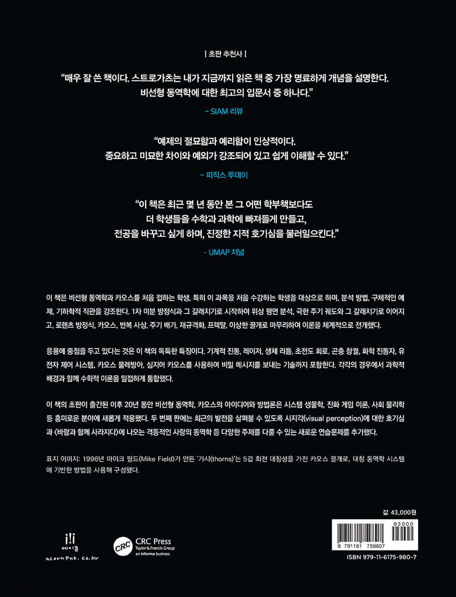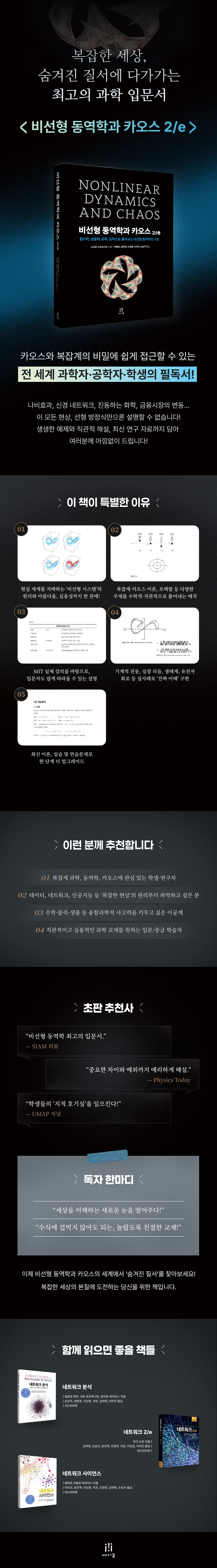 "매우 잘 쓴 책이다. 스트로가츠는 내가 지금까지 읽은 책 중 가장 명료하게 개념을 설명한다. 비선형 동역학에 대한 최고의 입문서 중 하나다." - SIAM 리뷰 "예제의 절묘함과 예리함이 인상적이다. 중요하고 미묘한 차이와 예외가 강조되어 있고 쉽게 이해할 수 있다." - 피직스 투데이 "이 책은 최근 몇 년 동안 본 그 어떤 학부책보다도 더 학생들을 수학과 과학에 빠져들게 만들고, 전공을 바꾸고 싶게 하며, 진정한 지적 호기심을 불러일으킨다." - UMAP 저널 |