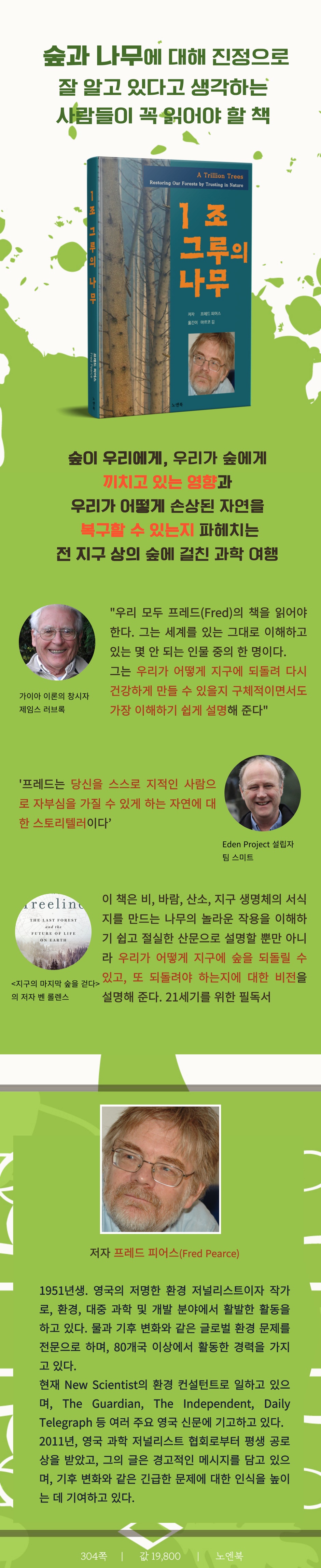 한국 독자들을 위한 편지 신화와 마법 Ⅰ 기후 창조자1 쿨한 나무 2 플라잉 리버 3 숲의 숨결 4 탕구로에서 5 산불 Ⅱ 천국에서 약탈까지6 잃어버린 세계 7 벌목 전성시대 8 벌목 완료 9 산림의 소비 10 무인지대 11 산림 측정 Ⅲ 자연복원12 녹색의 즐거움 13 유럽의 수상한 녹화사업 14 산림변천 15 심을 것인가 말 것인가 16 자라게 하라 17 혼농임업 Ⅳ 산림 공유18 원주민들의 노력 19 지역공동체 산림 20 아프리카의 전망 집으로 감사의 말씀 더 읽어야 할 도서 미주 옮긴이의 말