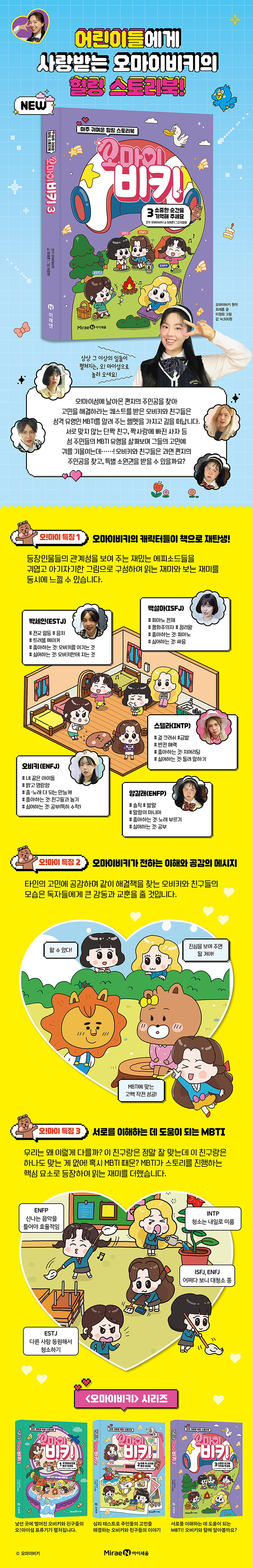 오마이비키와 친구들의 아름다운 성장 스토리 심리 상담소를 열고 주민들의 고민을 해결해 주던 오비키와 친구들은 3권에서 고민 상담 편지의 주인공을 찾아 해결하라는 새로운 퀘스트를 받는다. 그리고 새롭게 합류한 양갈래와 함께 섬을 돌아다니며 주민들의 고민을 해결해 준다. 이때 유용하게 쓰인 것은 MBTI를 알려 주는 헬멧으로, MBTI는 주민들의 고민이나 성향을 파악하여 그에 맞는 해결책을 찾는 데 큰 역할을 한다. 그 과정에서 오비키와 친구들은 자신을 되돌아보기도 하고, 타인을 이해하려고 노력하면서 조금씩 성장해 나간다. 이 책에서는 각기 다른 성향의 캐릭터들이 기존에 겪어 보지 못한 여러 상황에 대처하는 모습을 다양하게 보여주면서 아이들에게 어떤 가치관을 갖고 행동하는 게 옳은가에 대해 알려 주고자 하였다. 어린이들은 몸과 마음이 한 뼘 더 자란 듯한 오비키와 친구들의 모습을 보며 협동, 배려, 공감, 인내, 우정 등 긍정적인 마음가짐을 배울 수 있을 것이다. “내 마음을 알아야 다른 사람의 마음도 알 수 있어요.” 재미있는 MBTI 이야기와 함께 공감 능력도 쑥쑥! 사람의 성격 유형을 16개로 분류하여 분석하는 MBTI는 이제 유행을 넘어 우리 일상 깊숙이 파고들었다. MBTI를 그저 재미로만 즐길 수도 있지만, 나와 타인을 이해하는 유용한 도구로 사용한다면 어려운 인간관계를 풀어 나가는 데 큰 역할을 할지도 모른다. 오마이비키 3권은 이런 MBTI를 활용하여 주민들의 고민을 해결해 주는 새로운 포맷으로 이야기가 진행된다. 어린이들에게 크게 유행하는 MBTI 이야기 자체만으로도 흥미롭고 재미있지만, 친구들의 고민을 들어주고 공감하며 같이 해결책을 찾는 오비키와 친구들의 모습은 아이들에게 큰 감동과 교훈을 줄 것이다. |