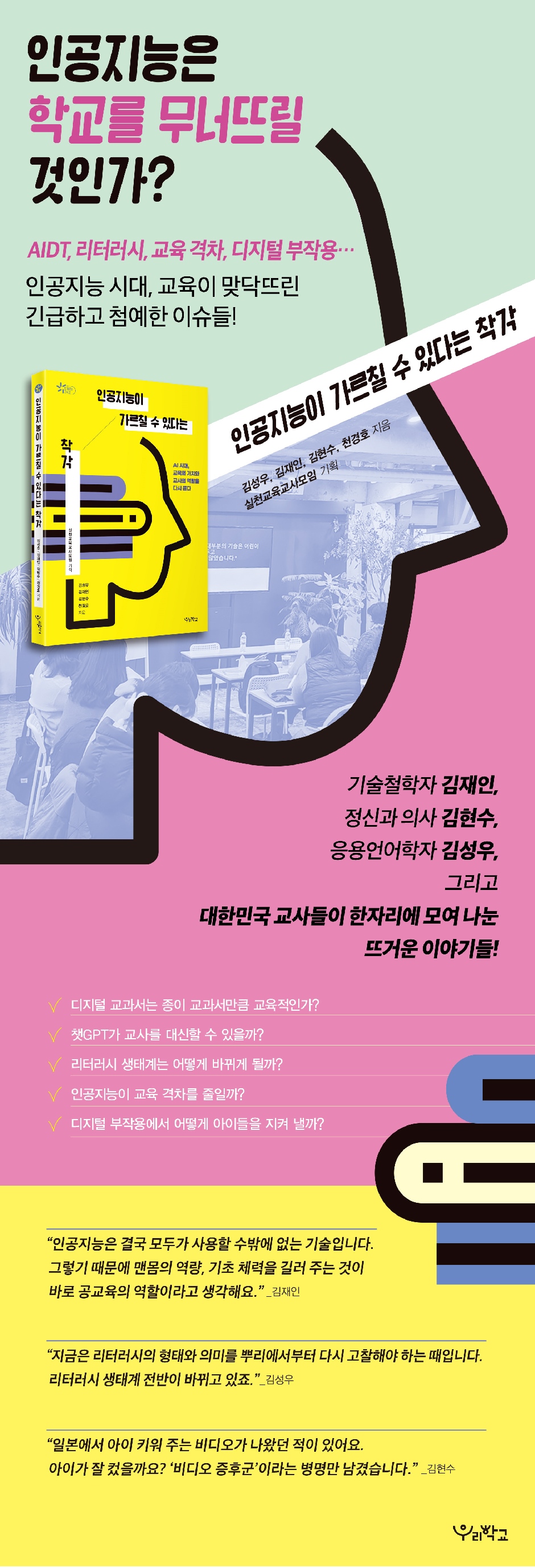 --- p.30 인공지능을 사용해야 한다는 이야기는 이제 별로 할 필요가 없어요. 이미 다 쓰고 있거든요. 그러니 결국엔 인공지능 없이도 할 수 있는 능력이 중요합니다. 그게 바로 맨몸의 기능, 역량이에요. --- p.34 무기력이란 사실 저항의 현상으로 나타나는 것입니다. 할 일이 없어서 무기력하다고 느끼는데, 그 무기력은 개인의 욕망이 아니라 무기력하게 만드는 시스템에서 오는 겁니다. --- p.76 인본주의 교육은 예외를 인정해요. 예외를 제거하지 않아도 돼요. 다양성을 존중하고 돌연변이가 생기면 존중해요. 돌연변이가 진화를 이끌어 오고, 새로운 문화를 만들어 왔다는 것은 진화심리학에서 굉장히 중요한 이론이기도 합니다. 하지만 인공지능은 평균을 중심으로 세상을 돌아가게 할 가능성이 높아요. 거기에 특정한 편견이 개입될 수도 있어요. 그게 아주 위험해요 --- p. 86 그럼 왜 다른 나라는 폐기 수순일까요? AIDT를 사용해 봤고, 이전과 비교해 본 결과가 나오기 시작했거든요. 디지털 교과서는 종이책보다 못하다, 스크롤 속도만 빨랐지 의미 있는 학습이 안 된다는 연구 결과가 많이 나왔어요. 의미 있는 학습이 안 되었다는 건 진도는 나갔지만 학습으로 남은 건 없다는 뜻입니다. --- p.99 전통적인 과제 수행에서 읽기는 쓰기의 전제였습니다. 그런데 이제는 읽기 과정을 완전히 건너뛰고 인공지능으로 글을 생성하는 것부터 시작해도 결과적으로는 읽기와 쓰기 과제를 수행한 것 같은 결과가 나올 수 있어요. 읽지 않고 쓰기 즉 생성부터 시작하는 것, 저는 이걸 읽기와 쓰기의 전도라고 부릅니다. 둘의 순서가 뒤집히는 거죠. --- p.140 반면에 다리로서의 인공지능이라는 메타포도 가능하지 않을까 생각합니다. 바벨탑이 수직적이라면 다리는 수평적인 메타포죠. 나와 타인을 이어 주고, 나와 자연을 이어 주고, 내가 모르는 교과와 나를 이어 주는, 그리하여 인간과 비인간을 포함한 우리 모두를 이어 주며 더 나은 삶과 행성을 꿈꾸게 하는 인공지능을 생각할 수 있어요. 이런 관점에서 바라본 인공지능은 상호 이해와 협력의 가능성을 제시합니다. --- p.150 학습자에게 일어나는 두 번째 변화로, 스스로 정리하고 요약하고 단상을 적는 행위가 줄어드는 것을 꼽을 수 있습니다. 리터러시를 키우는 데에서 중요한 것이 정리와 요약하기, 내 의견이나 단상을 적어 보거나 모르는 단어가 있으면 찾아서 메모하는 것이죠. 그런데 이제는 인공지능에게 이러한 일을 시킬 수 있어요 --- p.157 제가 강조하고 싶은 것은 기술이 급진적으로 세계를 재구성할 때, 교육이 해야 할 일은 더욱 급진적인 가치의 도입을 통해 이에 대응해야 한다는 점이에요. 기술이 삶과 사회 전반을 변화시킬 것이 분명하다면 전통적인 가치를 다시 한번 강조함으로써 이에 대응하는 것이 아니라, 그간 쉽게 입 밖으로 꺼낼 수조차 없었던 가치와 지향에 대해 목소리를 높여야 한다는 겁니다. --- p.188 |