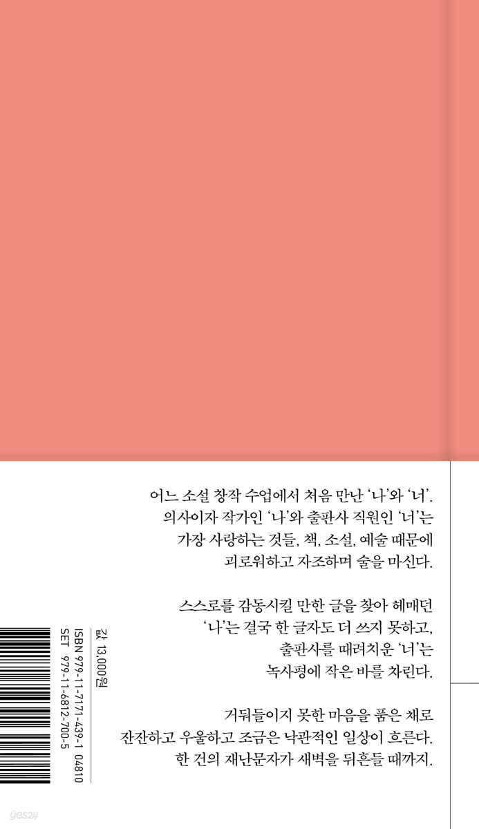 --- pp.15-16 몇 년 동안 내가 갓생을 살고 나서 깨달은 것은 다음 두 가지였거든. 1) 건강한 인간으로 살아가기 위해서는 소설을 쓰지 않아야 한다. 2) 만약 소설을 쓰지 않더라도 갓생을 산다면 여러분은 빠르게 죽는다. --- p.21 “병든 놈들이 좋은 예술 하고, 좋은 예술 하면 없던 병도 생기더라.” 입으로만 부르짖던 퇴사를 드디어 단행하고서 마침내 녹사평에 작은 바를 열기 직전이었던 너는 그렇게 단언했어. 너의 냉소는 내가 지극히 좋아했던 장르라 꺽꺽대면서 웃고 있는데 네가 내 어깨를 툭 쳤지. “너는 건강하게 나쁜 예술 하세요.” --- p.36 읽다 보면 ‘내가 좋아하는 게 이런 거였구나’ 싶은 순간이 가끔 찾아와. 그 ‘가끔’ 같은 작품을 쓰고 싶어서 인물을 선택하고 사건을 선택하고 배경을 선택해. 선택지는 갈림길을 기하급수로 팽창시키고 단어마다 문장마다 구두점마다 또 선택해야 하는 무한한 굴레를 만들면 폭주하는 편도체는 필연적으로 불안과 초조와 우울을 야기해. --- pp.37-38 “너 정말 술 파는 서점인지, 책 파는 술집인지, 그거 하게?” 내 물음에 너는 어이없다는 듯이 나를 봤어. “내가 책을 왜 팔아? 술집 차릴 거야, 술! 집!” 정색을 하는 네 목소리와 달리 너는 내가 챙겨 온 몇 권의 시집을 보더니 “저거 좋냐? 좋다는 사람 많던데”라며 거듭 물었어. --- p.54 |