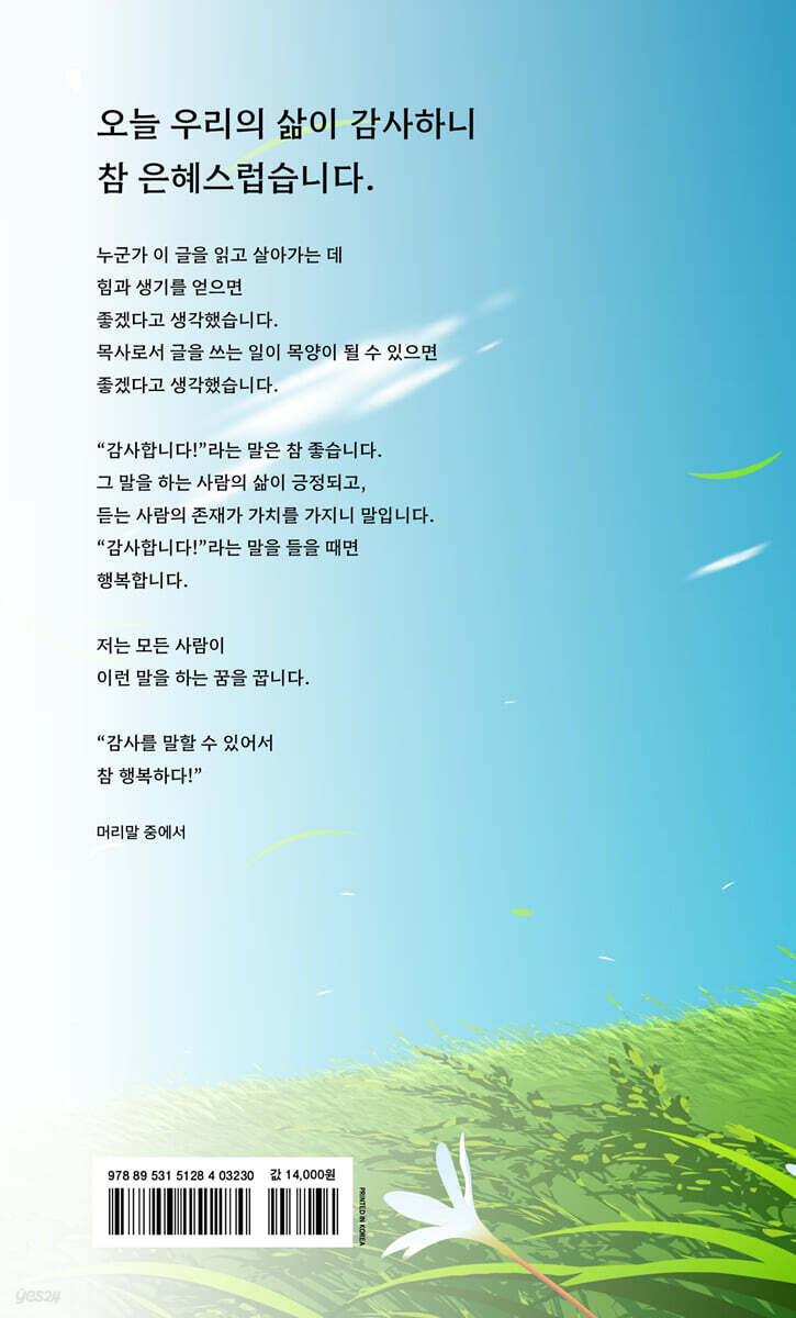 1. 내 뜻대로 되지 않으니 감사합니다 # 하나님을 얼마나 압니까 # 배우려 애쓰기보다 배워지는 은혜 # 은혜를 은혜롭게 여길 수 있기를 # 사명이란 무거워야 제맛이죠 # 죽음 앞에서야 비로소 삶을 생각합니다 # 삶의 자락에서 사랑을 발견하세요 # 시기심이 항상 발목을 잡습니다 # 미련해 보이지만 가장 큰 지혜입니다 # 실망 속에 기대가 있습니다 2. 이길 고난이 있으니 감사합니다 # 어떤 불을 통과하든 함께하십니다 # 버려지지 않았습니다 # 닫힌 문을 여는 고백, 감사 # 숨겨 놓으시는 이유가 있습니다 # 눈에 보이는 게 다는 아니죠 # 하나님은 과거에 머무시는 분이 아닙니다 # 영광의 순간을 조심하세요 # 유혹을 참아 내야 크리스천이죠 3. 도움받을 약함이 있으니 감사합니다 # 대견스러움과 사랑스러움의 차이 # 선물, 은혜, 그리고 감사 # 헌신이란 조금 더 오버하는 일 # 하나님 덕분에 좋은 일이 많았습니다 # 기적이 기적으로 이어집니다 # 어려움 속에서라야 도움을 구합니다 # 배려하는 마음이면 충분합니다 4. 흐르듯 살게 하시니 감사합니다 # 그런 날도 있는 겁니다 # 상위 10퍼센트가 되어 봅시다 # 교만한 지성보다는 겸손한 마음을 # 생긴 대로 살기(a.k.a. 부르신 곳에서) # 추억할 거리가 있으니 얼마나 좋습니까 # 주책스러워도 괜찮아 # 아버지가 뿌리신 헌신의 열매를 누립니다 # 끌려다니지 말고 행복합시다 5. 여전히 희망을 보게 하시니 감사합니다 # 실패의 다른 말은 배움입니다 # 자리를 지키는 사람과 뺏기는 사람 # 돈을 내고 기뻐하는 교회 # 세상이 우리를 속일지라도 # 은혜가 있어서 삽니다 # 과잉 친절을 기대합니다 # 우리는 하나님의 성전입니다 # 아름다운 기억이 있다면 충분합니다 |