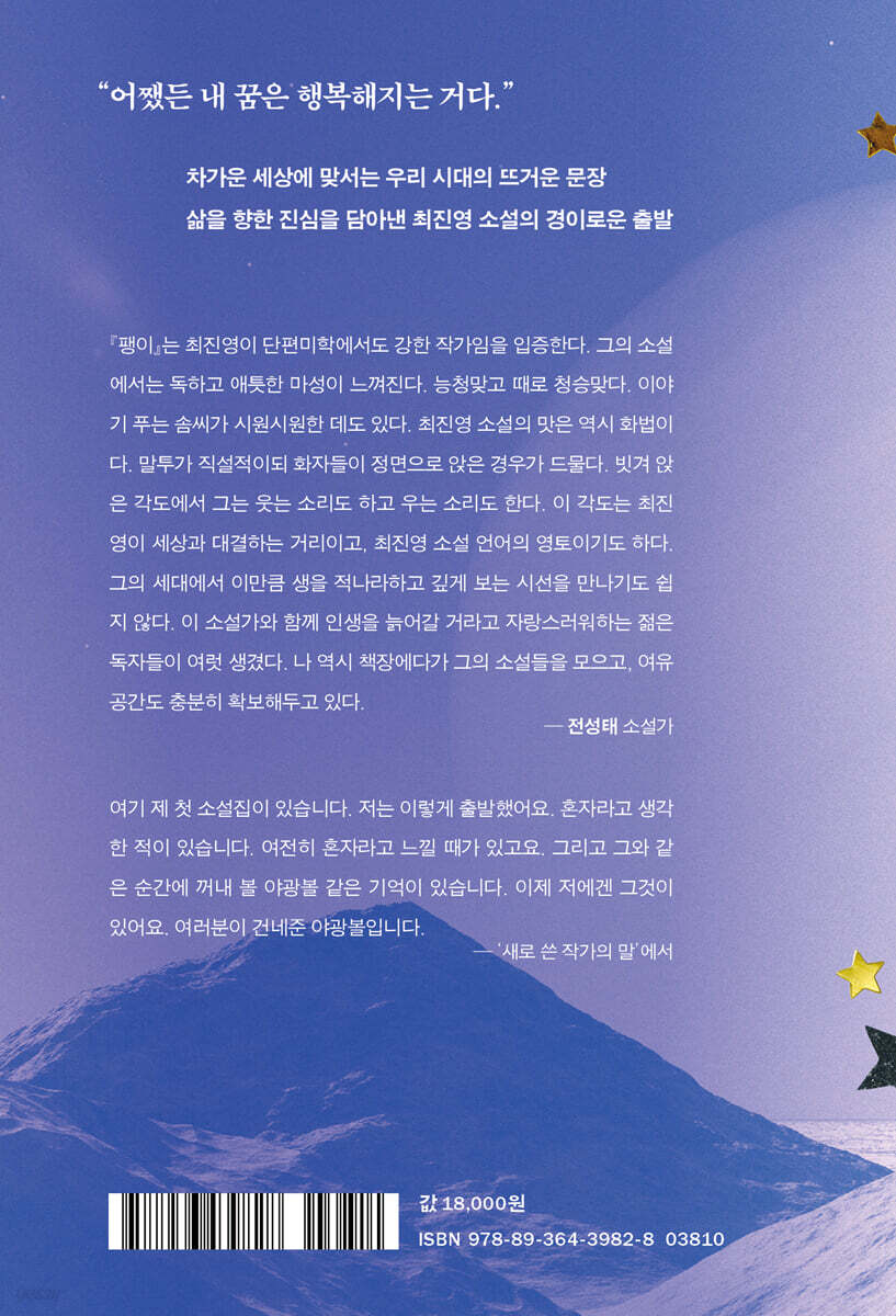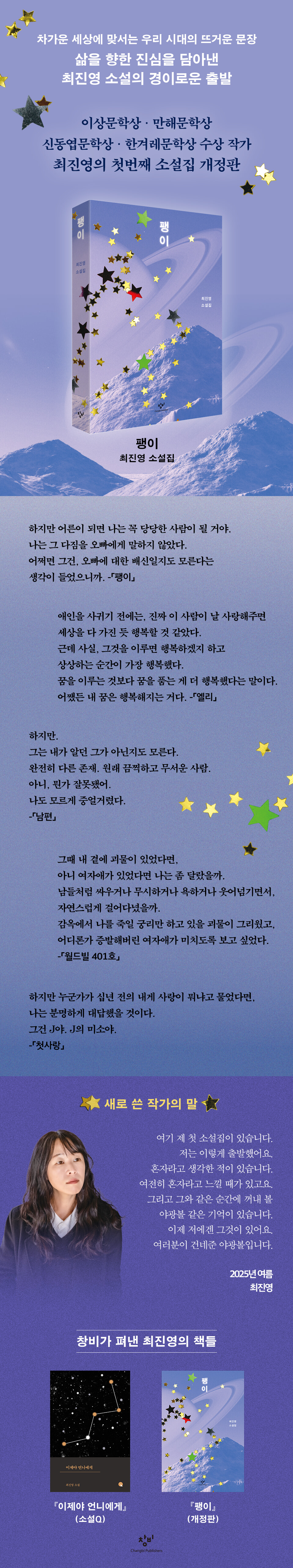 이름 없는 슬픔을 기억하는 열가지 방식 『팽이』에 실린 열편의 단편은 세계 곳곳에 흩어져 있는 조각처럼 각각 한 세대가 직면한 삶의 그림자를 각기 다른 방식으로 들여다본다. 이름을 붙이기도 전에 이미 존재했던 것처럼 그 시작조차 가늠할 수 없는 슬픔의 본질과 감정의 윤곽을 드러낸다. 소설의 인물들은 대부분 자신이 살아가는 세상에 결코 온전히 스며들지 못한 채, 나름의 방식으로 삶을 이어나가려 애쓰는 사람들이다. 표제작이자 등단작인 「팽이」는 엄마가 집을 떠난 뒤, 어린 오빠와 함께 남겨진 소녀 ‘재이’가 자신의 세계를 인식해가는 이야기이다. 떠날 날을 알 수 없고 “아무 균형도 규칙도 없는” 곳이지만 자신을 둘러싼 전부처럼 느껴지기도 했던 작은 방에서 재이는 조금씩 성장한다. 소설은 한 아이가 무너짐 없이 세상을 버텨내는 모습을 ‘팽이’라는 상징 안에 압축하며, 간명하고 정직한 문장과 놀라운 몰입감으로 삶의 본질에 가까이 다가간다. 첫번째 작품 「주단」 역시 통제할 수 없는 어둠과 그늘을 온전히 껴안고 성장한 인물의 심리를 섬세하게 그려낸다. 쌍둥이 형제 중 병약한 동생 ‘단’과 그의 욕망, 그리고 죄책감과 혐오 사이에서 고통받는 형 ‘주’의 심리가 성인 화자의 회고 형식으로 펼쳐진다. 작가는 감당할 수 없는 고통과 그것이 남긴 상흔을 섬세하게 더듬으며, 문학이 슬픔을 기억하는 방식으로 어떻게 작동하는지를 보여준다. 청소년 화자의 시선으로 펼쳐지는 「첫사랑」은 처음 사랑에 빠질 때의 몽글몽글한 감정을 서정적으로 담아낸다. 강렬한 작품들 사이에서 유독 여리고 투명한 감수성이 돋보이는 이 단편은, 어떤 것으로부터도 구속받지 않은 사랑의 감정을 통해 삶을 움직이는 근원적인 동력을 환기한다. 아직은 다 헤아릴 수 없는 감정과 갈등으로 가득 찬 세계 속에서 무언가를 버티며 살아가는 이들의 모습은, 그 자체로 애틋하고 서글픈 빛을 띤다. 그러나 삶은 그 애틋함을 오래 붙잡아두지 않는다. 시간이 흐르고, 혼자 힘으로 세상을 살아내야 할 어른이 된 이들은 더없이 냉혹하고 건조한 현실과 마주한다. 「월드빌 401호」와 「창」은 청년들이 처한 생존의 현실을 폭력적으로, 혹은 극단적으로 보여준다. 거대한 폭력을 경험한 뒤 집에서 나오지 못하게 된 「월드빌 401호」의 주인공은 과거의 학대자 ‘괴물’이 감옥에 들어가 있음에도 과거의 공포에서 벗어나지 못한다. 그에게 유일한 위안이던 반려견조차 끝내 폭력의 희생양이 되는 서사는, 트라우마의 반복을 그야말로 가혹하게 그려낸다. 「창」의 주인공은 비정규직 여성이다. 성희롱과 따돌림을 견뎌온 끝에, 자신을 향한 모멸의 언어들이 적힌 메신저 대화를 목격한 그는 충동적으로 회사 창문을 부수고 집으로 돌아온다. 우연히 이웃 커플의 사랑의 기척을 접하고 잠시 설렘을 느끼지만, 곧 그 작은 방조차 자신에게 안전하지 않다는 사실을 자각하며 절망에 이른다. 두 작품은 사회 속 개인이 감당해야 할 폭력과 고통의 무게를 적나라하게 드러낸다. 알레고리적 장치를 통해 청년 세대가 느끼는 막막함을 효과적으로 드러낸 「엘리」는 모든 것을 내려놓고 산속에서 살아가는 청년과 코끼리의 이야기이다. 이 소설은 불안한 내면과 허망한 행복의 틈을 날카롭게 짚으며, ‘꿈’조차 생존의 언어가 되는 삶의 비의를 드러낸다. ‘코끼리’로 상징되는 환상과 꿈은 주인공의 희망에 대해 망연한 감정이 들게 만들다가도, 끝내 스스로를 놓지 않기로 결심하는 이 태도를 과연 허무하고 가벼운 것으로 여겨 넘길 수 있을까 하는 물음에 도착한다. 독특한 형식과 설정이 돋보이는 또 하나의 작품 「새끼, 자라다」는 사막에서 태어난 자라와 펭귄이 각자 자신의 진짜 자리를 상상하는 이야기이다. 소설은 우화적 설정을 통해 세계의 잔혹한 단면과 그 안에서 꿈틀대는 생의 욕망을 동시에 포착해낸다. 상처 위에 삶을 세우는 이야기, 좁은 방의 침묵을 깨고 더 밝은 쪽으로 나아가는 첫 발걸음 한편, 가장 가까운 관계의 민낯과 인간으로부터 오는 미묘한 불편함을 예리하게 그려낸 작품은 「돈가방」과 「남편」이다. 이 두 작품은 속도감 있는 이야기 구조 위에 정교하게 쌓아 올린 인물의 내면과 현실의 모순을 통해, 독자의 깊은 몰입과 사유를 이끌어낸다. 「돈가방」은 형제 부부가 3억원이 든 돈가방을 발견하면서 벌어지는 이야기로, 탐욕과 죄책감, 그 사이의 이기심을 세밀하게 그린다. ‘약속’은 결국 배신으로, ‘가족’은 이기적 선택으로 무너진다. 「남편」은 남편이 여고생 강간살인 사건의 피의자로 지목된 아내의 이야기로 시작된다. 안쓰러운 존재였던 남편은 순식간에 강력범죄자로 낙인찍히고, 아내는 다니던 마트에서도 해고된다. 가정의 파괴와 주변의 낙인, 경제적 붕괴, 신뢰의 균열까지 모든 것이 단번에 무너진 세계 속에서, 그럼에도 남편을 믿고자 유치장을 찾아간 아내는 ‘억울하다’는 남편의 말보다 자신의 분노를 먼저 마주하게 된다. 가장 친밀한 관계에서 터져 나오는 갈등과 심리의 균열을 날카롭게 포착한 이 소설들은, 우리가 어디서부터 엉켜버렸
