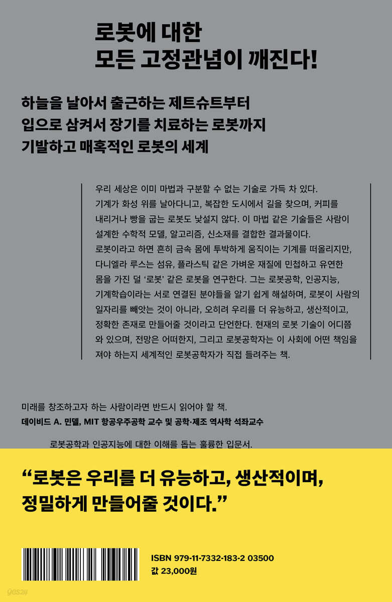 루스만큼 AI와 로봇공학의 현재와 미래를 설명할 수 있는 사람은 드물다. 이 분야를 움직이는 기술적 열정과 그 응용 및 사용에 수반되는 인간적 측면에 대한 깊이 있는 윤리적 시각을 결합한 독특한 통찰로 가득하다. 미래를 창조하고자 하는 사람이라면 반드시 읽어야 할 책. - 데이비드 A. 민델 (MIT 항공우주공학 교수 및 공학·제조 역사학 석좌교수)