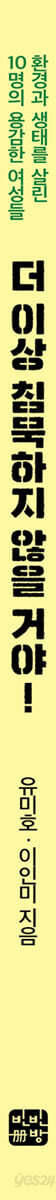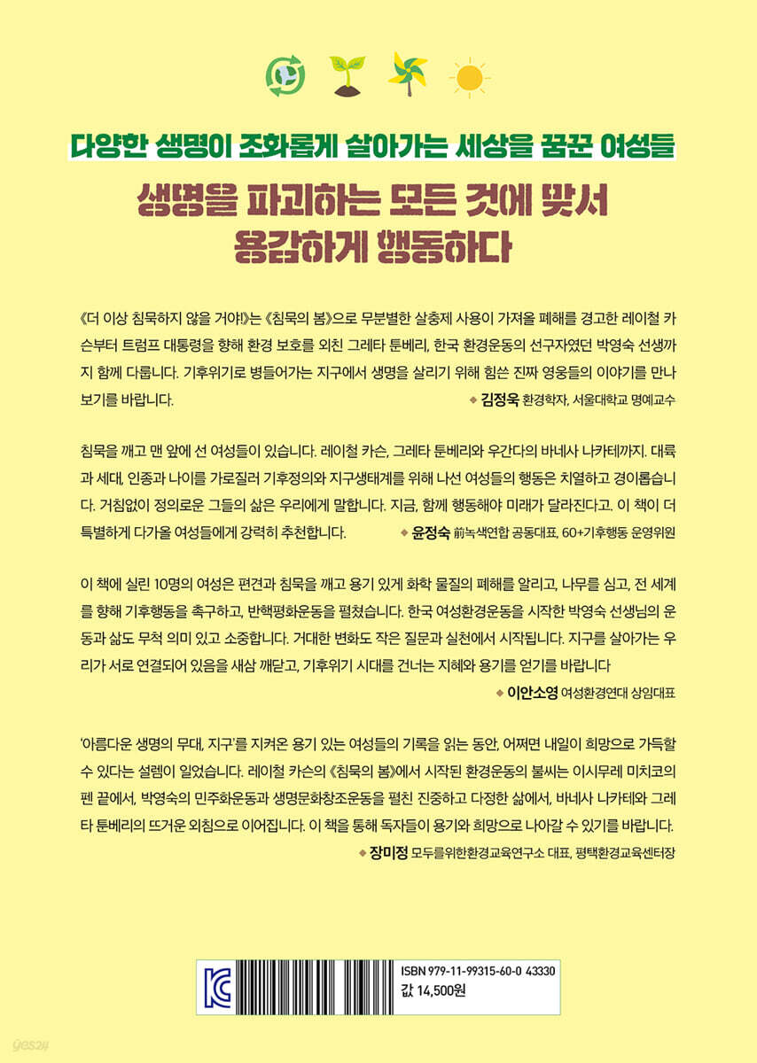 ‘아름다운 생명의 무대, 지구’를 지켜온 용기 있는 여성들의 기록을 읽는 동안, 어쩌면 내일이 희망으로 가득할 수 있다는 설렘이 일었습니다. 레이철 카슨의 《침묵의 봄》에서 시작된 환경운동의 불씨는 이시무레 미치코의 펜 끝에서, 박영숙의 민주화운동과 생명문화창조운동을 펼친 진중하고 다정한 삶에서, 바네사 나카테와 그레타 툰베리의 뜨거운 외침으로 이어집니다. 이 책을 통해 독자들이 용기와 희망으로 나아갈 수 있기를 바랍니다. - 장미정 (모두를위한환경교육연구소 대표, 평택환경교육센터장)