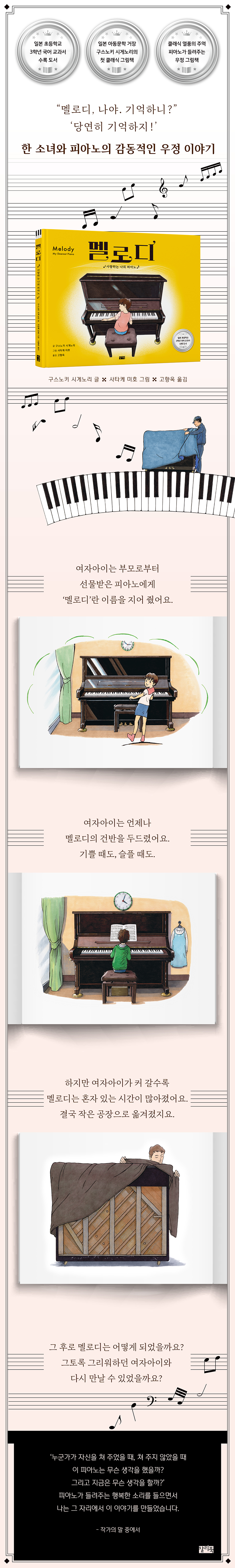 --- p.11 “이 피아노에 이름을 지어 줄래요. 으음……, 멜로디! 멜로디로 할래요! 그리고 저와 똑같이 오늘이 멜로디의 생일이에요.” --- p.15 ‘결국 나도 저렇게 망가져서 버려지겠지. 아, 그 아이가 마지막으로 한 번만 나를 쳐 주면 얼마나 좋을까.’ --- p.27 “어쩜, 소리 하나하나가 기뻐 춤추는 것 같네! 멜로디……, 그동안 너를 외롭게 둬서 미안해.” --- p.34 |