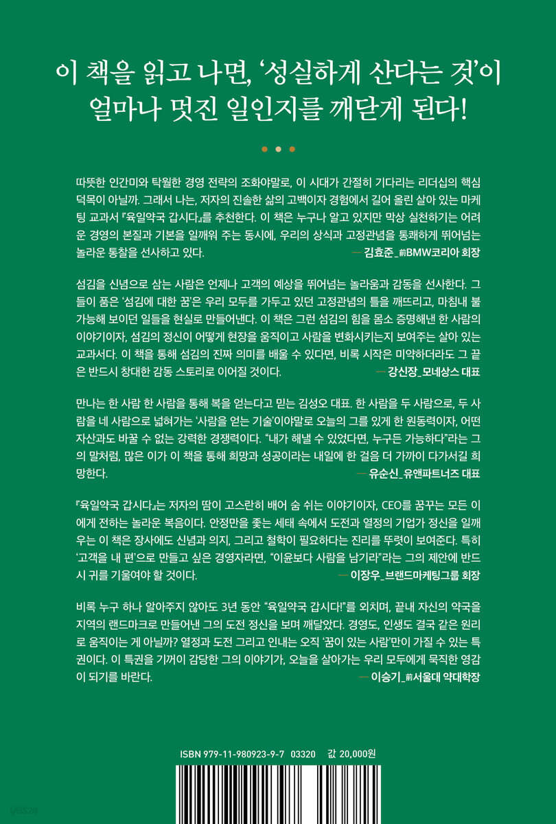 |chapter 1| 고객을 영업부장으로 만들어라 · “육일약국 갑시다!” · 정성이 대단한 사람 · 혁신의 가장 큰 장애물, 고정관념 · 약사님은, 한방 공부 중 · 물건을 팔기보다, 정성을 파는 마음으로 · 분수에 맞게, 힘닿는 만큼 · “지는 약사라예, 박사 아니라예” · 가장 효율적이고 지속적인 경쟁력, 마음 경영 · 상담 십계 |chapter 2| 고객에게 앞서 구성원부터 감동시켜라 · 장사란, 이익보다 사람을 남기는 것 · 가장 강력한 성장의 언어, 칭찬 · 직장인 마인드 vs. 자영업자 마인드 · 노력의 마일리지 · 행동이 유일한 언어가 되는 순간 · 적군도 아군으로 만드는 비법 · 우는 아이 떡 하나 더 준다 |chapter 3| 이윤보다 사람을 남기는 장사를 하라 · ‘위기의 얼굴’을 하고 나타나는 기회 · 자금의 선순환 & 직원의 선순환 · 당신의 마케팅이 효과 없는 이유 · 기본에 충실할 것 · 문제는 경쟁이 아니라 ‘경쟁력’이다 · 불안을 견디는 힘 · 약국 (경영)합니다 · 적절한 타이밍의 미학 · ‘안 되는 것’과 ‘안 해본 건’ 다르다 |chapter 4| 나누고 베풀어라, 아버지의 유산 · 아버지의 생활신조 · 작은 데 충성한 자가 큰 데도 충성한다 · 복은 사람을 타고 온다 · 다음에, 언젠가, 나중에…. · 한 명의 회원으로 시작한 엠베스트 에필로그 내가 바라본 김성오 대표 |