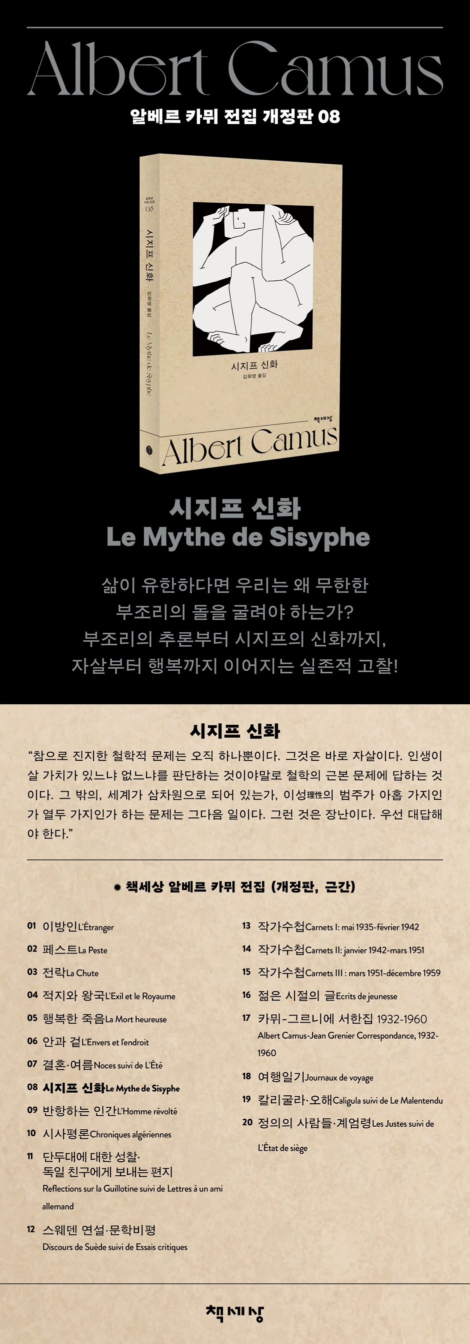 21세기 현대의 독자에게 생생하게 전하는 부조리와 반항의 정신을 만나다! 20세기, 양차 대전을 거치면서 세계는 물질적으로 황폐해졌고, 과학과 이성이 인류를 이롭게 한다는 신뢰가 무너지면서 삶에 회의를 느끼는 사람이 많았다. 카뮈는 이에 삶의 유한함을 인정하되('부조리') 그 테두리 안에서 최대한 격렬하게 삶을 긍정하는 '반항'을 권했다. 21세기 현재, 물질적으로는 풍족해지고 과학과 이성은 더욱 발전했지만, 물질만능주의와 사회적 갈등이 심화되면서 여전히 삶에 회의를 느끼는 사람이 많다. 그렇기 때문에 20세기 카뮈의 '반항적 낙관론'은 21세기 현대 독자에게 여전히 유효하다. 그럼에도 우리는 왜, 산 아래로 떨어질 돌을 계속 밀어 올려야 하는가? ‘부조리’의 신화가 시작된 카뮈의 대표 철학 에세이 《시지프 신화》 알베르 카뮈의 철학 에세이 《시지프 신화》는 소설 《이방인》, 희곡 《칼리굴라》와 함께 ‘부조리 3부작’ 중 하나로, 그의 작품 세계를 관통하는 ‘부조리’의 개념을 논한다. 여기에서 카뮈는 인간 존재와 세계와의 관계를 ‘부조리’한 것으로 파악하는 것으로 시작한다. 이어서 일상 속의 부조리와 하이데거·키르케고르 등의 실존철학자 후설 등의 현상학자들의 부조리 인식을 검토하고 이의 한계를 지적한다. 여기에서 끌어낸 추상의 부조리를 돈 후안, 배우 등 현실의 부조리(한 인간)로 이끌어낸 후 시지프(시시포스) 신화로부터 부조리의 부단한 의식에서 오는 자유와 행복을 설파한다. “참으로 진지한 철학적 문제는 자살”이라는 도발적 문구로 시작하는 이 에세이는 양차 대전 이후 무기력에 빠진 20세기의 대중을 대변한다. “인생이 살 가치가 있느냐 없느냐를 판단하는 것이야말로 철학의 근본 문제”라고 말하며, 삶의 이유를 묻는 것이다. 카뮈는 영원히 산 위로 바위를 밀어 올려야 하는 시지프의 운명에서 우리 인간의 삶을 보았다. 일상적인 권태와 허무에 빠져 허덕이는 독자에게, 세상에 내던져지면서 방황하는 우리 모두에게 삶을 직시하며 반항하고 여기에서 희망을 찾을 수 있음을 설파한다. 이러한 메시지는 20세기뿐만 아니라 21세기의 우리에게도 여전히 유효하다. 정본, 완본, 근본! 카뮈의 모든 것을 담은 책세상 알베르 카뮈 전집 카뮈의 정수를 가장 온전히 만나는 방법은 프랑스어로 그의 작품을 읽는 것일 테지만, 한국 독자들에게는 현실적으로 어려운 일이다. 책세상판 알베르 카뮈 전집은 국내 최고 카뮈 전문가 김화영 교수가 전권의 번역을 맡고, 작품의 정본으로 인정받는 프랑스 갈리마르 출판사의 플레야드판 전집(Œuvres completes)을 대본으로 삼아 카뮈의 작품 세계를 한국 독자들에게 온전히 전달하는 데 주안점을 두었다. 전 세계 여러 언어로 번역된 카뮈 전집 가운데 한 명의 번역자가 전권의 번역을 맡은 판본은 김화영 명예교수의 책세상판이 유일하다. 책세상은 1987년 프랑스 갈리마르 출판사와 알베르 카뮈 전집의 독점 출간 계약을 맺고, 국내 최고 카뮈 전문가 김화영 교수의 번역으로 《결혼·여름》(1987년)부터 《시사평론》(2009년)까지 23년에 걸쳐 총 20권의 알베르 카뮈 전집을 출간했다. 2011년부터 카뮈의 사후 저작권이 풀리면서 국내 여러 출판사에서 다양한 번역으로 알베르 카뮈의 대표 작품들이 출간되었지만, '전집'을 출간한 출판사는 2024년 지금까지도 책세상뿐이다. |