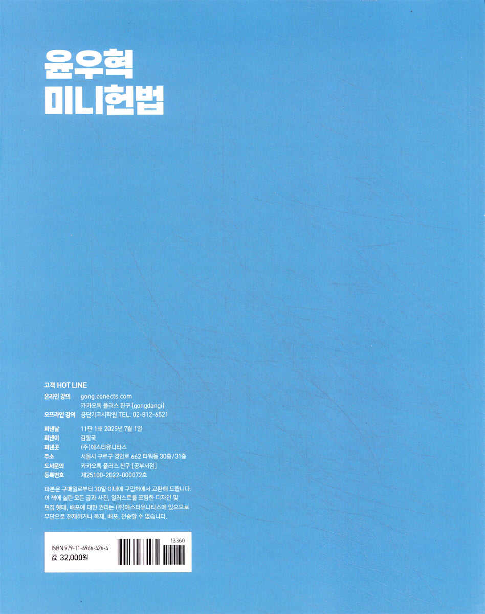 시험 직전, 최단시간 안에, 마지막 정리가 가능한 ‘2026 윤우혁 미니헌법’ 윤우혁 헌법은 남들과 똑같이 이야기하지 않습니다. 시간 단축과 이해력 향상을 동시에 잡을 수 있는 해법만을 제시합니다. 1. 테마정리로 마스터 효과 강화 헌법 전범위를 테마별로 정리하여 처음 접하는 수험생들이 전체적인 개요부터 빠르게 습득하고, 테마 하나하나씩 마스터할 수 있도록 구성하였습니다. 2. 수험에 최적화된 판례와 개별법령 요약서이지만 헌법을 이해하는 데 부족함이 없도록 수년간 철저히 기출을 분석하여 도출한 빈출판례와 법령을 수록하였습니다. 또한 출제가능성 여부에 따라 그 논점을 낱낱이 기술하였습니다. 3. 학습효과를 극대화하는 요약 정리 가장 중요하고 복잡한 헌법소송을 도해화하여 한눈에 파악할 수 있도록 하였고, 비교 가능한 이론은 ‘표’로 정리하여 정확한 개념학습이 가능하도록 하였습니다. |