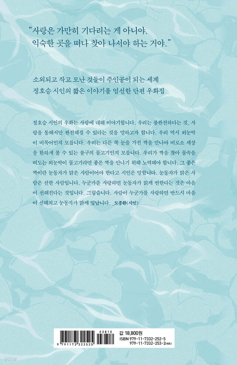 정호승 시인의 우화는 사랑에 대해 이야기합니다. 우리는 불완전하다는 것, 사랑을 통해서만 완전해질 수 있다는 것을 말하고자 합니다. 우리 역시 외눈박이 비목어인지 모릅니다. 우리는 다른 쪽 눈을 가진 짝을 만나야 비로소 세상을 환하게 볼 수 있는 불구의 물고기인지 모릅니다. 우리가 짝을 찾아 물속을 떠도는 외눈박이 물고기라면 좋은 짝을 만나기 위해 노력해야 합니다. 그 좋은 짝이란 눈동자가 맑은 사람이어야 한다고 시인은 말합니다. 눈동자가 맑은 사람은 선한 사람입니다. 누군가를 사랑하면 눈동자가 맑게 변한다는 것은 마음이 선해진다는 것입니다. 그렇습니다. 사람이 누군가를 사랑하면 반드시 마음이 선해지고 눈동자가 맑게 빛납니다. - 도종환 (시인)