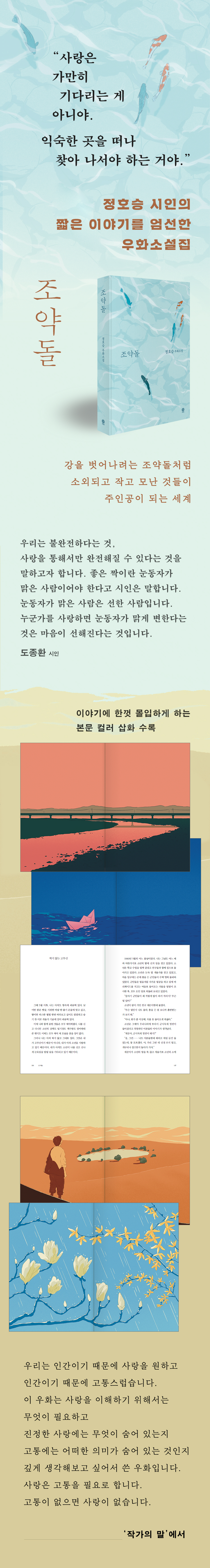 작은 존재의 눈으로 세상을 돌아보는 정호승의 짧은 이야기들 정호승 시인의 우화소설은 동식물이나 사물을 주인공으로 삼아, 우리가 평소 눈여겨보지 못한 것들의 시선으로 인간 세상을 새롭게 비추어 본다. 나무 한 그루를 품고 싶은 외로운 들판의 이야기, 인간의 말을 알아듣는 개의 이야기, 광주에서 총을 맞은 소년이 마지막으로 쥐고 있던 고무신의 이야기 등 《조약돌》은 인간이 아닌 존재들이 주인공으로 등장해 우리가 사는 세상을 거울처럼 비춘다. ‘정호승의 우화는 사랑에 대해 이야기한다. 우리는 불완전하다는 것, 사랑을 통해서만 완전해질 수 있다는 것을’이라는 도종환 시인의 추천사처럼, 1999년에 처음 출간되었던 《조약돌》은 초판 출간 후 20여 년이 지나 새로운 독자를 만나면서도 이 세상에 필요한 따스함을 온전히 간직하고 있다. 새로운 감각의 일러스트로 빛나는 새로운 장정 글과 그림이 어우러지며 피어나는 서정적인 세계 2025년 비채에서 펴내는 《조약돌》은 정호승 시인의 섬세하고 서정적인 세계를 오늘의 감각으로 새롭게 담아냈다. 동시대적 언어 감각으로 작품을 전면 다듬었으며, 주요 장면을 더욱 깊이 있게 경험할 수 있게끔 박선엽 일러스트레이터의 그림을 더해 새롭게 단장되었다. 책 곳곳에 삽입된 전면 풀컬러 삽화는 이야기의 감정을 시각적으로 환기하며 정호승의 우화 세계를 오늘날 감각으로 불러낸다. 세련된 표지와 고급 양장 제본은 《조약돌》을 처음 만나는 독자는 물론 오래전 이 이야기를 품었던 독자에게도 간직하고 싶은 욕구를 불러일으킨다. 《조약돌》이 품은 본질적 메시지는 시대가 바뀌어도 변함없이 단단하고 뚜렷하다. 누구의 시선에도 들지 못하고 제자리에 머무는 듯한 시간, 흐르고 흘러서 결국 닿고 싶은 어딘가가 있다는 희망만으로 버티는 순간들. 《조약돌》에 담긴 이야기들은 우리가 살아가는 삶의 감정과 존엄을 되짚어보게 한다. 강을 벗어나고 싶은 조약돌, 바다로 가고 싶은 종이배, 봄을 맞아 불꽃놀이처럼 피어나는 꽃망울들. 이야기 속의 존재들은 누구에게도 크게 보이지 않지만, 삶의 근원적인 외로움과 사랑의 가능성을 안고 있다. 그들의 이야기를 읽은 뒤 독자의 가슴속에는 작고 단단한 위로와 용기가 남는다. 《조약돌》은 새로운 세대에게는 스스로의 의미를 다시 찾을 용기를, 이미 이 이야기들과 함께 울고 웃었던 독자에게는 그때의 묵묵한 다짐을 다시 떠올리게 하는 위로를 전한다. |