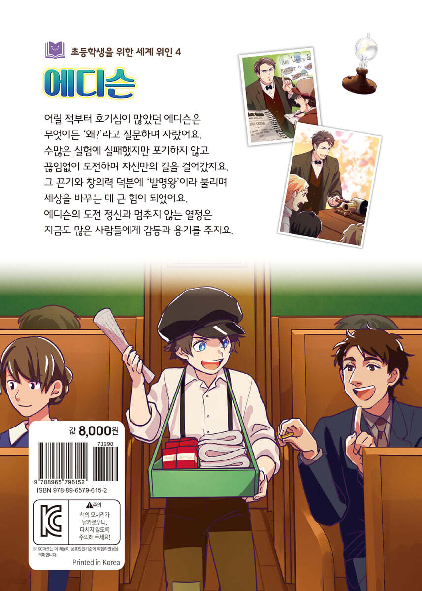 1. 호기심 많은 아이 2 거위의 알 3 집이 학교가 된 날 4 실험이 좋아! 5 작은 과학자 6 신문 팔며 배운 세상 7 내가 만든 신문 8 전신 공부 9 발명으로 가는 길 10 수많은 실패 11 성공의 순간 12 슬픔과 기쁨이 함께한 날 13 메리의 작은 양 14 절대 포기하지 않아! 15 빛나는 마을 16 새 연구소에서의 도전 17 영사기와 촬영기 18 발명왕 에디슨 19 에디슨과 친구들 20 전 세계를 밝힌 발명왕 인물에 관하여 더욱더 알고 싶은 에디슨 신문 에디슨 연표 올바른 독서 방법 더 생각해 보기 편지 쓰기 독서 기록장 |