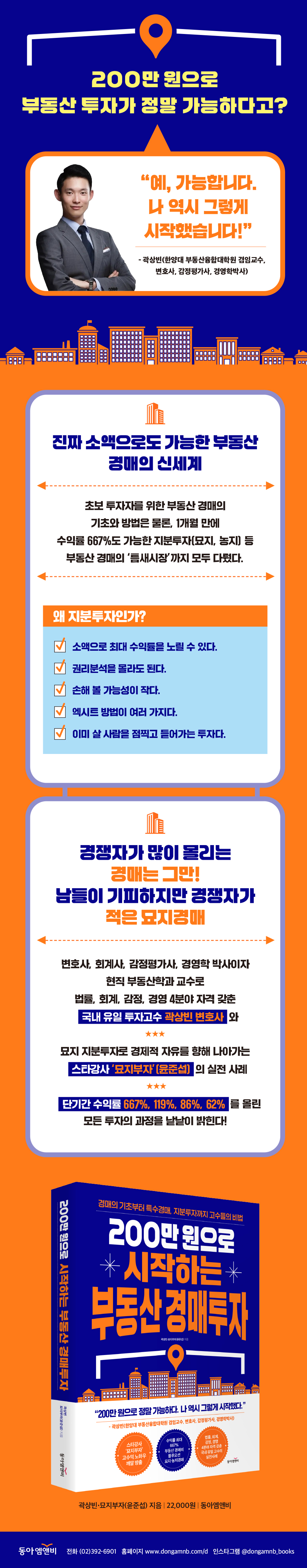 프롤로그 1. 200만 원으로 시작하는 ‘진짜 투자’의 문을 열며 _곽상빈2. 꿈이 없어 무기력했던 시절에서 경제적 자유를 얻기까지_ 윤준섭 1부. 부동산 경매, 절차와 방법1장. 부동산 경매의 기초 지식2장. 경매 물건 찾기: 방법과 전략3장. 권리분석과 주변 시세 파악 01. 권리분석의 의미02. 부동산 시세 확인4장. 현장으로 임장 가기01. 임장의 의미02. 임장에서 확인할 사항5장. 법원 가기 전 준비 사항6장. 낙찰받은 후 할 일2부. 200만 원으로도 가능한 묘지경매 7장. 왜 하필 묘지경매인가? 01. 묘지경매의 매력02. 묘지경매의 개념과 특징8장. 분묘기지권의 모든 것01. 분묘기지권의 3종류02. 설치하면 안 되는 곳에 설치된 묘지들9장. 묘지투자 과정 1: 좋은 물건 찾는 법01. 투자 가치가 있는 좋은 묘지02. 물건 검색하는 방법 03. 등기사항전부증명서 분석 방법10장. 묘지투자 과정 2: 임장과 입찰 준비01. 시세 파악하기02. 현장 조사(임장)03. 본격적인 입찰 준비3부. 낙찰받은 후 할 일: 잔금 납부부터 등기까지 11장. 경?공매 셀프등기 방법01. 경매 셀프등기02. 공매 셀프등기[더 알아보기] 농지 취득자격증명(농취증) 신청 과정12장. 공유자와 협상하기01. 내용증명 보내기02. 부동산 처분금지 가처분 신청03. 지급보증위탁계약 맺기04. 공유물분할 청구 소송[더 알아보기] 경매투자 협상의 기술13장. 매매 계약, 실사례로 하는 투자 실습01. 매매 계약 체결하는 방법02. 정말 특이했던 첫 번째 매도 사례03. 물건 하나에 3개의 필지를 낙찰받다!04. 공유 지분 물건이 아닌데 투자한 사례05. 불법적으로 설치된 묘지06. 구글어스에서 나만 발견한 보물, 수익률 667%07. 묘지와 농지가 공존하는 땅[부록] 1. 소액 농지 지분투자 사례01. 투자 기간 11개월, 수익률 119%02. 투자 기간 4개월, 수익률 62%2. 입찰서류 모음