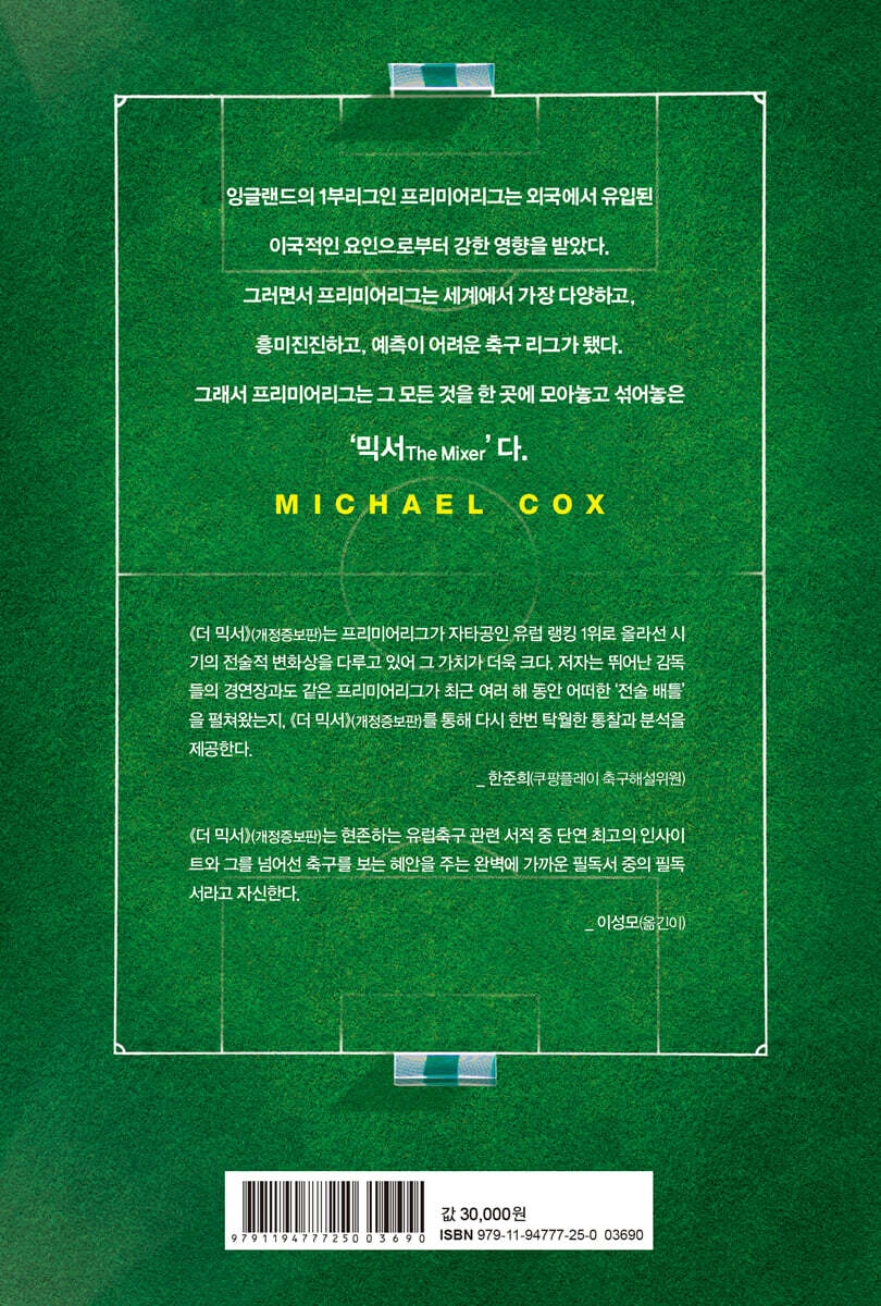 더 믹서》(개정증보판)는 현존하는 유럽 축구 관련 서적 중 단연 최고의 인사이트와 그를 넘어선 축구를 보는 혜안을 전해 주는 완벽에 가까운 필독서 중의 필독서라고 자신한다. - 이성모 (옮긴이)