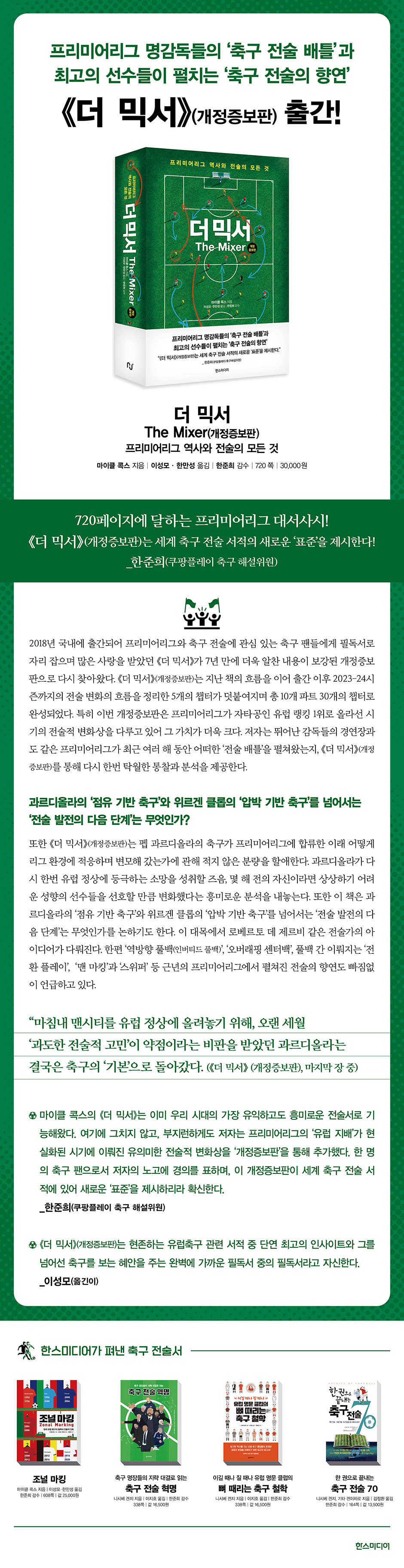 최고의 선수들이 펼치는 ‘축구 전술의 향연’ 과르디올라의 ‘점유 기반 축구’와 위르겐 클롭의 ‘압박 기반 축구’를 넘어서는 ‘전술 발전의 다음 단계’는 무엇인가? “《더 믹서》(개정증보판)는 프리미어리그가 자타공인 유럽 랭킹 1위로 올라선 시기의 전술적 변화상을 다루고 있어 그 가치가 더욱 크다. 저자는 뛰어난 감독들의 경연장과도 같은 프리미어리그가 최근 여러 해 동안 어떠한 ‘전술 배틀’을 펼쳐왔는지, 《더 믹서》(개정증보판)를 통해 다시 한번 탁월한 통찰과 분석을 제공한다.” _한준희(쿠팡플레이 축구 해설위원) ‘점유와 압박’의 대결 등 프리미어리그에서 최근 펼쳐졌던 전술의 향연 총정리! 《더 믹서》(개정증보판)는 펩 과르디올라의 축구가 프리미어리그에 합류한 이래 어떻게 리그 환경에 적응하며 변모해 갔는가에 관해 적지 않은 분량을 할애한다. 과르디올라가 다시 한번 유럽 정상에 등극하는 소망을 성취할 즈음, 몇 해 전의 자신이라면 상상하기 어려운 성향의 선수들을 선호할 만큼 변화했다는 흥미로운 분석을 내놓는다. 또한 이 책은 과르디올라의 ‘점유 기반 축구’와 위르겐 클롭의 ‘압박 기반 축구’를 넘어서는 ‘전술 발전의 다음 단계’는 무엇인가를 논하기도 한다. 이 대목에서 로베르토 데 제르비 같은 전술가의 아이디어가 다뤄진다. 한편 ‘역방향 풀백(인버티드 풀백)’, ‘오버래핑 센터백’, 풀백 간 이뤄지는 ‘전환 플레이’, 널리 쓰이진 않지만 상대의 의표를 찌르는 ‘맨 마킹’과 ‘스위퍼’ 등 근년의 프리미어리그에서 펼쳐진 전술의 향연도 빠짐없이 언급하고 있다. 프리미어리그의 전술과 역사를 깊이 있게 분석한 최고의 책 《더 믹서》(개정증보판)는 프리미어리그가 지난 30여 년 동안 어떤 변화를 겪으며 명실상부 유럽 최고의 축구 리그로 발전하게 되었는지 전술 변화라는 분석 틀로 살펴본 최초의 책이다. 이 책은 프리미어리그가 출범한 1992년 이후 잉글랜드를 중심으로 유럽 축구계를 강타했던 모든 전술적 변화의 흐름이 유럽 최정상급 축구 기자인 저자 특유의 세세하면서도 군더더기 없는 필체로 정리되어 있다. 퍼거슨 감독의 직선적인 축구로부터 키건이 이끈 뉴캐슬의 끝없이 공격하는 축구, 그리고 상대 팀에 대한 분석을 기반으로 하는 무리뉴의 첼시, 역습 축구로 우승을 차지한 라니에리의 레스터, 클롭의 압박 기반 축구와 과르디올라의 점유 기반 축구에 이르기까지, 《더 믹서》(개정증보판)는 지금까지 출간된 모든 축구 서적 중 가장 흥미롭고 유익하며 풍성한 내용이 담긴 책으로 유럽 축구를 좋아하는 팬이라면 반드시 소장해야 할 필독서 중의 필독서라 할 수 있다. 전 세계에서 가장 짜릿하고 흥미진진한 축구 리그로 성장한 비밀 저자는 프리미어리그가 세계적인 리그로 성장할 수 있었던 변화의 과정을 설명하면서 중요한 두 가지 요소에 대해 다룬다. 그 첫 번째는 전술적 관점이다. 1990년대 초만 해도 수비수는 수비만, 공격수는 공격만 하는 식으로 각 포지션마다 요구되는 역할이 매우 명확했다. 하지만 시간이 흐르면서 포지션의 경계가 점점 허물어졌고, 수비수에게는 빌드업을, 공격수에게는 전방 압박을 요구하게 되었다. 선수들이 점차 전문화된 역할보다 다재다능한 전천후 역할을 수행하게 된 것이다. 두 번째는 지리적 관점이다. 잉글랜드 클럽들은 시야를 넓히면서 외국인 선수와 감독에 점점 더 의존하게 되었다. 1992년 8월, 프리미어리그 출범 주간에 22개 클럽 전체를 통틀어 외국인 선발 선수는 단 11명이었고, 외국인 감독은 단 한 명도 없었다. 그런데 2023-24시즌에는 프리미어리그 선수와 감독 대다수가 외국인이 되었고, FIFA 랭킹 상위 30개국 중 프리미어리그에 뛰는 선수를 배출하지 못한 나라는 호주뿐일 정도로 거의 모든 주요 축구 강국이 프리미어리그에서 뛰는 선수를 보유하게 되었다. 프리미어리그 팀들은 이 두 가지 변화가 맞물리며 과거의 거칠고 단순한 직선적인 축구 스타일을 버리고, 보다 세련되고 기술 중심적인 유럽 스타일을 받아들이게 되었다. 이 책은 그 놀라운 전술적 진화의 이야기, 말하자면 ‘파이pie에서 빠에야paella로’, ‘루트 원Route one식 축구에서 폴스 나인False Nine’ 전술로의 변화를 담고 있다. 총 10개 파트로 구성한 프리미어리그 전술 변화의 흐름과 30개 챕터로 세세하게 소개한 감독과 선수, 구단의 스토리 이 책은 ‘프리미어리그의 태동 → 기술적 발전 → 유럽 무대로의 확장 → 보편화 → 대응 전술 → 직선적인 공격 → 점유율 축구 → 포스트 점유율 시대 → 유럽 지배 → 재창조’에 이르는 총 10개 파트로 프리미어리그 출범 이후 이뤄졌던 큰 흐름의 변화를 짚으면서 30개의 챕터로 세분화하여 다양한 주제로 상세하게 소개하고 있다. 저자는 이 책에서 프리미어리그의 지난 과거를 시즌별로 회고하는 것이 아니라, 전술 변화 중심으로 더 포괄적인 주제를 설명하는 데 집중했다. 특히 혁신적인 전술을 구사한 감독과 경기의 흐름을 바꾼 선수, 축구계에 영감을 불어넣은 팀, 새로운 전술 개념 그리고 경기 스타일에 영향을 준 경기장 밖의 변화 등 다양한 혁명