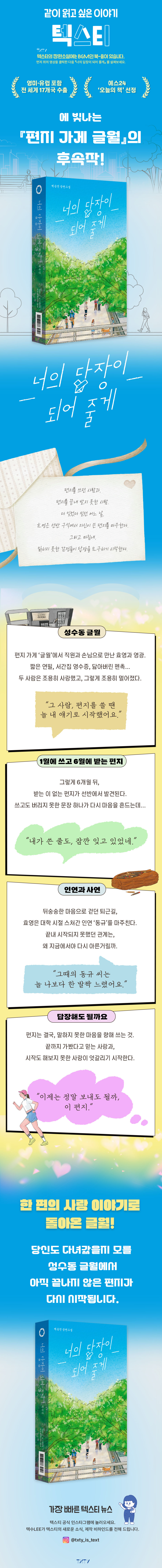 자연스러운 어색함 속에 끝나버린 우리. 이대로... 괜찮은 걸까? 연희동 편지 가게 ‘글월’에서 직원과 손님으로 만나 연인이 되었던, 효영과 영광. 효영은 ‘글월’ 성수점의 직원이 되어 일하며 영광과 함께 성수동에서 새로운 추억을 쌓았지만 영광이 끝내 벗어 던지지 못한 상처가 둘 사이에 작은 균열을 냈고, 시간이 지날수록 삐걱대면서 두 사람은 이별을 맞이한 상태. 6개월 뒤, 이제는 영광을 다 잊었다며 마음을 다독이던 효영은, 편지 가게 선반에서 이별 뒤 영광을 떠올리며 쓴 편지를 발견한다. 보내는 이는 있지만 받는 이는 없는 편지. 그야말로 선반 구석에 고여 있는, 외로운 편지. 그리고 얼마 후 효영은 퇴근길 성수동 거리에서 동규를 만난다. 20대 초반 영화학도 시절, 영화 커뮤니티에서 만난 인연. 채팅창에서 밤을 새워가며 영화 얘기를 하다가 술도 마시고 함께 독립영화관을 돌던 남자. 자기도 모르게 썸을 탔지만 연애까지는 가본 적 없는 마치 안 읽어 본 편지 같은 남자, 동규. 그렇게 끝까지 가봤다고 믿는 사랑과 시작도 해본 적 없던 사랑이 얽히기 시작한다. 편지 문화의 가치를 전달했던 1편의 고유성을 바탕으로 성수동과 서울숲에서 펼쳐지는 풋풋하고 아련한 ‘힐링 로맨스’ 『너의 답장이 되어 줄게』는 성수동의 트렌디한 분위기와 서울숲의 싱그러운 풍경 사이로 펼쳐지는 세 남녀의 연애 이야기를 다룬다. 1초면 안부를 물을 수 있는 세상에서, 편지가 우리 곁에 남아 있는 이유 중 하나가 ‘연애편지’덕이 아닐까 생각했다는 작가는 다 읽어 본 편지 같은 남자와 안 읽어 본 편지 같은 남자 사이에서 갈등하는 효영의 이야기를 이어 나가면서 ‘사랑’에 대해 고찰했다. 여느 로맨스 소설처럼 이 작품에도 연인 간의 갈등, 달콤한 대사, 기억에 남을 황홀한 장면 등 로맨스 장르를 구성하기 위한 재료들이 적절하게 포진되어 있지만 작가가 가장 공을 들였던 대목은 ‘사람이 다른 사람을 이해하고 마음을 여는 과정’이었다. 주인공 효영과 그녀의 남자들인 영광과 동규, 그리고 그들의 여러 주변 사람들이 서로를 이해하고 배려하려 애쓰는 모습을 따라가다 보면 애틋한 온기, 뭉클한 감동, 화사한 미소를 느낄 수 있다. 로맨스 장르에서 더욱더 빛을 발하는 특유의 다정한 시선, 섬세한 감각. 그것을 구현하는 필사 유발 ‘백승연 표 문장들’ 『편지 가게 글월』과 마찬가지로 『너의 답장이 되어 줄게』 또한 밑줄 긋고 싶고, 따로 적어 수시로 꺼내 읽고 싶은 표현들이 그득한 작품이다. 사람, 풍경, 감정을 자세히 그리고 집요하게 들여다보는 끈기와 성실함의 산물인 ‘백승연 표 문장들’은 사람을 밑바닥까지 드러내고, 풍경에 서사를 쌓게 하고, 감정을 종잡을 수 없이 요동치게 하는 ‘연애’라는 사건과 만나 그 스펙트럼이 얼마나 확장될 수 있는지 그 단단함과 유연함을 톡톡히 보여준다. 자연스럽게 공간을 떠올리게 하고, 그 속의 사람을 생생하게 구현하고, 그 내면으로 한 걸음 한 걸음 내딛게 하는 문장과 문장을 읽어나가다 보면 독자는 어느새 극 중 인물이 되어 있고 극 중 인물을 통해 어쩌면 보듬어 주지 않고 있던 자신을 만나게 된다. 타인을 이해하고 배려하는 과정을 기록하는 것처럼 쓰인 이 로맨스는 그렇게 독자가 자신을 조금 더 사랑할 수 있는 길로 이르는 문장의 징검다리를 건너게 한다. 영미·유럽 포함 전 세계 17개국 수출 『편지 가게 글월』의 후속작 전 세계인의 사랑을 받을 만한, 포텐셜 강한 K-소설 시리즈 『편지 가게 글월』이 2024년 런던국제도서전 화제작으로 조명받고, 출간 전 유럽 주요 국가에 수출될 수 있었던 이유는 아이러니하게도 ‘편지의 소멸 위기’가 전 세계적인 보편 현상인 와중에 편지에 대한 그리움 또한 커져 나가고 있기 때문이다. 연희동과 성수동에서 운영 중인 ‘글월’이 그 증거다. 『편지 가게 글월』의 첫 해외판이 출간된 이탈리아에서 어느 독자분이 ‘글월’로 연락을 해 책에 대한 감상을 전하면서 펜팔 편지를 보낼 수 있는지 물었다고 한다. 그만큼 ‘글월’에서 피어나는 이야기는 편지가 전하는 진실한 감정과 섬세한 감성을 온전히 경험하기에 적합하다. 『너의 답장이 되어 줄게』는 ‘성수동 글월’을 배경으로 힐링에 초점을 맞추었던 전작으로부터 한발 더 나아가 ‘사랑’과 ‘연애’라는 테마를 품고 편지에도 장르가 있다면 연애편지가 최고의 편지 장르라고 이야기하듯 떨림과 울림이 있는 이야기를 선사한다. 세계 시장에서 보다 대중적인 장르인 로맨스로 풀어낸 편지 가게 ‘글월’ 이야기는 더 넓게 퍼져 나갈 것이다. |