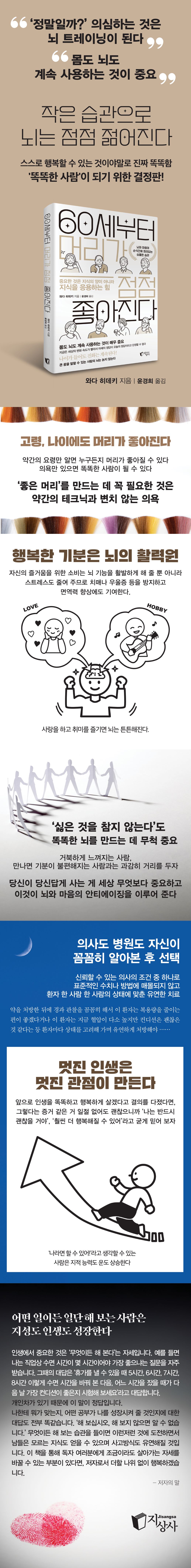 제00장 나이가 몇 살이라도 사람은 머리를 좋게 만들 수 있다 · ‘좋은 머리’를 만드는 데 꼭 필요한 것은 약간의 테크닉과 변치 않는 의욕 · 60세부터는 ‘머리가 좋다’의 의미가 바뀐다 · 시니어의 ‘좋은 머리’에 학력과 직위는 관계없다 · 전두엽 활성화로 머리도 몸도 젊게 유지할 수 있다 · 나이 든 지금이야말로 좋은 머리가 될 잠재력이 있다 · 나만의 생각을 가질 수 있는 사람에게는 지성과 매력이 있다 · 고령이 되고 나서 인생의 전성기를 맞이한 사람들 · 인생의 클라이맥스는 시니어가 된 뒤에 오는 편이 훨씬 즐겁다 · 스스로 행복할 수 있는 것이야말로 진짜 똑똑함 제01장 작은 습관으로 뇌는 점점 젊어진다 · 젊었을 때보다 뇌의 기능을 향상하는 것은 충분히 가능하다 · 전두엽을 단련할수록 노화는 멈추고 머리는 좋아진다 · 새로운 가게, 새로운 취미… 전두엽은 ‘새로운 경험’을 가장 좋아한다 · 예상외의 일이 일어날 때마다 뇌는 젊어진다 · ‘일단 해 보자’고 생각하는 사람의 뇌는 잘 돌아간다. · 스스로 자신을 격려할 수 있는 사람은 뇌도 마음도 건강하다 · ‘이게 정말일까?’라고 의심해 보는 것은 뇌 트레이닝이 된다 · 백인가 흑인가 단정 짓지 말고 회색도 받아들이는 유연함을 갖는다 · ‘좀 더 편한 방법은 없나?’라며 꾀돌이처럼 생각하면 머리는 풀회전한다 · 큰 꿈을 말할 수 있는 사람의 뇌는 늙지 않는다 · 좋아하는 것을 먹고 자주 걸으면 뇌의 기초 체력이 붙는다 · 머리를 좋게 하는 식생활의 키워드는 고기와 비타민C · 기억나지 않는다고 곧바로 ‘그거 말이야’, ‘저거 말이야’ 하지 말고 기억의 한계까지 노력한다 · 일기를 쓴다, 메모를 적는다 같은 ‘기록 행위’는 뇌를 자극한다 · 대화를 잘하는 사람은 치매의 진행이 느리다 · 전두엽은 뇌 훈련보다 취미와 사랑을 즐길 때 더 기뻐한다 · 싫어하는 것, 싫은 사람과 당당히 거리를 두어서 뇌가 늙지 않게 한다 · 몸도 뇌도 계속 사용하는 것이 중요하다 · ‘이 나이에 무슨’이란 말은 절대 봉인한다 제02장 60세부터의 지성이란 ‘재미’와 ‘품격’ · 중요한 것은 지식의 양이 아니라 지식을 응용하는 힘 · 당신의 평범한 이야기가 젊은이에게는 재미 · 상식에 얽매여 작게 움츠러드는 것이 솔직히 더 큰 리스크 · 약간의 반골 정신이 좋은 머리의 기폭제가 된다 · 똑똑한 사람은 무엇이든 해 보지 않으면 모른다는 것을 알고 있다 · 실패 경험 없는 성공인은 없다 · ‘그렇게 생각할 수도 있군요’라고 말할 수 있는 사람에게는 지성과 품격이 있다 · 사물을 다면적으로 생각할 수 있는 사람은 똑똑하고 우아하다 · 언어 능력이란 어려운 것을 알기 쉽게 표현하는 힘 · ‘정리하는 힘’이 있어야 비로소 ‘전달하는 힘’이 발휘된다 · 책이나 신문 등을 읽으면 내용을 정리해 본다 · 비유를 잘하는 사람의 이야기는 이해하기 쉽다 · 스피치를 해야 한다면 사전에 원고를 준비한다 · 머리가 좋은 사람, 이야기를 잘하는 사람은 남모르게 노력하고 있다 · 말 잘하는 방법? 훈련을 하면 누구나 가능하다 제03장 노화와 질병에 똑똑하게 대처한다 · 의사가 말하는 대로 하지 않는 현명함을 갖자 · 의사도 병원도 자신이 꼼꼼히 알아본 후 선택한다 · 건강 검진을 절대시할 필요는 없다고 이해한다 · 노화에 맞서기, 이것이 즐겁게 살기 위한 어른의 지성 · 노화를 받아들이는 것도 풍요로운 마음으로 살기 위한 지혜 · ‘질병과 함께 산다’는 태도가 정신을 안정시킨다 · 할 수 없는 일을 무언가에 의지하는 것은 머리 좋은 생활을 위한 비법 · 머리가 좋은 사람은 치매를 무턱대고 두려워하지 않는다 · 치매의 긍정적인 면을 알아 두자 제04장 기분 좋게 사는 것이 최고의 지성 · 언제나 좋은 기분으로 지내는 것이 똑똑하고 행복하게 살기 위한 최고의 전략 · ‘이미 갖고 있는 것’, ‘할 수 있는 것’을 소중히 여기는 행복 찾기의 달인이 된다 · 명랑함과 사교성은 높은 사회성을 말해 준다 · 감정 컨트롤을 할 수 없는 사람은 머리가 나빠 보인다 · 생각이 얕고 부정적인 감정을 곧바로 분출하는 사람 · 자신 감정의 ‘사용설명서’를 갖는 건 기분이 좋아지는 첫걸음 · 될 수 있으면 세상을 가볍게, 가볍게 생각하는 것이 똑똑하게 사는 비결 · 100점을 목표로 하지 않는다. 자신을 칭찬할 수 있는 사람은 인생이 잘 풀린다 · 당신은 무조건 멋진 존재 · 다른 사람의 좋은 점을 칭찬하는 사람한테는 여유와 지성이 느껴진다 · 천진난만한 사고를 할 수 있는 사람은 머리도 운도 좋아진다 · ‘나라면 할 수 있어!’라고 근거 없이 생각할 수 있는 사람은 지성도 인생도 향상된다 · 다른 사람과 비교하는 것은 무의미 지성이 있는 사람의 좌우명은 ‘나는 나’ · 다른 사람의 말과 태도에 일희일비하는 것은 그 사람에게 조종당하는 것과 같다 · 고독도 멋진 것 내 기분이 좋아지는 ‘행복 리스트’를 만들자 · 치매보다 무서운 노년기 우울증에 주의를 기울인다 · 사람은 어차피 죽는다 그러니까 있는 힘껏 내 맘대로 산다 · 죽음은 누구에게나 찾아온다. 지나치게 두려워하지 않는 것도 똑똑함의 하나 · 정