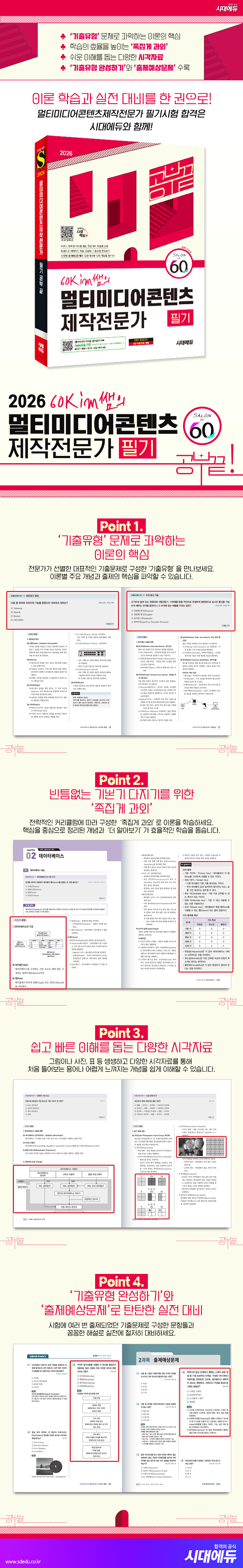 본서의 체계적인 구성이 시험을 준비하는 누구나 시험에 효율적으로 합격할 수 있는 방법을 제시합니다. 학습을 시작하기에 앞서 ‘기출유형’을 통해 대표적인 문제의 유형을 파악하고, ‘족집게 과외’로 이론을 탄탄히 다져보세요. 처음 접하는 이론도 쉽고 정확하게 이해할 수 있도록 그림과 사진, 표 등 다양한 시각자료를 수록하였습니다. ‘더 알아보기’를 통해 심화 개념까지 숙지하여 더욱 깊이 있는 학습을 할 수 있습니다. 이론 학습을 마쳤다면 ‘기출유형 완성하기’와 ‘출제예상문제’로 실전에 철저히 대비하세요. 전문가가 직접 선별한 문제들을 풀어보며 출제의 맥락을 파악하고 쌓아온 실력을 점검할 수 있습니다. 꼼꼼하고 명쾌한 해설을 살펴보며 부족한 부분을 보완하고 반복적으로 살펴본다면 합격은 여러분의 것입니다. 시대에듀는 본서와 함께 멀티미디어콘텐츠제작전문가 필기시험에 도전하는 수험생 여러분의 합격을 진심으로 기원합니다. |