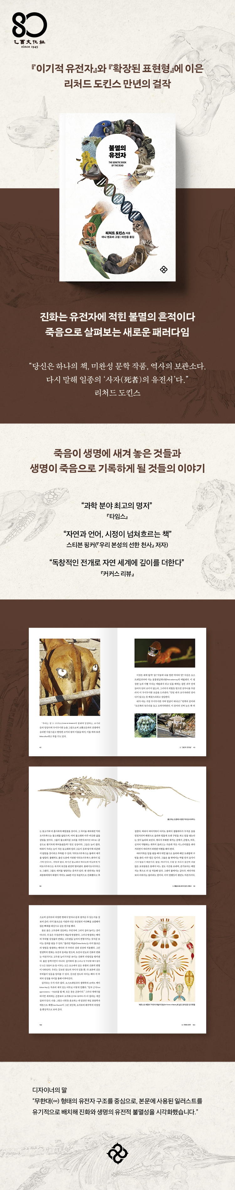 진화는 유전자에 적힌 불멸의 기록이다리처드 도킨스 만년의 걸작이 책은 세계적인 석학이자 진화와 유전자의 패러다임을 바꿨다고 평가받는 리처드 도킨스의 최신작으로 저자의 냉철한 식견과 특유의 위트 넘치는 문체가 돋보인다. 도킨스는 『이기적 유전자』에서 보였던 유전자 중심의 관점에서 한 걸음 더 나아가 과거의 연대기이자 다윈의 자연선택에 의해 쓰이고 편집되는 한 권의 책으로서 진화를 바라본다. 도킨스는 각 개체가 일종의 저서이자 미완성 문학 작품이며 역사의 보관소라고 주장한다. 개체의 몸과 유전체에는 오래전에 사라졌지만 연속되었던 다채로운 세계를 유추해 볼 수 있는 정보들이 남아 있다. 즉, 우리는 어떤 의미에서 ‘사자(死者)의 유전서(genetic book of the dead)’라 할 수 있다. 동시에 사자의 유전서는 미래 예측서이기도 하다. 각 유전체는 미래가 과거와 그다지 다르지 않을 것이라는 합리적인 가정하에 생존과 번식에 유리한 유전자를 고르며, 이러한 선택은 대체로 성공한다. 이러한 관점에서 도킨스는 유전자 중심의 시각에서 좀 더 나아가 과거를 ‘돌아보기’도 하고 생물의 각인이라 불리는 현상으로 일종의 뒷거울에 ‘비춰 보기’도 한다. 도킨스는 이 외에도 각종 동물, 식물, 균류, 세균, 고세균까지 동원해 가며 자신의 흥미로운 시각을 독자들에게 알기 쉽게 설명하고 있다. 책의 본문에 같이 실린 도판은 독자들에게 또 다른 지적 호기심을 유발한다. 화려한 일러스트와 책의 내용을 돕는 사진들은 독자의 이해를 도우면서도 딱딱한 이론서가 아닌, 교양 과학서로서 보는 즐거움을 선사한다. 아울러 가상의 여성 과학자인 소프를 중간중간 이야기에 참여시켜 자칫 딱딱하고 어려워질 수 있는 학문적 내용들을 재미있게 전하는 것도 특징이다. 저자는 책 전반에 걸쳐 개체를 둘러싼 환경과 이에 얽힌 자연선택의 과정 및 결정이 어떻게 유전자에 새겨지는지를 차근차근 설명해 나간다. 이 과정에서 그의 대표작이라 할 수 있는 『이기적 유전자』와 『확장된 표현형』 등 이전 저서들에서 상세히 논의했던 개념들을 마치 그물을 짜듯 촘촘하게 하나의 이야기로 엮어 나간다. 도킨스가 그간 여러 명저에서 펼쳤던 다양한 주장들이 한 권에 모여 있는 듯한 이 책은 저자 특유의 새로운 시각과 비유까지 덧붙여져 있어 독자로 하여금 자신을 둘러싼 자연 전체를 새로운 시각으로 바라보게 해 준다.죽음의 기록으로 살펴보는진화의 새로운 패러다임이 책은 진화와 자연선택, 유전자 등 다소 낯설고 어려운 소재들을 다루면서도 생물의 위장, 의태, 수렴 진화 같은 흥미로우면서도 익숙한 사례들을 소개하면서 이야기를 전개해 나간다. 도킨스는 우리가 흔히 자연과학 다큐멘터리 등에서 볼 수 있는 생물체의 기괴한 여러 모습에 얼마나 많은 의미가 담겨 있는지를 하나하나 파헤친다. 이를 통해 생물이 어떤 면에서는 기괴하고, 또 어떻게 보면 이해하기 힘든 모습을 보이는 이유는 모두 과거의 기록들이 적힌 유전자의 영향이자 일종의 예측에 따른 것임을 자세히 설명해 나간다. 예를 들어, 모하비사막의 사막뿔도마뱀에서 볼 수 있는 특유의 피부 색깔과 무늬는 그 개체가 사막에서 태어날 것이라는 유전자의 예측이 구현된 결과물이다. 사막뿔도마뱀 유전자는 자신을 후손에게 전달하는 일종의 ‘탈 것’인 개체가 모래와 돌로 뒤덮인 사막에서 태어나리라 예측하고 도마뱀의 피부와 무늬를 사막 환경에 맞춰 만들도록 조정한다. 바꿔 이야기하자면, 기술적으로 가능하기만 하다면 우리는 사막뿔도마뱀의 유전자를 분석해서 이 개체의 피부색을 예측할 수 있을 뿐만 아니라, 어떤 환경에서 살아갈 것인지도 알아낼 수 있다. 유전자를 조상 세계가 적힌 하나의 문서로 읽을 수 있는 셈이다. 사막뿔도마뱀의 경우 단순히 피부색과 무늬뿐만 아니라 모든 기관과 세포, 생화학적 과정에 이르기까지 과거 조상들이 살았던 사막이라는 환경에 적합하게 세밀하게 구조화되어 있다. 도킨스는 이러한 기록물인 유전자 위에 현재의 변화하는 환경과 돌연변이의 기록이 덧씌워진다고 말한다. 이런 과정은 오래전 서양에서 버리기가 아까워 적었던 글을 지우고 그 위에 새로운 글을 써 왔던 양피지(팰림프세스트)와 비슷하다고 볼 수 있다. 이 외에도 책에서는 다양하고 진귀한 생물들의 사례를 들어가며 죽음과 이를 뛰어넘는 유전의 힘을 설명한다. 이를 통해 도킨스가 왜 최고의 과학자이자 저술가로서 독자들에게 사랑받는지를 명쾌하게 보여 준다. 본서는 그의 대표작인 『이기적 유전자』와 『확장된 표현형』을 잇는 또 하나의 과학서로 손색이 없는 걸작이라 할 수 있다.“독창적인 전개로 자연 세계에 깊이를 더한다.”- 「커커스 리뷰」“유전자의 관점에서 바라본 자연을 다채롭게 여행한다. 왜 도킨스가 여전히 최고의과학자인지 다시 한번 일깨워 준다.”- 「타임스」