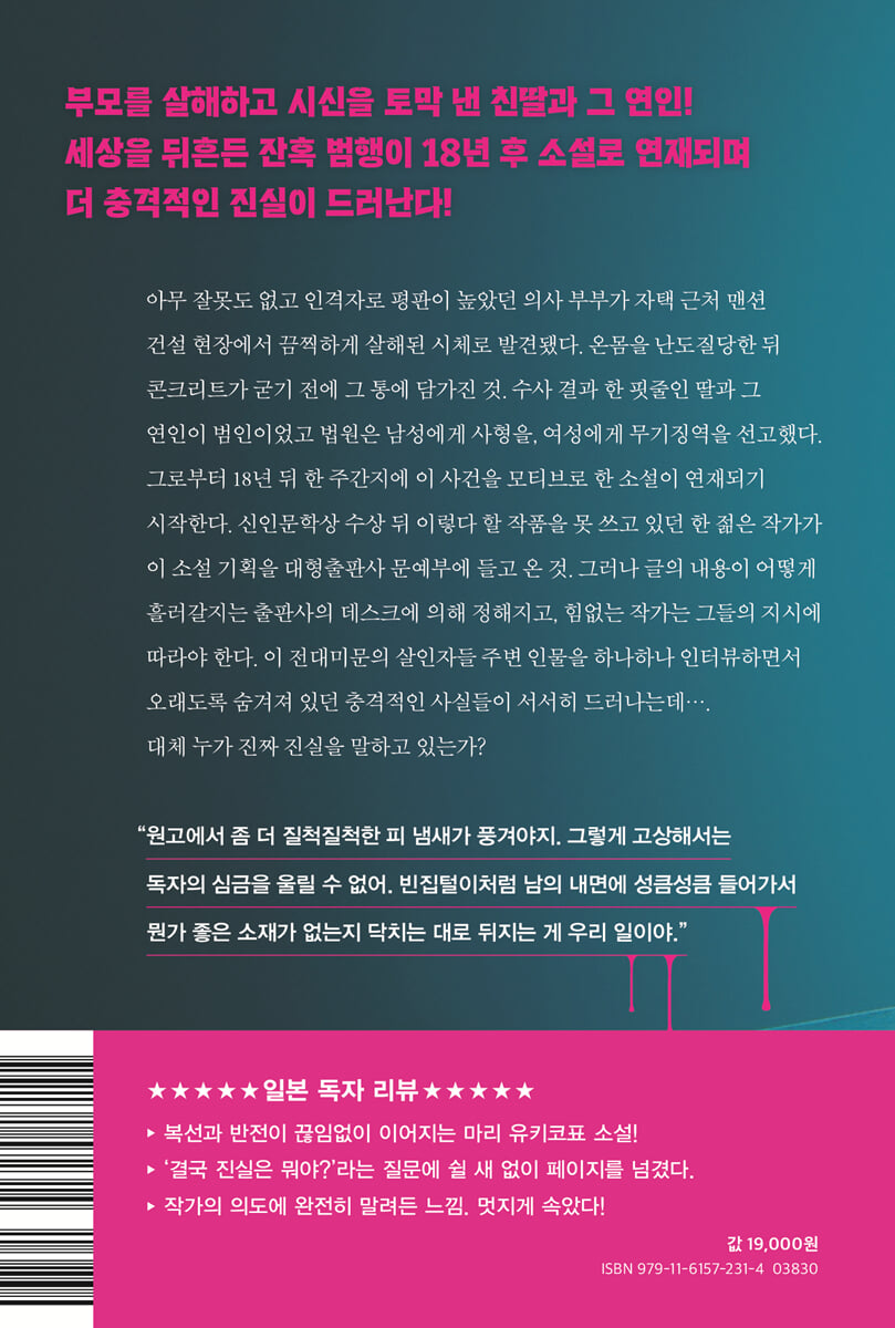 그렇게 고상해서는 독자의 심금을 울릴 수 없어. 빈집털이처럼 남의 내면에 성큼성큼 들어가서 뭔가 좋은 소재가 없는지 닥치는 대로 뒤지는 게 우리 일이야.’ 아무 잘못도 없고 인격자로 평판이 높았던 의사 부부가 자택 근처 맨션 건설 현장에서 끔찍하게 살해된 시체로 발견됐다. 온몸을 난도질당한 뒤 콘크리트가 굳기 전에 그 통에 담가진 것. 수사 결과 한 핏줄인 딸 아오타 사야코와 그 연인 오부치 히데유키가 범인이었고 법원은 아오타 사야코에게 무기징역을, 오부치 히데유키에게 사형을 선고했다. 사건이 일어나고 18년 뒤 한 주간지에 이 일명 ‘분쿄구 부모 강도 살인 사건’을 모티브로 한 소설이 연재되기 시작한다. 신인문학상 수상 뒤 이렇다 할 작품을 못 쓰고 있던 한 젊은 작가가 이 소설 기획을 대형 출판사인 도도로키쇼보 문예부 편집자 하시모토에게 들고 온 것. 그러나 글의 내용이 어떻게 흘러갈지는 도도로키쇼보 출판사의 데스크에 의해 정해지고, 힘없는 편집자는 그보다 훨씬 더 힘없는 작가에게 집필을 위한 인터뷰 취재를 지시하는 동시에 데스크에게서 하달받은 집필 방향을 작가에게 강요한다. 젊은 작가는 속으로 애써 울분을 진정시키며 이 서열 구조에 동참하여 글을 써나간다. 다시 쓰기와 고쳐 쓰기를 몸이 상하도록 반복하면서, 이 전대미문의 살인자들 주변 인물을 하나하나 인터뷰하는 와중에 오래도록 숨겨져 있던 충격적인 사실들이 서서히 드러난다. 사건 기록을 위해 재판을 참관했던 법정 화가 레이코는 아오타 사야코가 주도해 일으킨 사건이라고 단언하며 자신이 오부치 히데유키의 사형이 확정되기 전 그와 옥중 결혼했다고 밝힌다. 오부치 히데유키가 고등학생 때부터 일하던 이벤트 회사 사장은 그가 소행이 안 좋긴 헀지만 그렇게 엄청난 사건을 저지르진 않았을 것 같다며 아오타 사야코가 그의 마음에 들려고 필사적이었다는 것을 털어놓는다, 사건을 파고들수록 점점 더 혼란에 빠져드는 작가에게 편집자는 말한다. “독자의 가슴이 두근거릴 만한 ‘수수께끼’가 부족해. 그야 그렇겠지? 소설의 모티브인 ‘분쿄구 부모 강도 살인 사건’은 대중들이 보기에 이미 해결된 사건이니까. 아무리 잔인한 사건이라도 ‘해결’되면 대중의 흥미는 식는 법이야.” (69-70쪽) 독자가 감정 이입할 시점을 어떻게 설정하고, 독자가 가슴 졸일 수수께끼를 어느 지점에서 만들어야 할까? 오부치 히데유키의 전 애인이자 도도로키쇼보의 편집자였던 이치카와 세이코는 오부치 히데유키가 천성적으로 여자를 후리는 데 타고났다며 그가 아오타 사야코를 어떻게 만나기 시작했는지 격한 흥분에 휩싸여 얘기한다. 또한 사건 현장인 ‘언덕 위의 빨간 지붕’ 집 이웃 오가타는 사야코의 어린 시절이 어떠했는지, 사건 당일 밤에 그 집의 상황이 어떠했는지 설명하다가, 얼마 전 교도소에서 사야코에 관한 이상한 소문을 들었다고 덧붙이는데……. 제삼자들의 말로만 전해 듣던 사야코에게 무슨 일이 일어났을까? 누구를 주범으로 설정하여 소설을 이끌어갈 것인가? 대체 누가 진짜 진실을 말하고 있는가? 진실을 말하든 거짓을 말하든 작가, 편집자, 증인, 피의자 모두는 각자 원하는 바를 달성할 것인가? 복선과 반전이 계속되는 가운데 작가의 의도에 말려들지 않으려면 페이지를 넘기는 손을 잠시 멈춰야 할지 모른다. 철저히 투명 인간으로 살아오길 30여 년. 가족과 레이코 사이에 생긴 골은 회복 불가능할 만큼 깊어졌고, 블랙홀 같은 절망만 매일 생겨났다. […] 계속 투명 인간으로 지내다 보면 언젠가 진짜 아버지와 어머니가 부활해서 ‘레이코, 미안해! 외로웠지’ 하고 끌어안아주지 않을까. 그런 실낱같은 희망을 품고 있었지만, 30년 넘게 지나서야 그런 날은 영원히 찾아오지 않는다는 걸 깨달았다. (298-299쪽) |