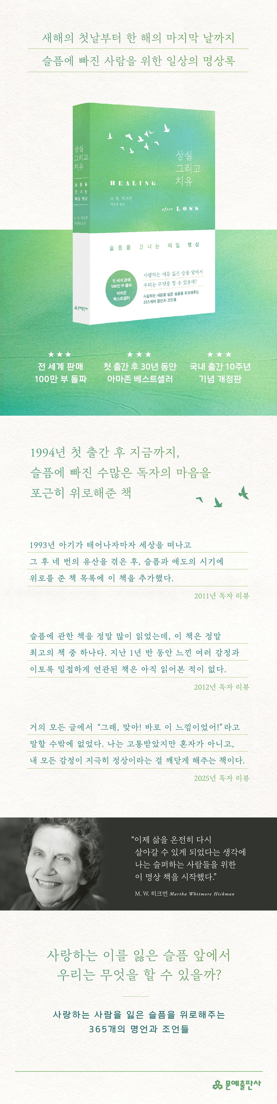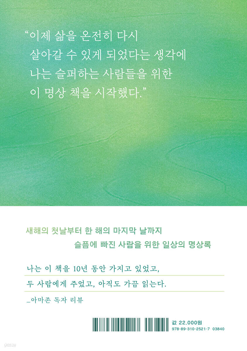 슬픔에 빠진 사람을 위한 일상의 명상록 ★전 세계 판매 100만 부 돌파 ★1994년 첫 출간 후 꾸준히 아마존 베스트셀러 ★국내 출간 10주년 기념 개정판 M. W. 히크먼의 《상실 그리고 치유》는 1994년에 처음 출간되었다. 이후 2001년 9?11 테러 이후 상실의 충격과 슬픔에 빠진 미국 독자들에게 큰 위로를 주었고, 이후 전 세계 여러 나라에 번역되어 독자층을 넓혔다. 그리고 첫 출간 후 30년이 지난 지금까지도 꾸준히 감동적인 후기가 올라오는 등 상실의 슬픔으로 힘겨워하는 사람에게 꾸준히 최고의 조력자가 되어주었다. 《상실 그리고 치유》는 심리학 서적이나 이론서가 아니다. 히크먼은 전문적인 조언을 건네기 위해 이 책을 쓰지 않았다. 위로하고 공감하기 위해 썼다. 히크먼 역시 사랑하는 이를 먼저 떠나보낸 후 극심한 슬픔 속에서 산 경험이 있기 때문이다. 콜로라도 산맥에서 휴가를 즐기던 어느 화창한 여름날, 그녀의 딸은 낙마 사고로 세상을 떠났다. 이 슬픔을 딛고 다시 일상으로 돌아오기까지는 오랜 시간이 필요했다. 그리고 그녀가 다시 온전한 삶을 찾았다고 느꼈을 때, 자신과 같은 아픔으로 고통받는 사람들을 위해 이 책을 쓰기 시작했다. 사랑하는 이를 잃은 슬픔 앞에서 우리는 무엇을 할 수 있을까? 사랑하는 사람을 잃은 슬픔을 위로해주는 365개의 명언과 조언들 1월 1일부터 12월 31일까지, 《상실 그리고 치유》는 슬픔을 건너는 매일 명상법을 제안한다. 어느 달, 어느 날부터 펼쳐도 상관없다. 슬픔을 통과하는 데는 정해진 길이 없기 때문이다. 본문이 격언, 명상록, 조언 등으로 짧게 구성된 것도 히크먼의 경험에서 비롯되었다. 슬픔을 처음 겪을 때는 집중할 수 있는 시간이 짧고, 함축적인 생각이 더 도움이 된다는 자신의 경험을 기반으로 더 많은 사람에게 편안하게 다가갈 방법을 고안한 것이다. 이 책에는 슬픔 이후 찾아오는 여러 순간에 대한 적절하면서도 실용적인, 종종 감동적인 방법들이 담겨 있다. 사람들은 곧잘 자신이 슬픔에서 벗어나면 세상을 떠난 사람과 연결된 끈이 끊어지는 것 아닐까 싶어 죄책감을 가진다. 반대로 이제는 일상을 되찾았다고 생각했는데 느닷없이 거대한 슬픔이 또다시 불쑥 찾아오기도 한다. 선한 의도를 갖고 다가온 사람들의 말이 오히려 비수로 꽂힐 때도 있으며, ‘언제까지 슬퍼할 것이냐’는 비아냥과 훈계는 우리를 다시금 무너지게 만들기도 한다. 히크먼은 이 모든 상황에 완벽한 정답은 없다는 것을 겸허히 인정한다. 다만 딸을 잃은 아픔을 겪은 사람으로서 독자의 슬픔과 함께한다. 때로는 함께 고민하고, 때로는 슬픔을 토로한다. 섣불리 가르치려 하지 않고, 그저 자신이 슬픔을 거치며 얻은 깨달음을 조용히 들려준다. 산책, 가족과 친구의 따뜻한 말 한마디, 신앙 등 슬픔을 건너는 데 도움을 준 것들에 대한 내밀한 경험을 공유해주기도 한다. “이제 삶을 온전히 다시 살아갈 수 있게 되었다는 생각에 나는 슬퍼하는 사람들을 위한 이 명상 책을 시작했다.” 이처럼 《상실 그리고 치유》는 타인에게는 이미 오래전 사건이 되었지만, 누군가에게는 여전히 현재형인 아픔을 함께 달래는 시간을 제공한다. 물론 이 책이 마법처럼 슬픔을 단번에 치유해줄 수는 없을지도 모른다. 그러나 매일의 명상으로 펼쳐지는 이 책을 통해 당신은 슬픔을 나누었다는 위안과 함께 일상적인 삶에 한 걸음 다가간 자신을 어렴풋이 느낄 수 있을 것이다. 히크먼이 그러했듯이 말이다. |