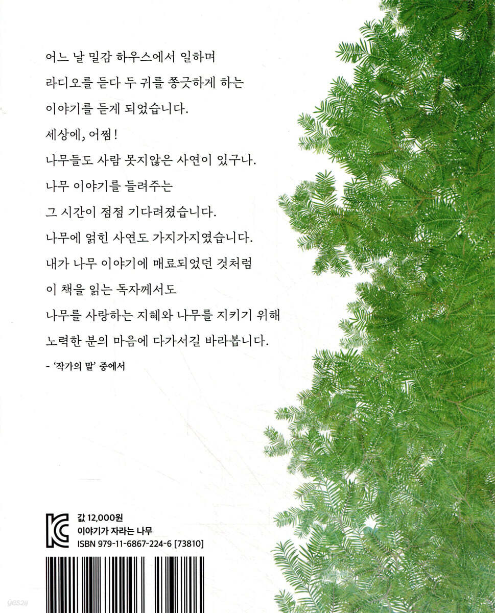 스님은 짚고 다니던 지팡이를 물이 있는 곳 가까이에 꽂았어요. 그러고 나서 이렇게 말했어요. “자신의 소원은 차고 넘칠 테니, 남을 위한 소원을 빌면 들어주는 나무가 되거라.” 스님은 유유히 자리를 떴어요. 이듬해 스님이 꽂아 둔 지팡이에서 놀랍게도 은행잎이 돋아났어요. --- p.10 ‘어쩌다 나는 사람의 목숨을 뺏는 도구가 되었을까?’ 회화나무인 나는 선비들에게 사랑받는 나무였다. 품위 있게 쭉쭉 뻗어나가는 가지의 모습이 공부하는 학자를 닮았다고 해서 ‘학자수’라고도 하고 ‘선비수’라고도 했다. 이 지역 사람들은 호야나무라고도 불렀다. 선비들마다 집에 한두 그루 심어 사랑하던 나무인데 나는 지금 ‘교수목’이 되어 사람들의 목숨을 뺏는 도구로 이용되고 있다. --- p.34 “나무를 호적에 올리신다고요?” 담당 직원은 처음 겪어보는 일이라 난처한 표정으로 고개를 설레설레 저었어요. “부탁이오. 내가 가진 논밭도 이 나무한테 물려줄 생각이오. 당연히 세금도 낼 것이고요.” “사정은 충분히 이해가 갑니다만, 나무를 호적에 올린다는 것은 저희도 처음 있는 일이라서요.” --- p.54 “오늘 네가 할머니하고 같이 갔다 온 공원이 그 당시는 들판이었단다. 그때는 아파도 치료를 못 받으니 한 집 걸러서 아이들이 죽곤 했지. 내 동생도 그곳에 묻혔단다. 어머니는 그렇게 먹고 싶어 하던 쌀밥을 먹이지 못하고 보낸 것이 한이 되어 무덤 앞에 쌀밥 같은 꽃을 피우는 이팝나무를 심었지. 임자 없는 그 들판에는 아기 무덤이 하나둘 늘어났고, 이팝나무 수도 많아졌어. 다른 사람들도 어머니를 따라 아기 무덤 앞에 이팝나무를 심는 풍습이 생겨났고 마을 사람들은 그곳을 산이 많은 벌판이라고 해서 ‘산버덕’이라고 불렀지. 세월이 흘러 조가비 같은 아기 무덤들은 비바람에 쓸리어 흔적 없이 사라지고 쌀밥 같은 꽃을 피우는 이팝나무만 남게 되었지. 이곳에 신도시가 들어서면서 공원이 만들어지게 된 거야.” --- pp.70-71 비자 열매는 제사상에도 올렸다고 했었지? 누군가가 산신제를 지내고 나서 이곳에 비자 열매를 뿌렸나 봐. 그 열매가 싹이 터서 자란 나무가 이 조상나무가 된 거지. 조상나무가 크게 자라고부터 마을 사람들은 이 나무를 당산나무로 정해서 매년 나무 앞에서 제사를 지냈대. 제사 지내고 나서 비자를 주변에 뿌리곤 했지. 그 뿌린 비자에서 또 싹이 나서 자라고. 그렇게 오랜 세월 하다 보니 비자나무 군락지가 만들어진 거래. 이곳 비자나무 군락지는 널리 알려져 유명해졌어. --- p.103 |